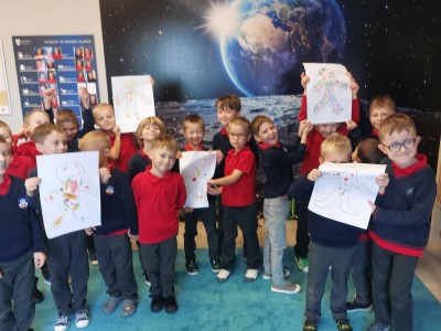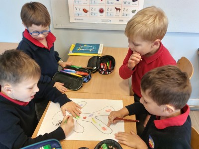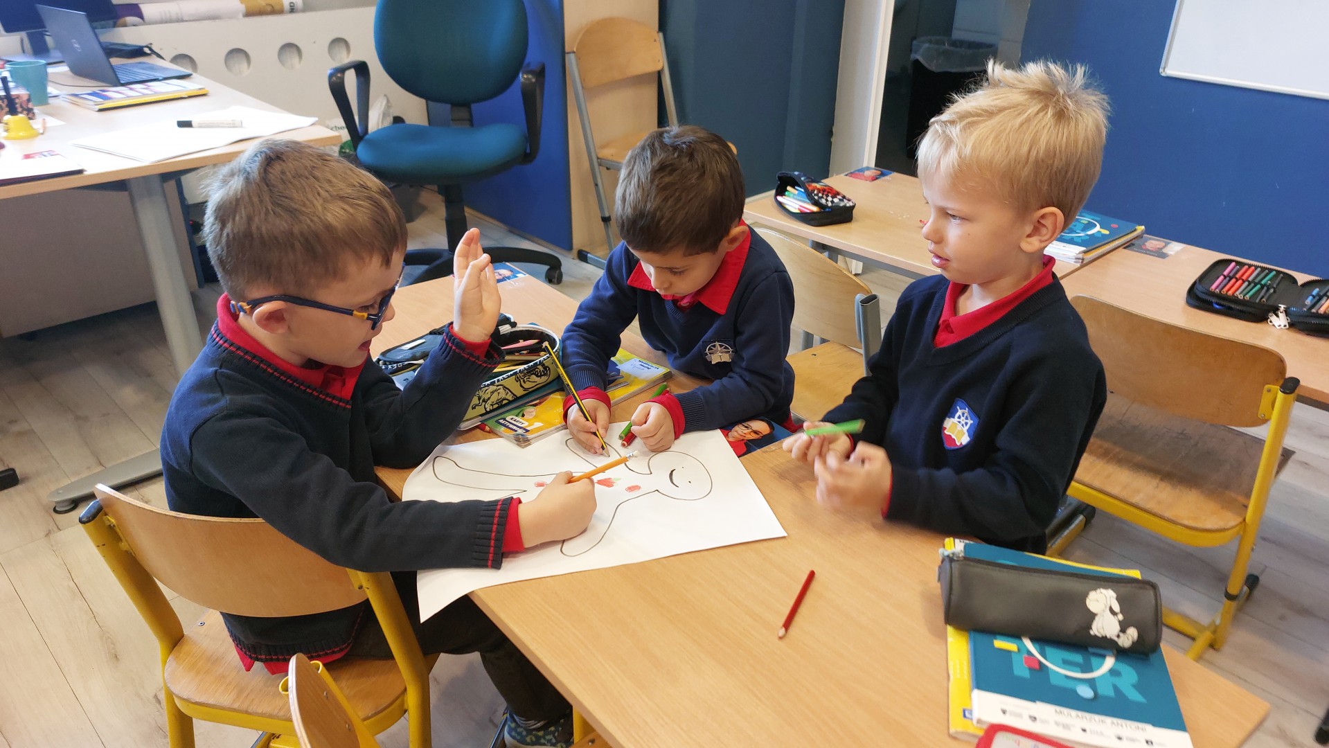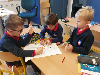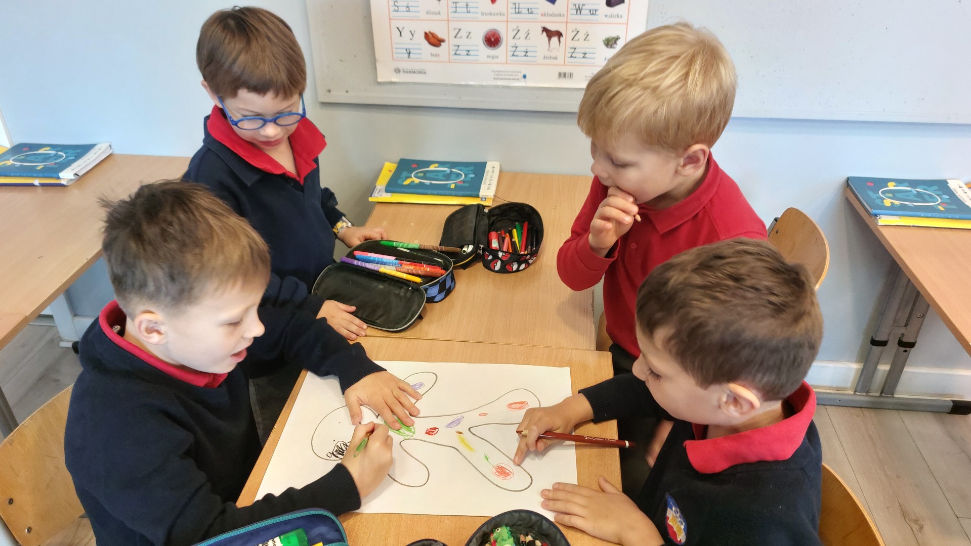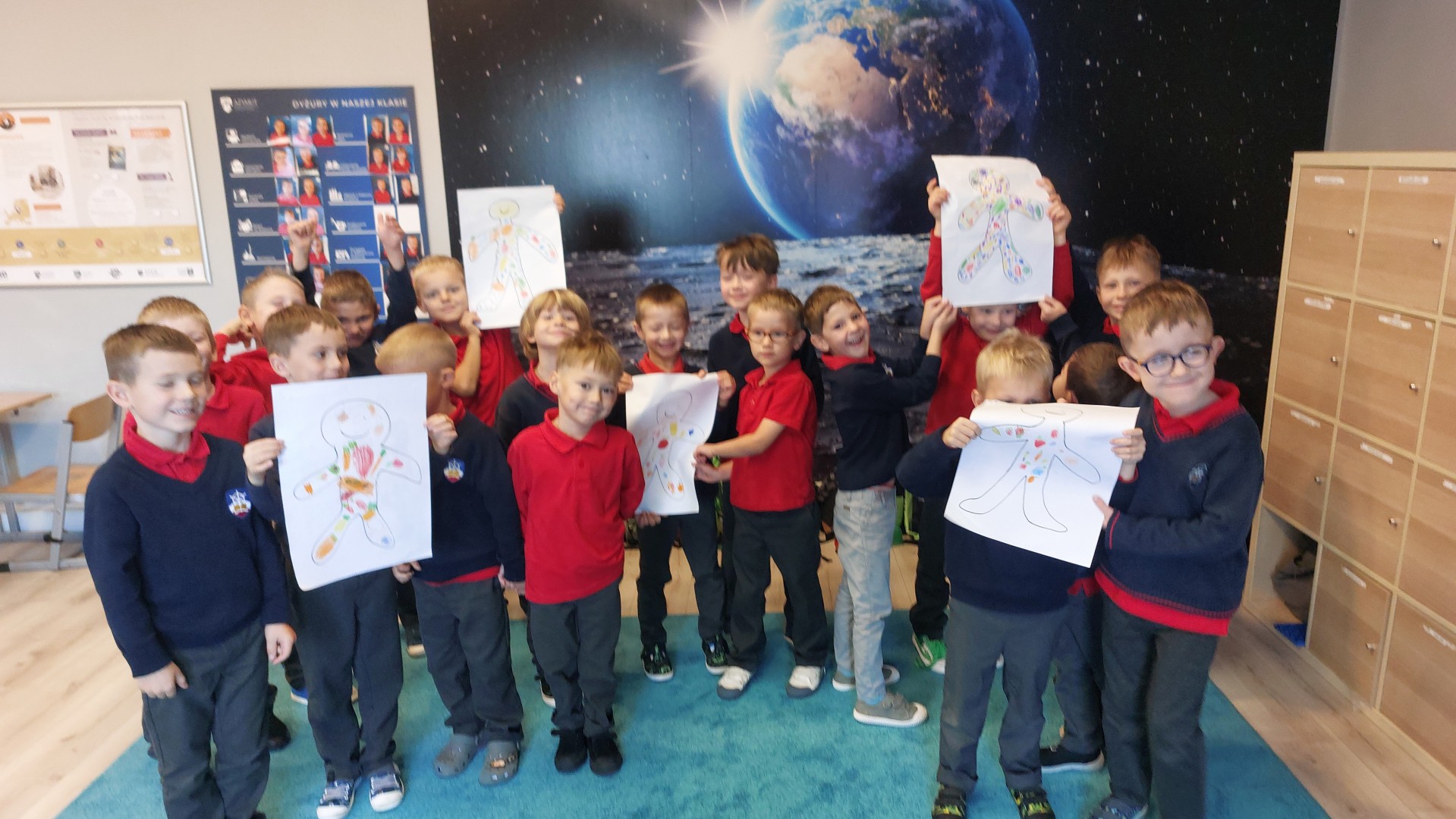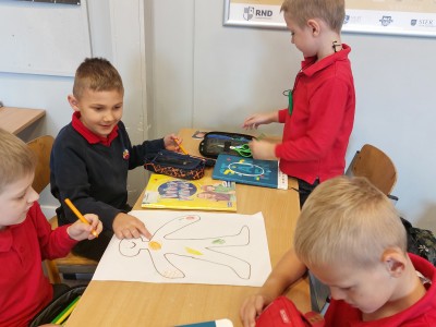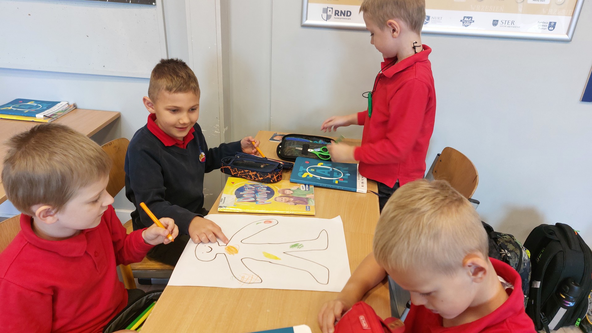 Rozmawialiśmy o tym, jakie warzywa i owoce w niej wystąpiły, oraz jakie sporty uprawiają. Następnie w czteroosobowych grupach uczniowie rysowali warzywa i owoce w brzuszkach (i nie tylko, jeśli się nie mieściły to także w nogach, rękach i głowach) sylwetek ludzi na kartce. Oby poznana wiedza przełożyła się na zawartość śniadaniówek.