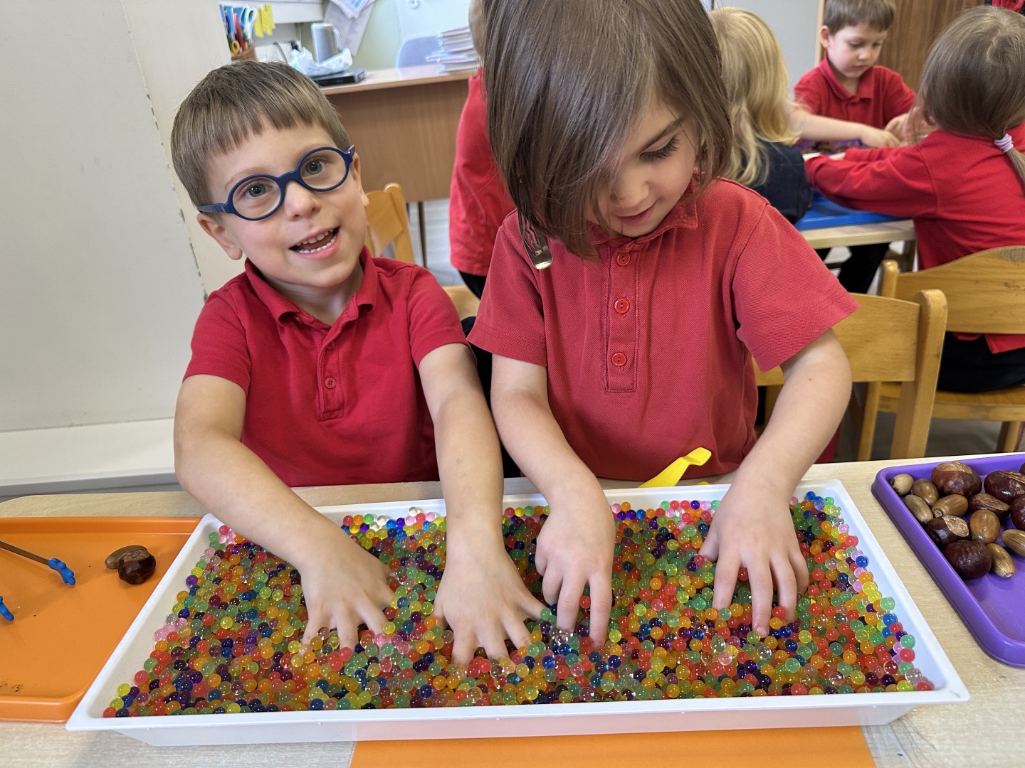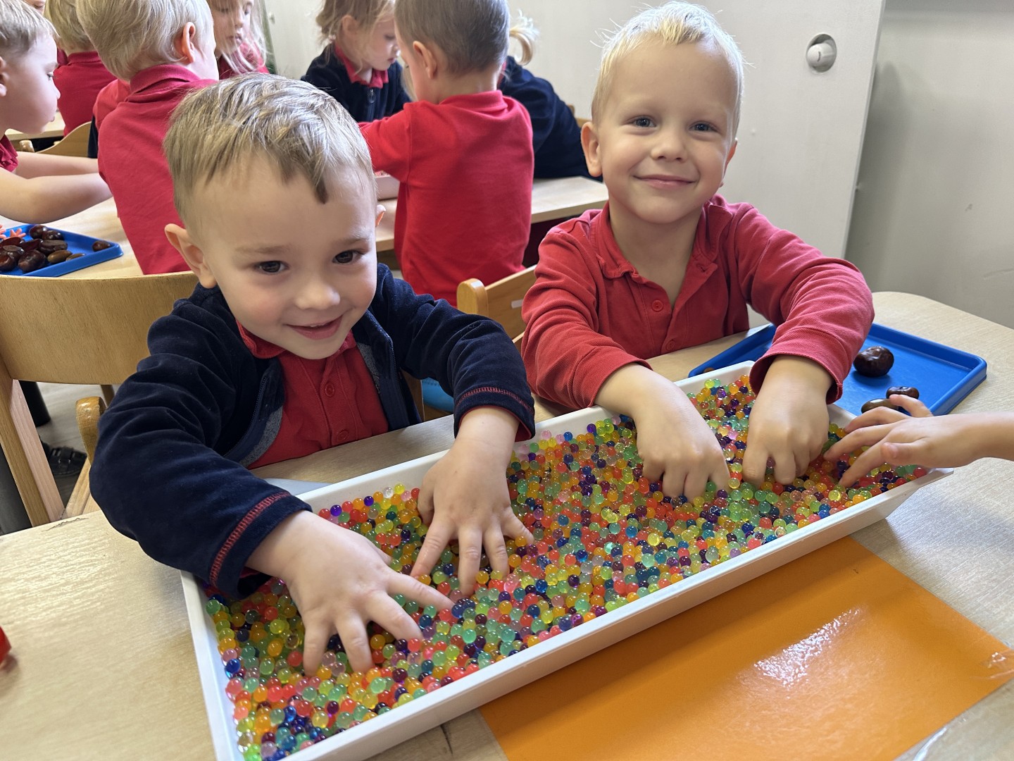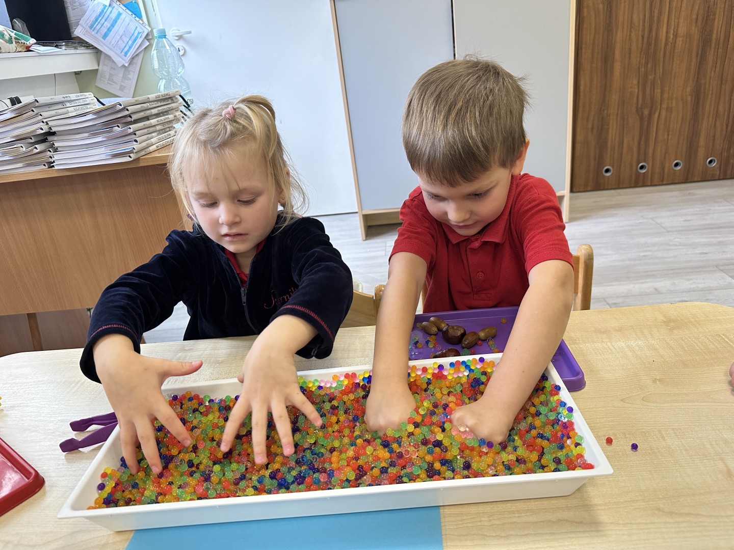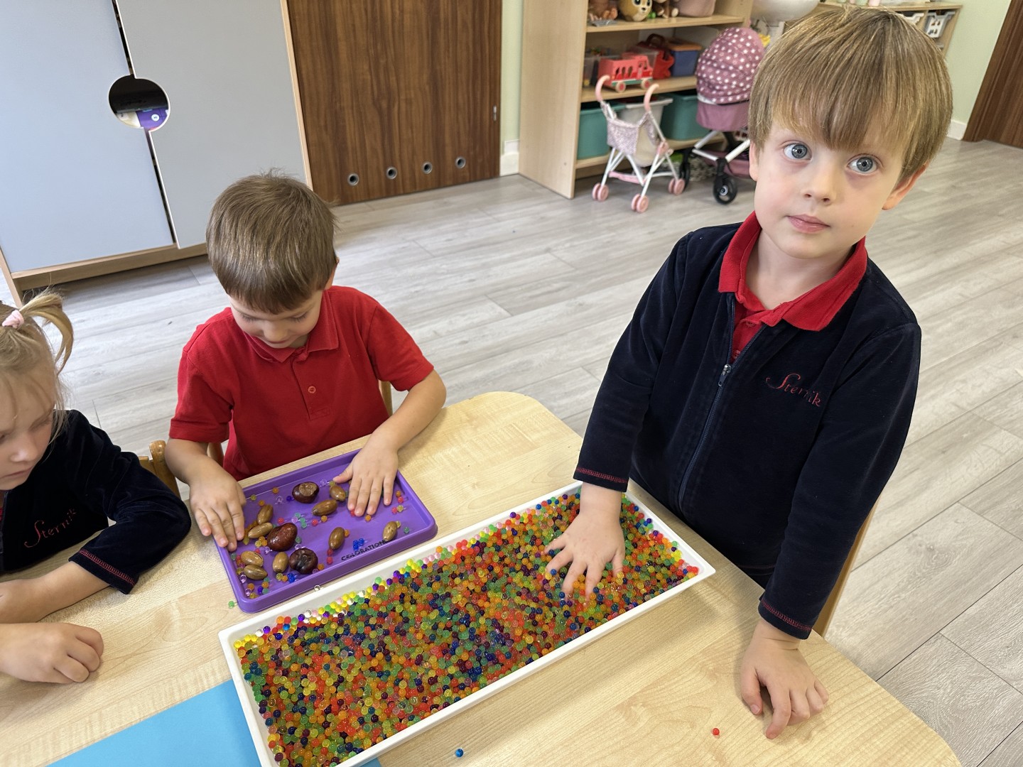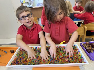 Podczas dzisiejszych zajęć sensoplastycznych dzieci odkrywały uroki jesieni.