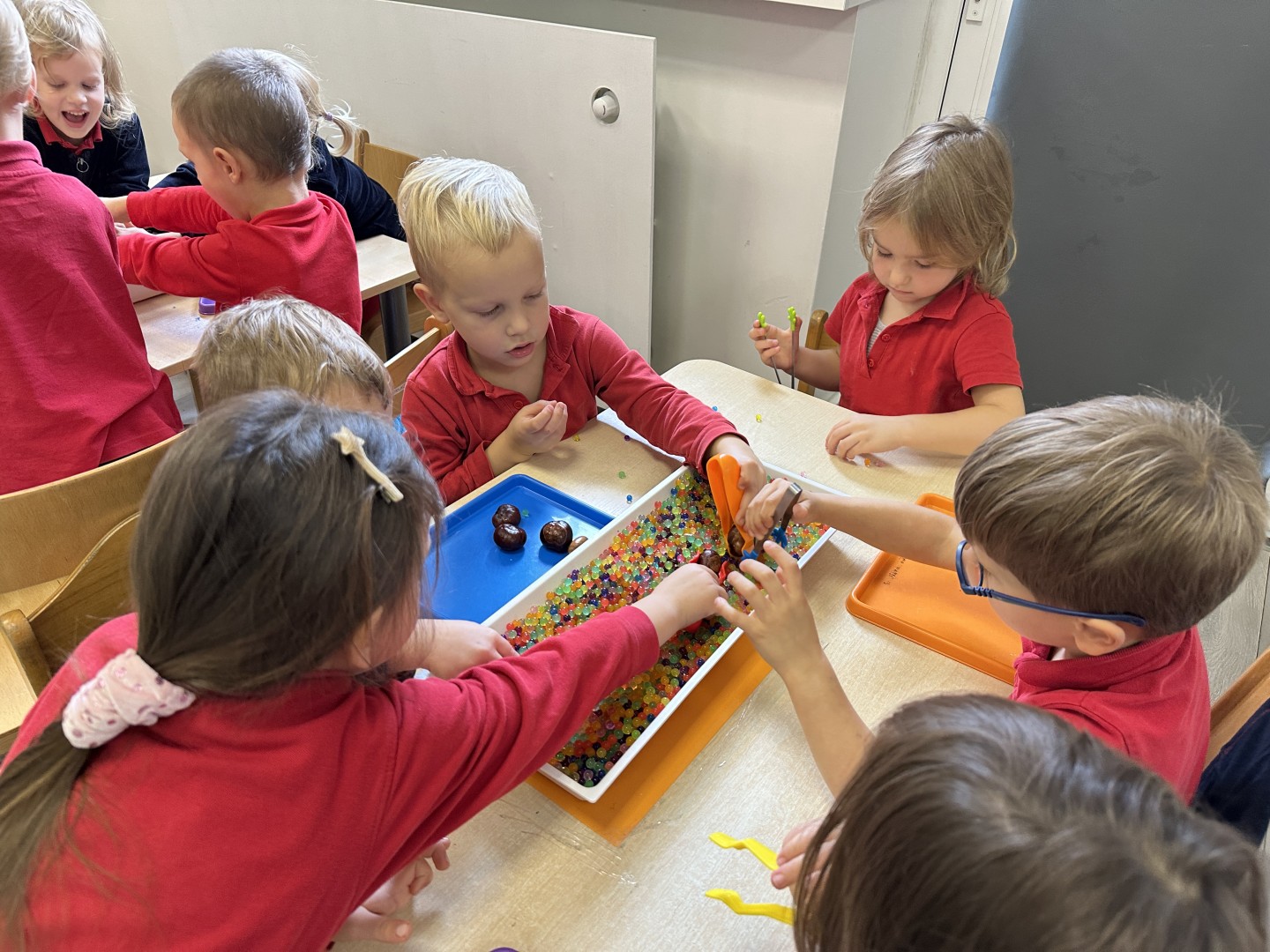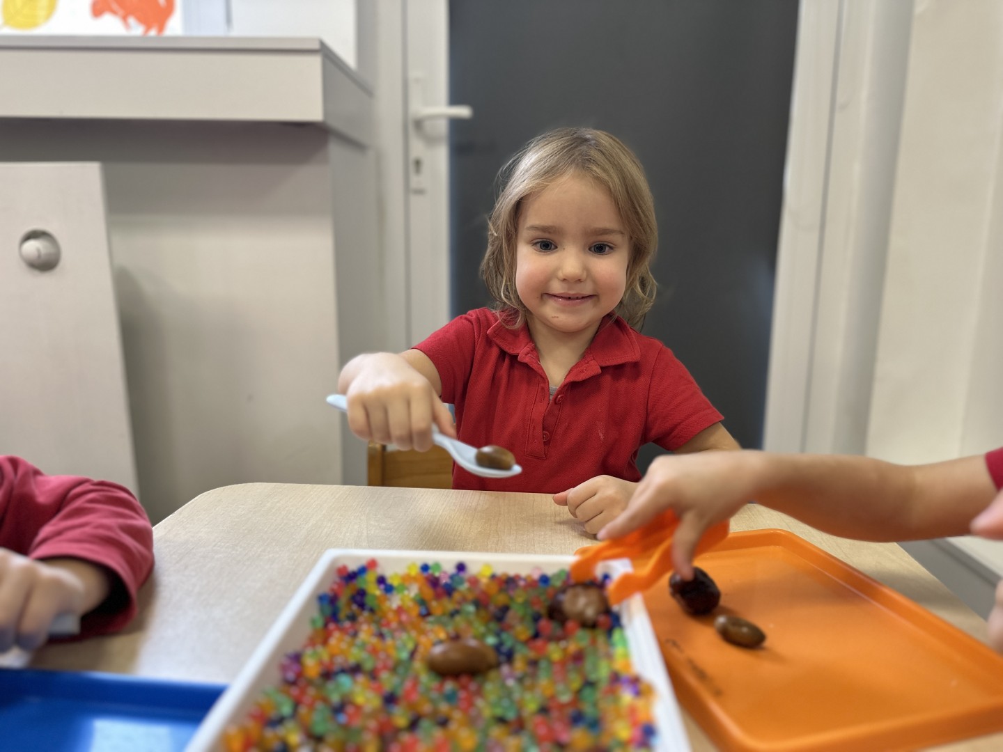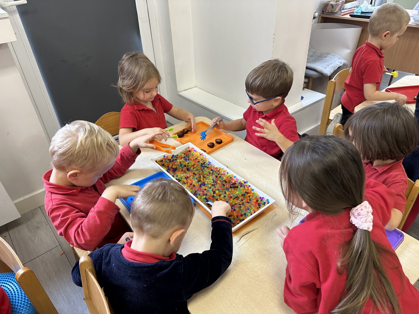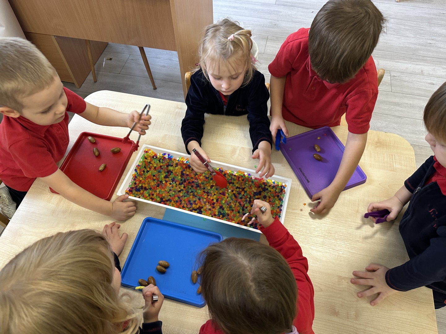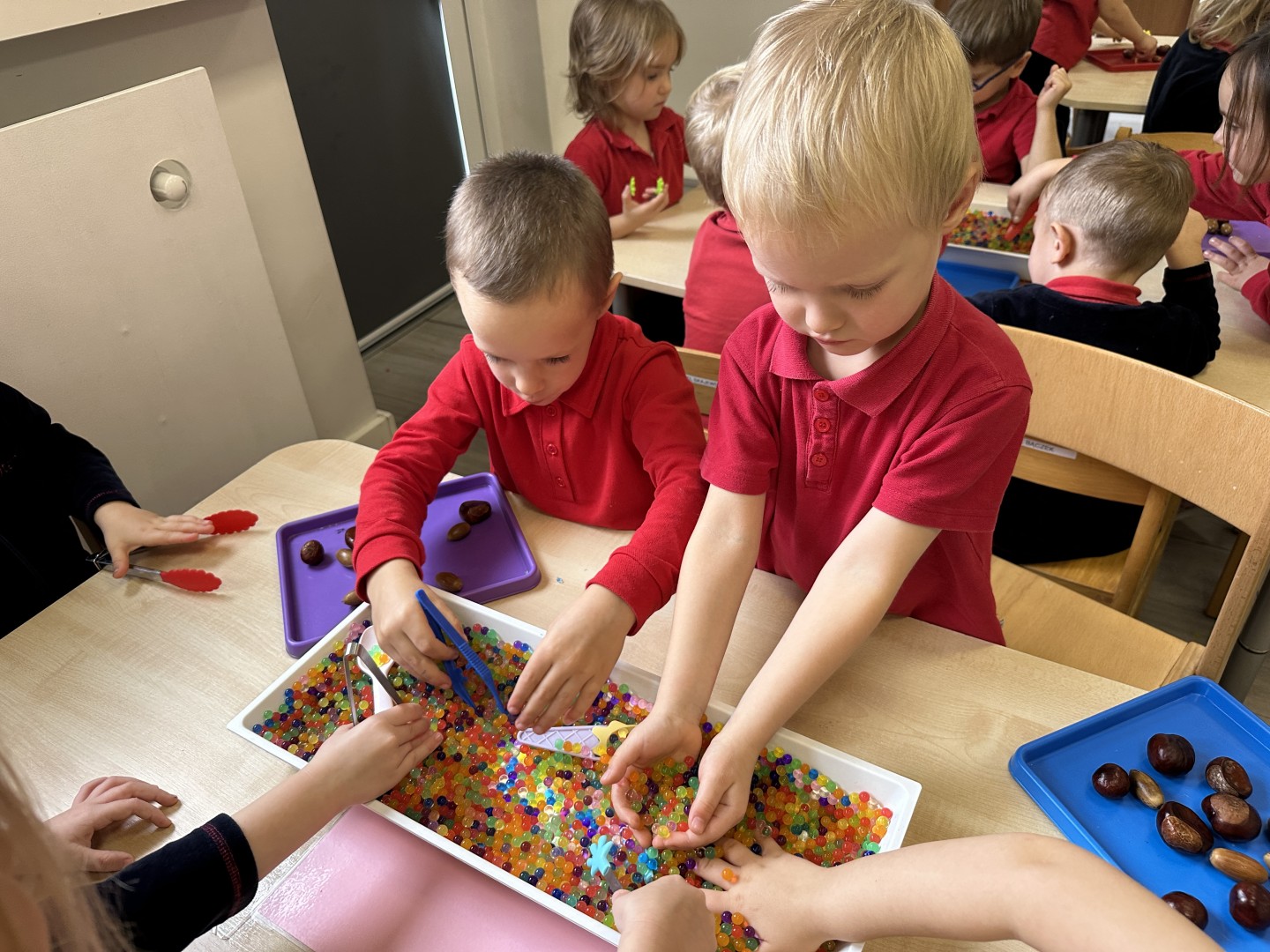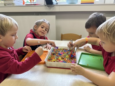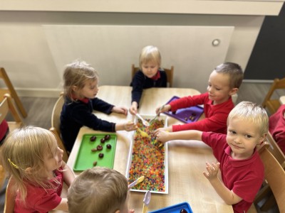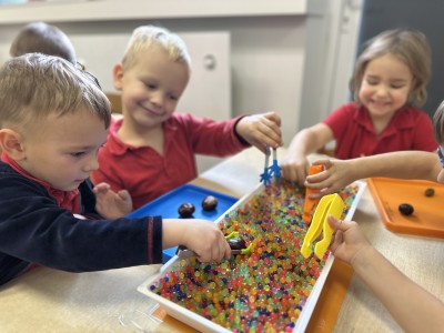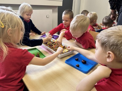Za pomocą szczypców i łyżek łowiły dary natury - żołędzie i kasztany, rozwijając przy tym motorykę małą, koordynację wzrokowo-ruchową oraz cierpliwość. Zabawa dostarczyła mnóstwo radości i satysfakcji.