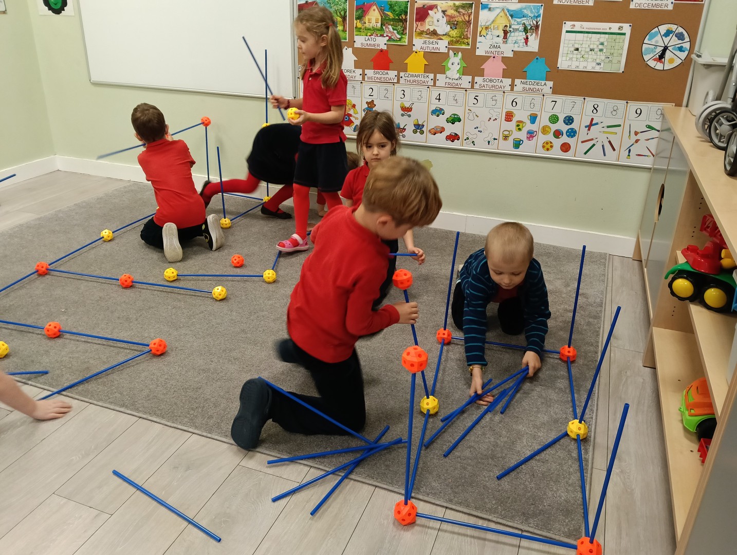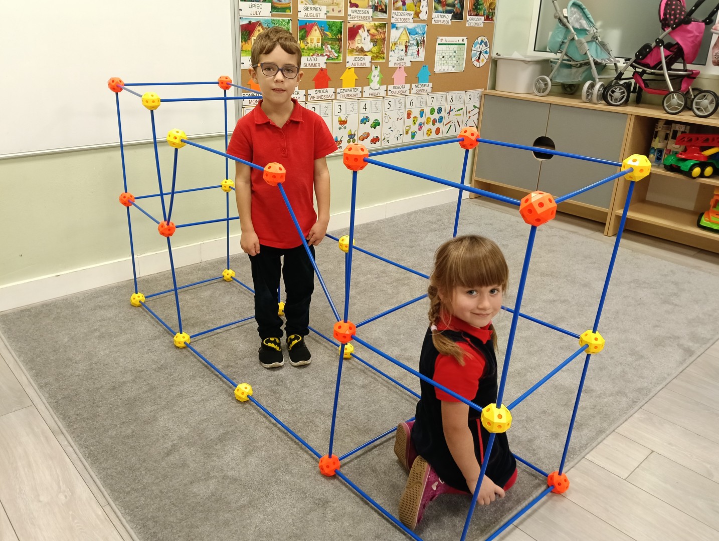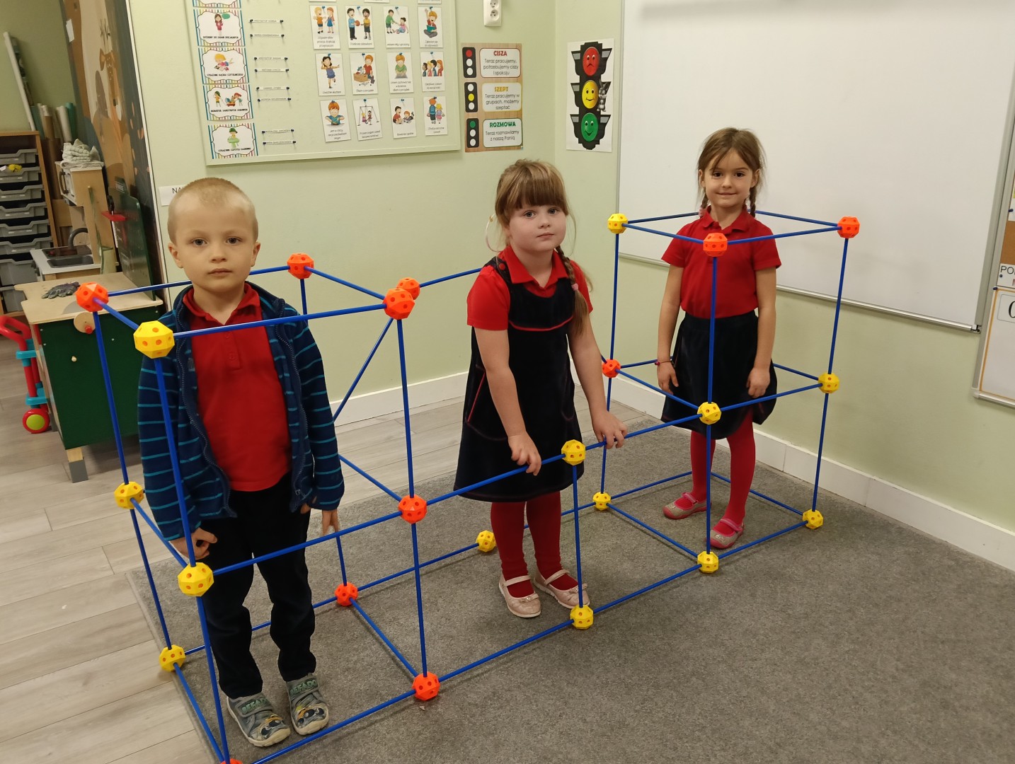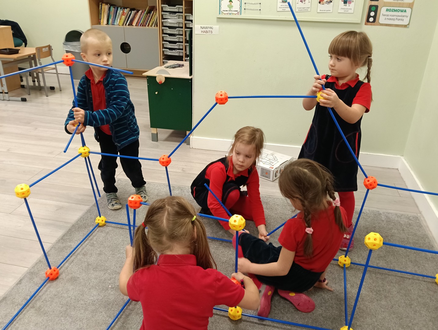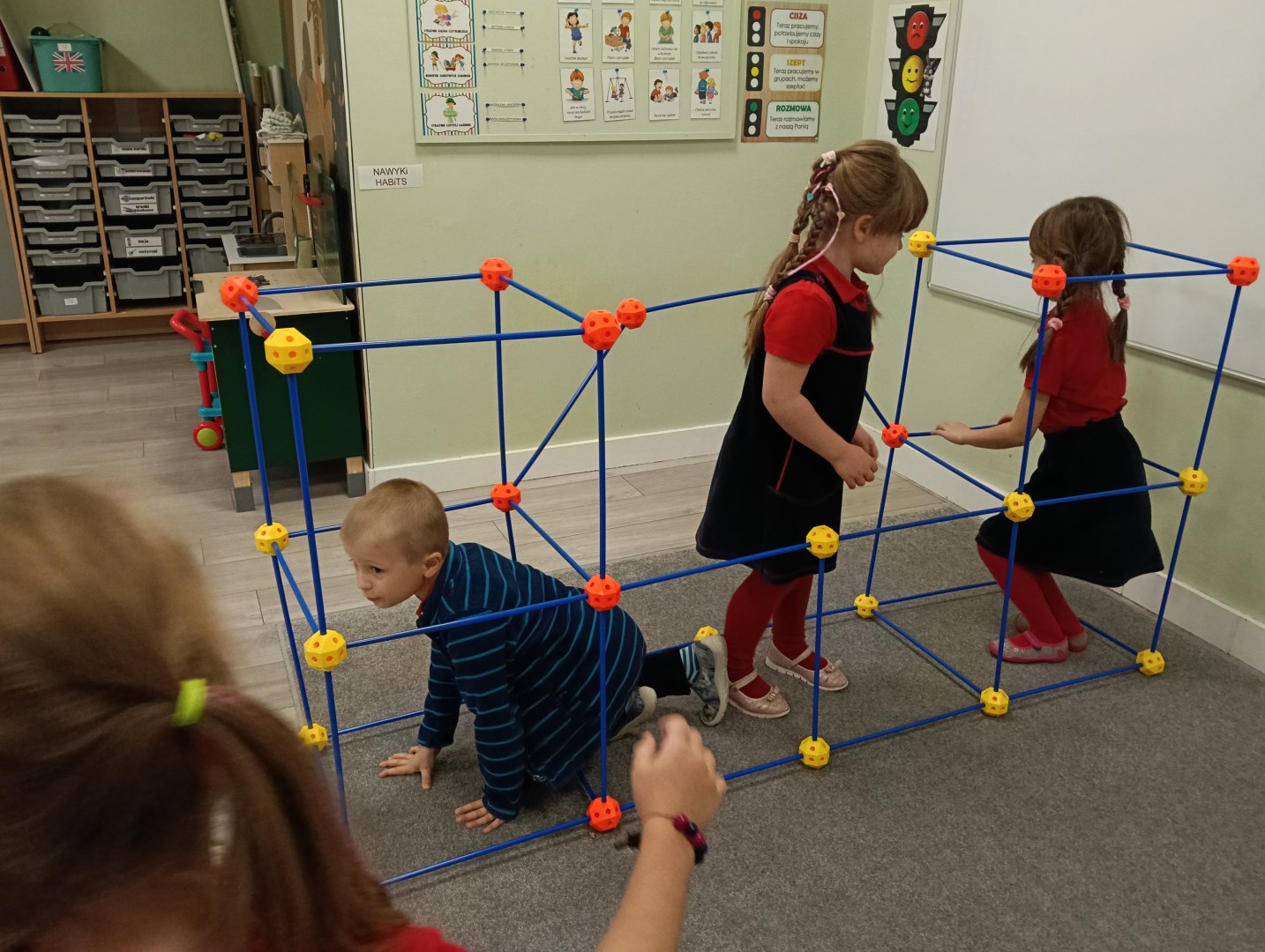 Dzieci z radością spędzają czas w sali, układając kolorowe układanki „grzybki” oraz tworząc różnorodne budowle z dostępnych klocków i elementów konstrukcyjnych. Podczas wspólnej zabawy przedszkolaki ćwiczą koncentrację, rozwijają małą motorykę, wyobraźnię oraz koordynację wzrokowo–ruchową. Wspólne tworzenie sprzyja również nauce współpracy i dzieleniu się pomysłami. Nawet gdy za oknem pada deszcz, w naszej sali panuje ciepła, twórcza i radosna atmosfera!