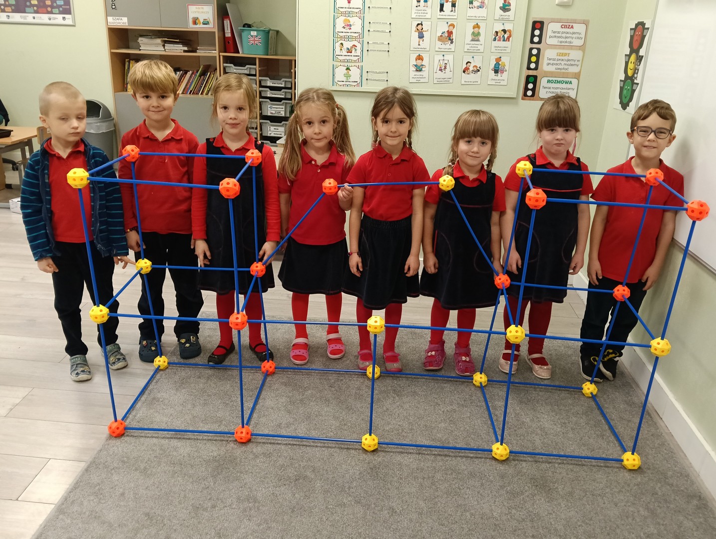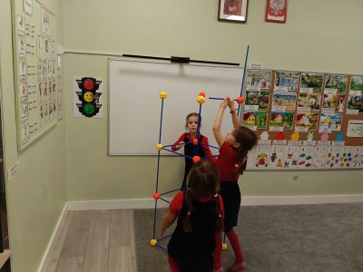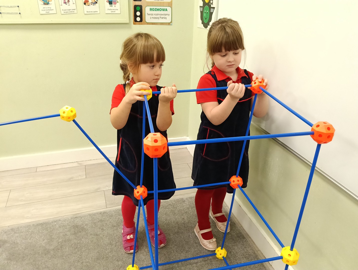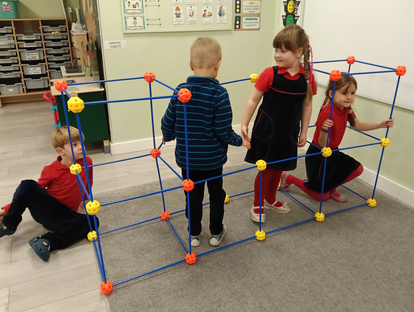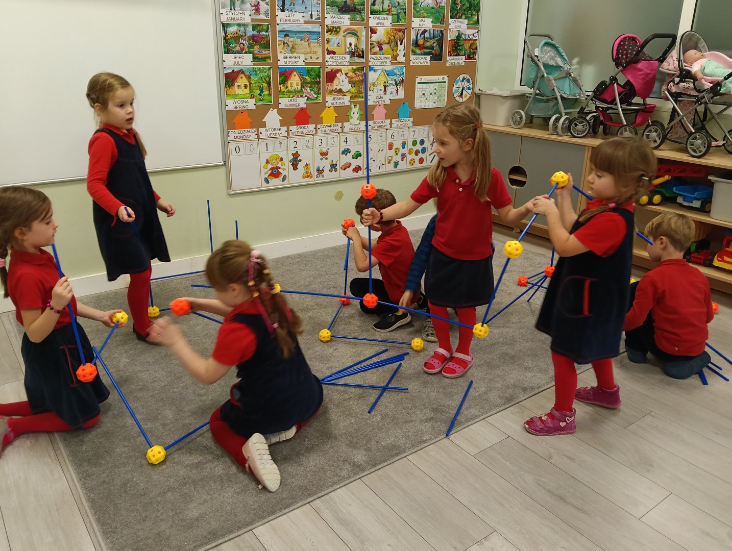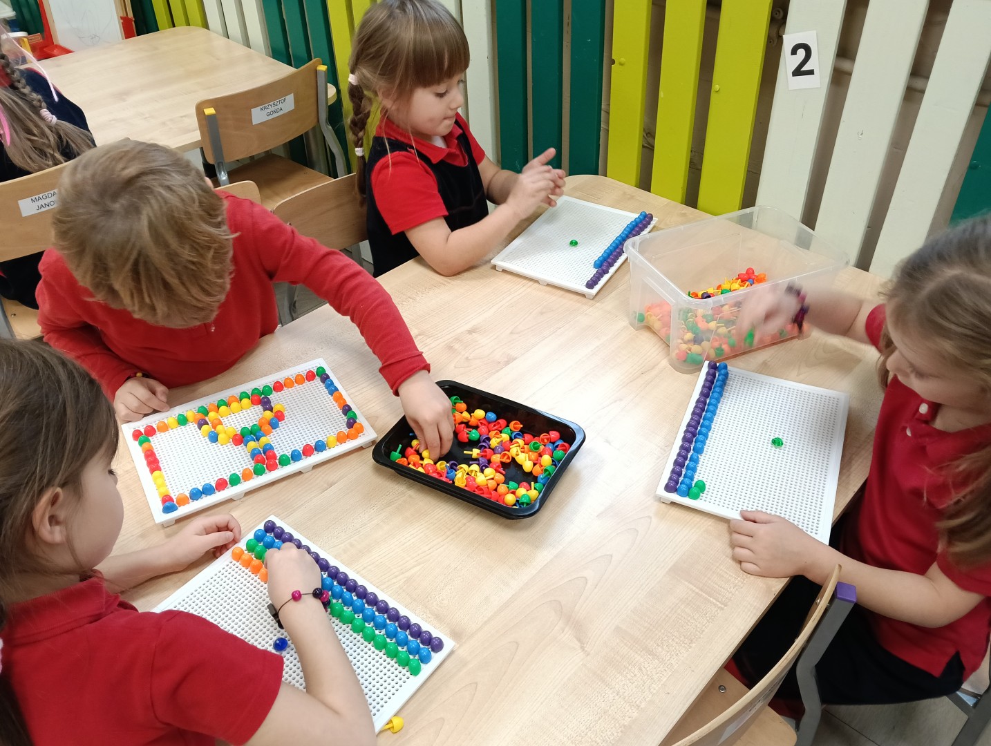 Dzieci z radością spędzają czas w sali, układając kolorowe układanki „grzybki” oraz tworząc różnorodne budowle z dostępnych klocków i elementów konstrukcyjnych. Podczas wspólnej zabawy przedszkolaki ćwiczą koncentrację, rozwijają małą motorykę, wyobraźnię oraz koordynację wzrokowo–ruchową. Wspólne tworzenie sprzyja również nauce współpracy i dzieleniu się pomysłami. Nawet gdy za oknem pada deszcz, w naszej sali panuje ciepła, twórcza i radosna atmosfera!