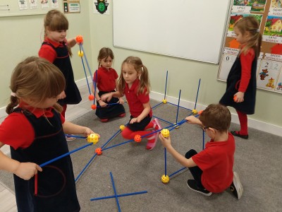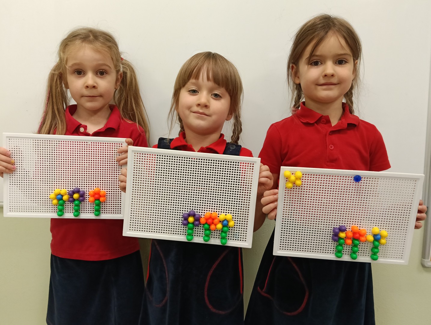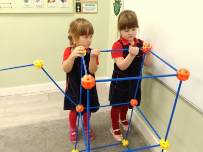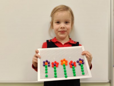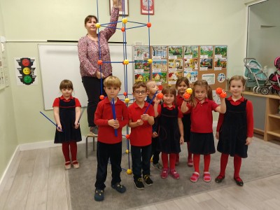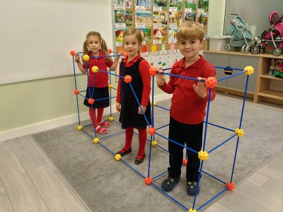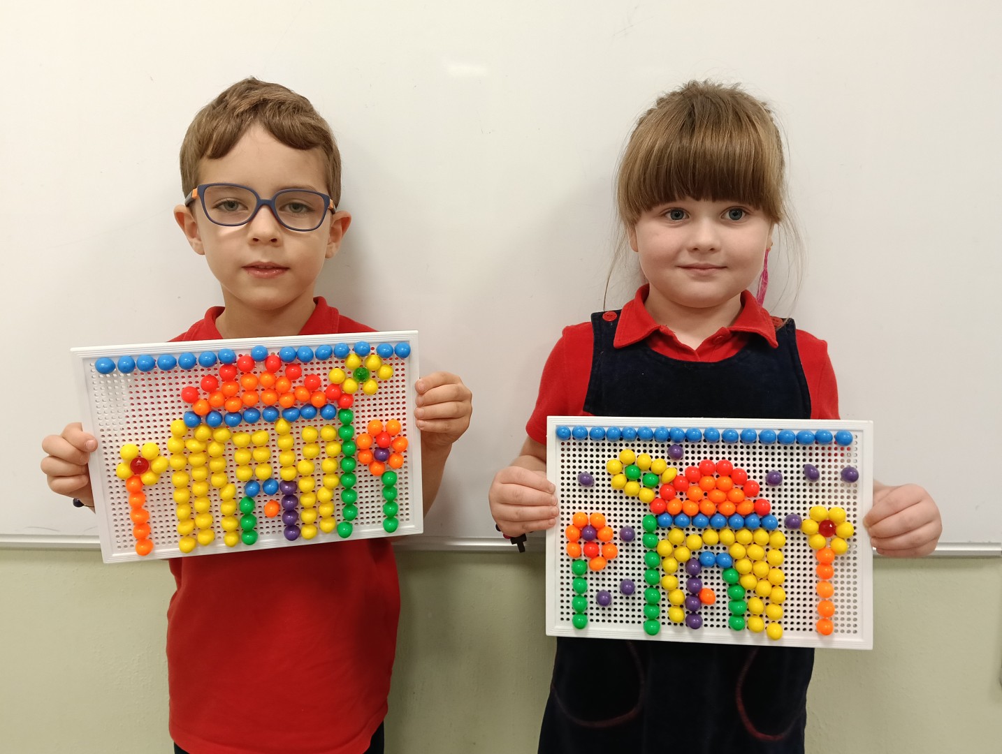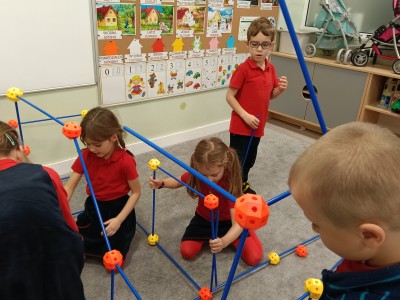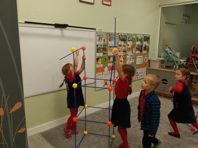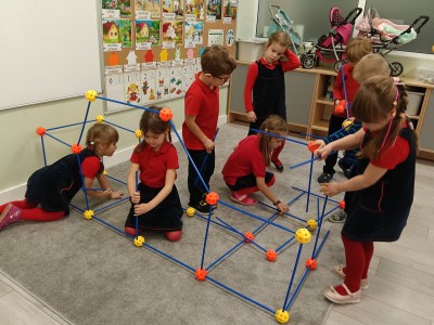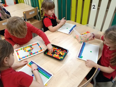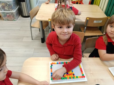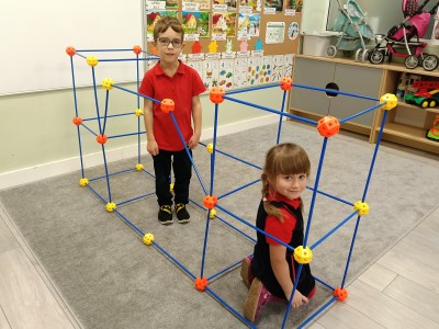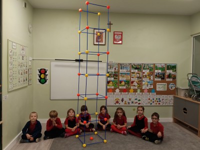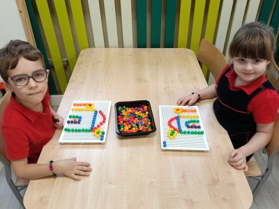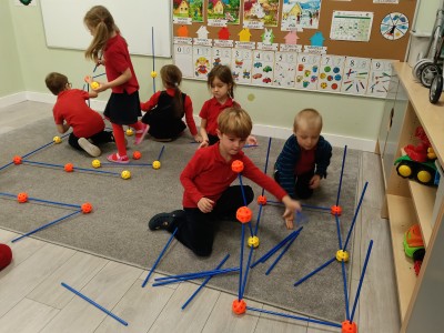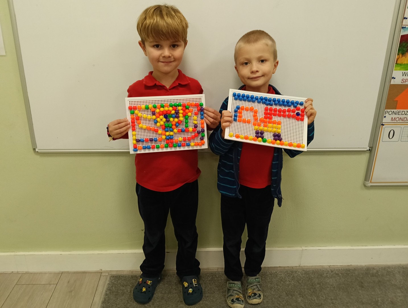 Dzieci z radością spędzają czas w sali, układając kolorowe układanki „grzybki” oraz tworząc różnorodne budowle z dostępnych klocków i elementów konstrukcyjnych. Podczas wspólnej zabawy przedszkolaki ćwiczą koncentrację, rozwijają małą motorykę, wyobraźnię oraz koordynację wzrokowo–ruchową. Wspólne tworzenie sprzyja również nauce współpracy i dzieleniu się pomysłami. Nawet gdy za oknem pada deszcz, w naszej sali panuje ciepła, twórcza i radosna atmosfera!