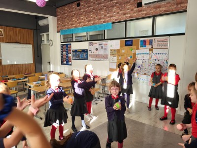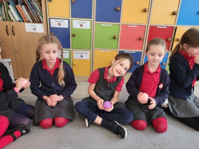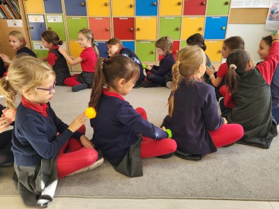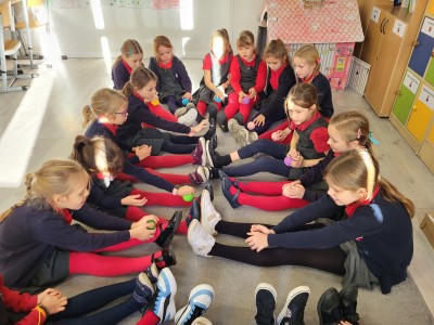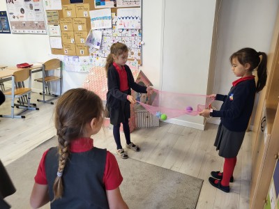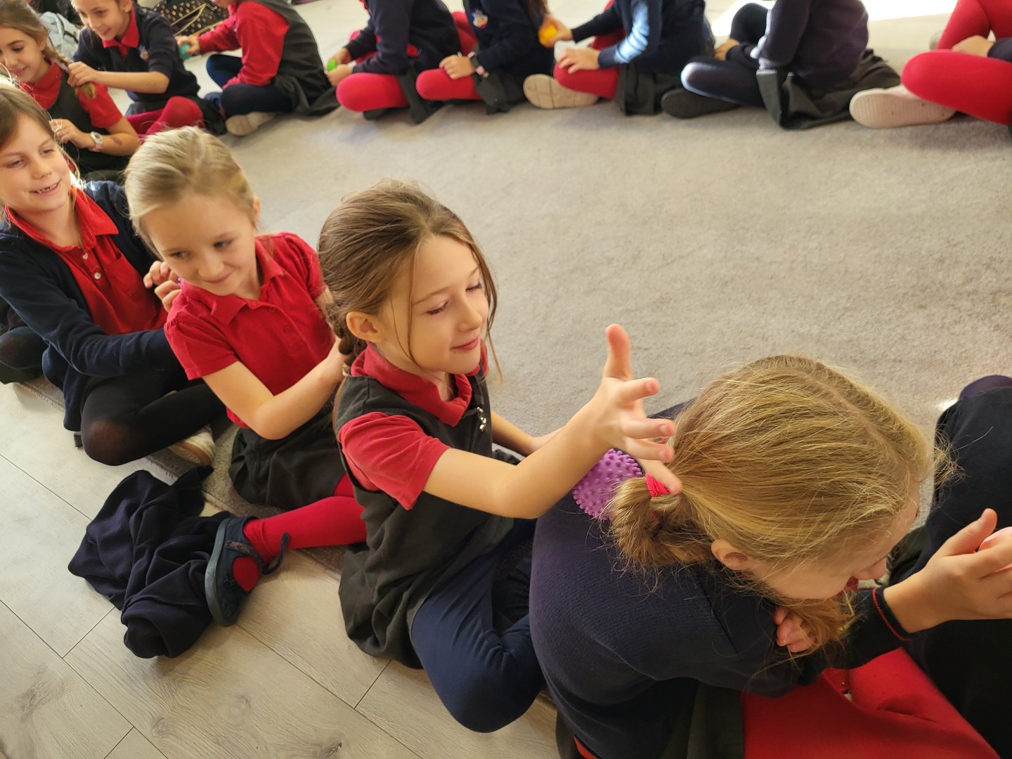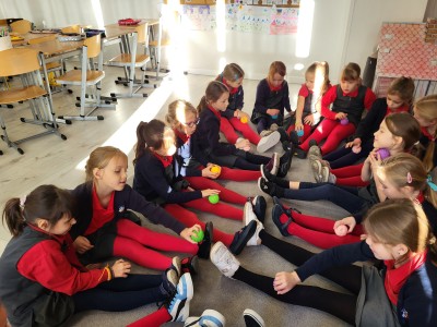 Piłki mają różne faktury i kolory; niektóre są bardzo miękkie, inne trochę twardsze. Ich głównym zadaniem będzie rozgrzewanie dłoni dziewczynek przed ćwiczeniami w pisaniu. Dzisiaj jednak zastosowanie piłek było szersze: liczenie, klasyfikacja, porównywanie zbiorów, przypomnienie istoty dodawania, masaż całego ciała, rzut do celu, uwalnianie pozytywnej energii.