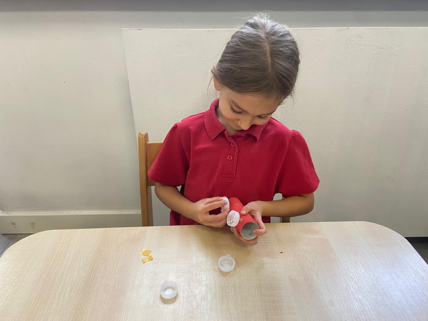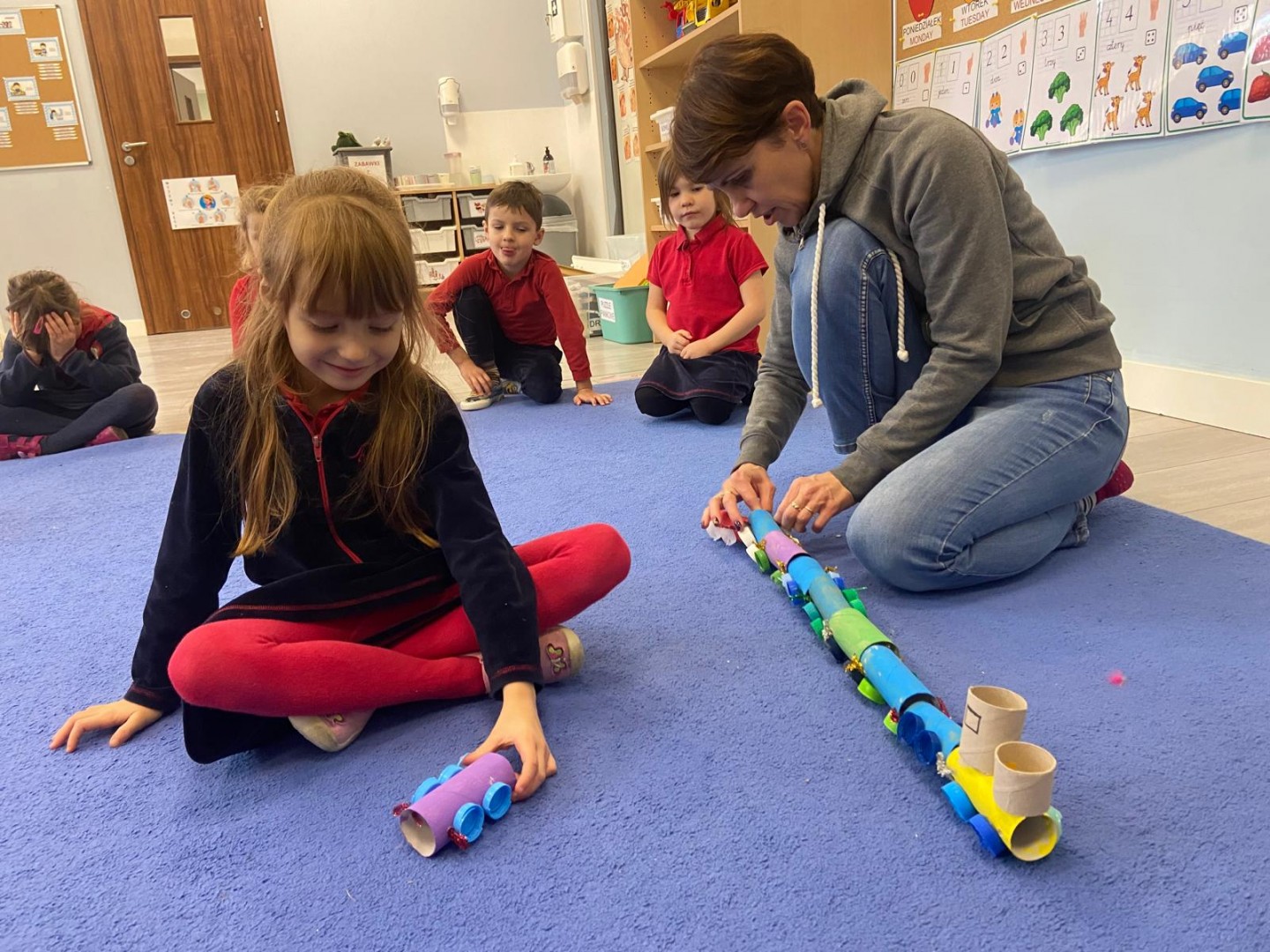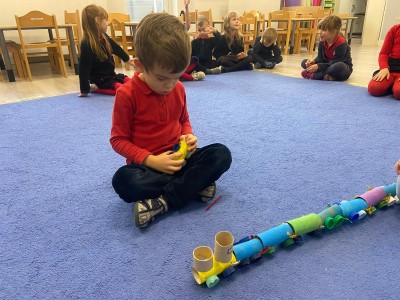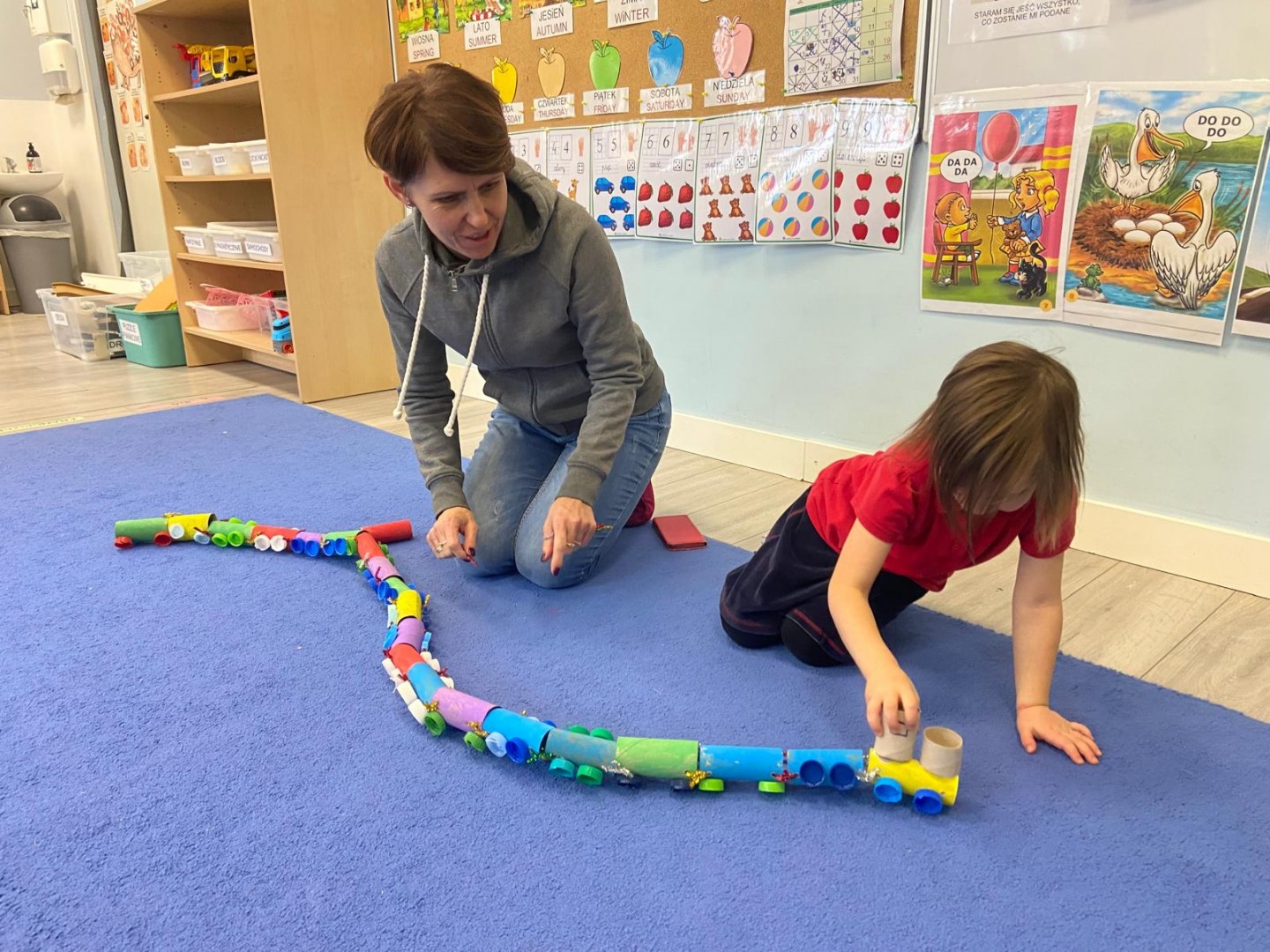 Na zakończenie zajęć wspólnie wykonaliśmy pociąg z rolek po papierze i nakrętek – to była świetna zabawa i doskonały przykład na to, że z pozornie niepotrzebnych rzeczy można stworzyć coś ciekawego!