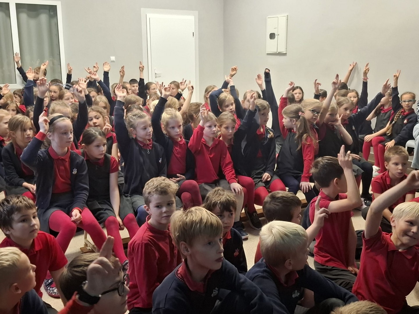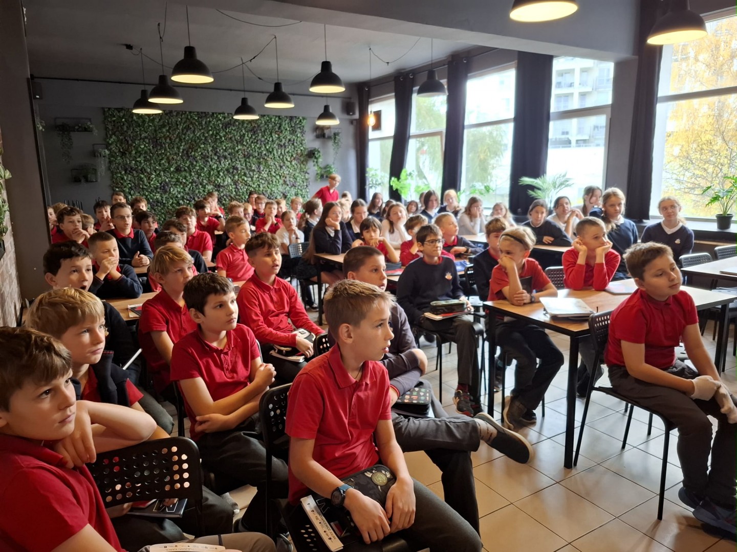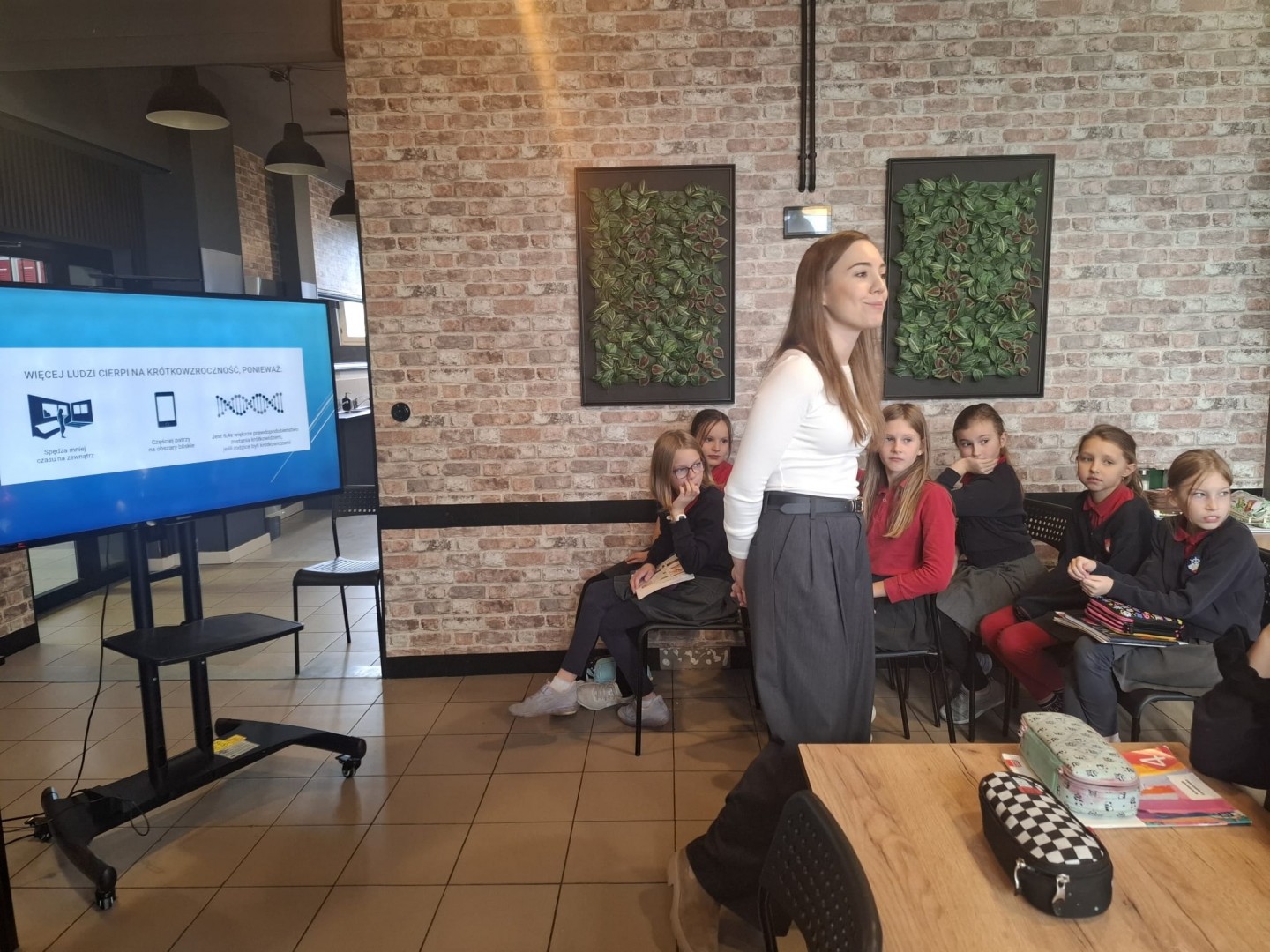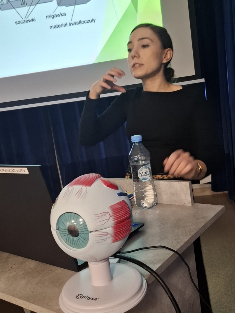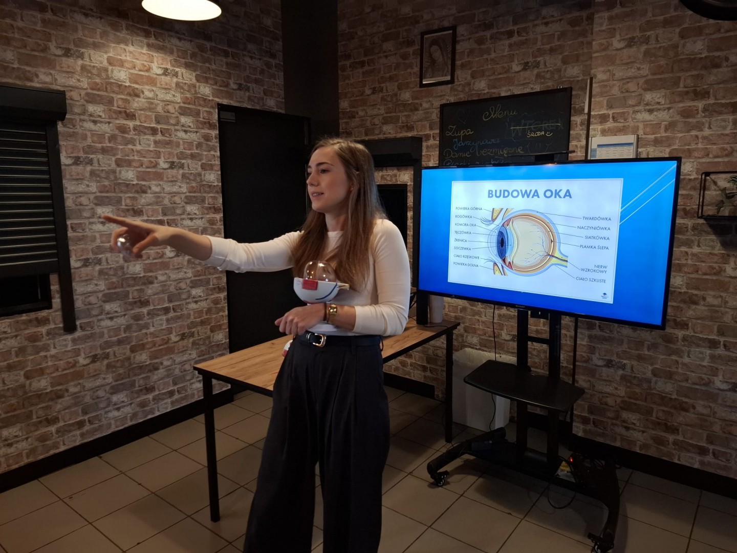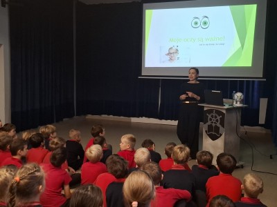 Pani Anna spotkała się z każdą klasą, by przybliżyć uczniom znaczenie zmysłu wzroku w codziennym życiu. W sposób przystępny wyjaśniła, jak w naszym oku powstaje obraz oraz jakie czynniki wpływają na jego prawidłowe tworzenie się. Szczególną uwagę poświęcono elementom higieny wzrokowej, omówiono wpływ ekranów na nasze oczy, a także przedstawiono ćwiczenia, które pomagają utrzymać zdrowie naszych oczu na najwyższym poziomie. Spotkania te były nie tylko pouczające, ale także inspirujące, zachęcając uczniów do dbania o swój wzrok.