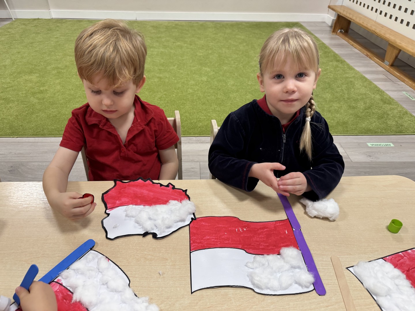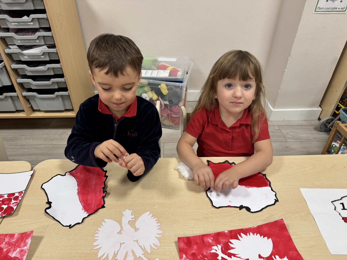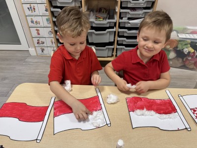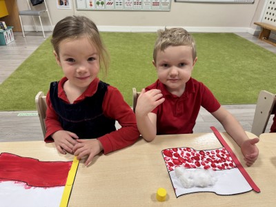 Dzieci wykonały również piękne prace plastyczne, wyklejając flagę i godło Polski, które ozdobiły salę przedszkolną.