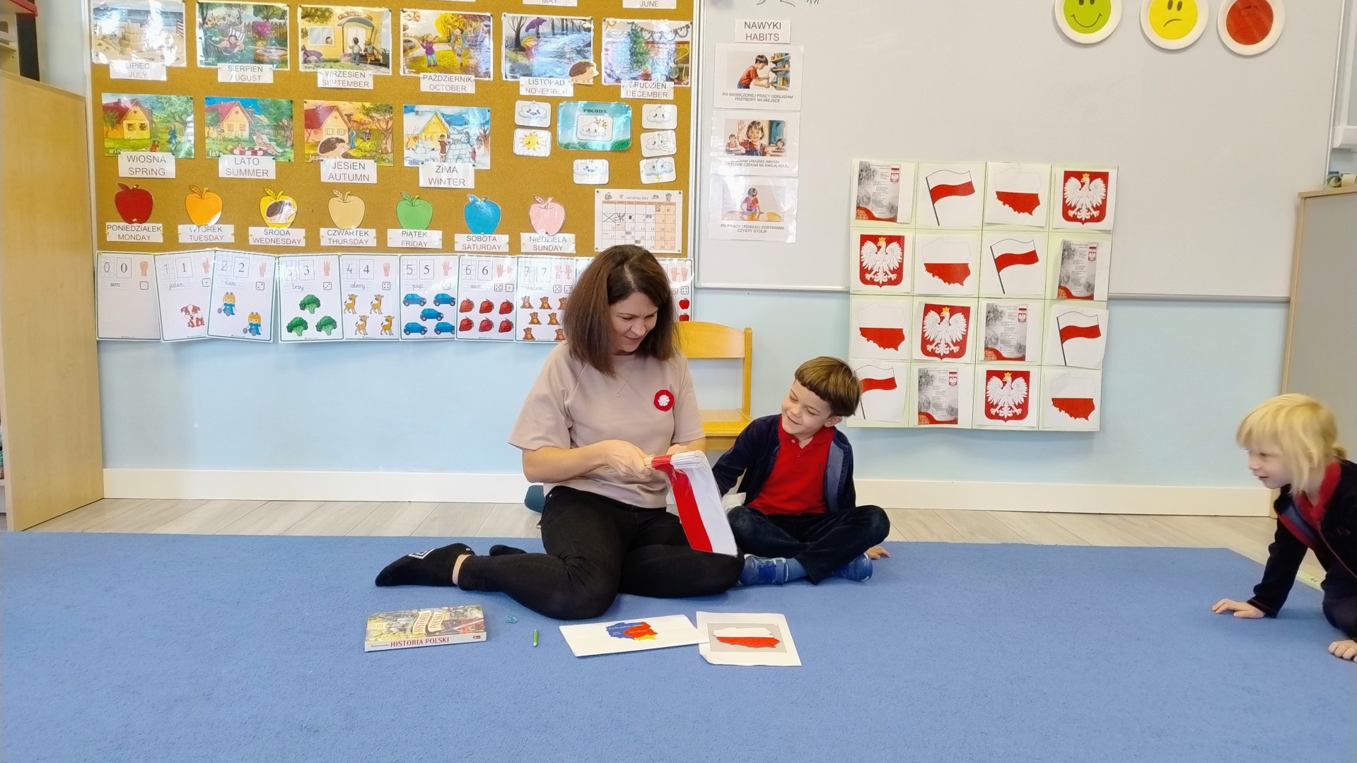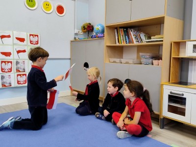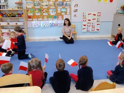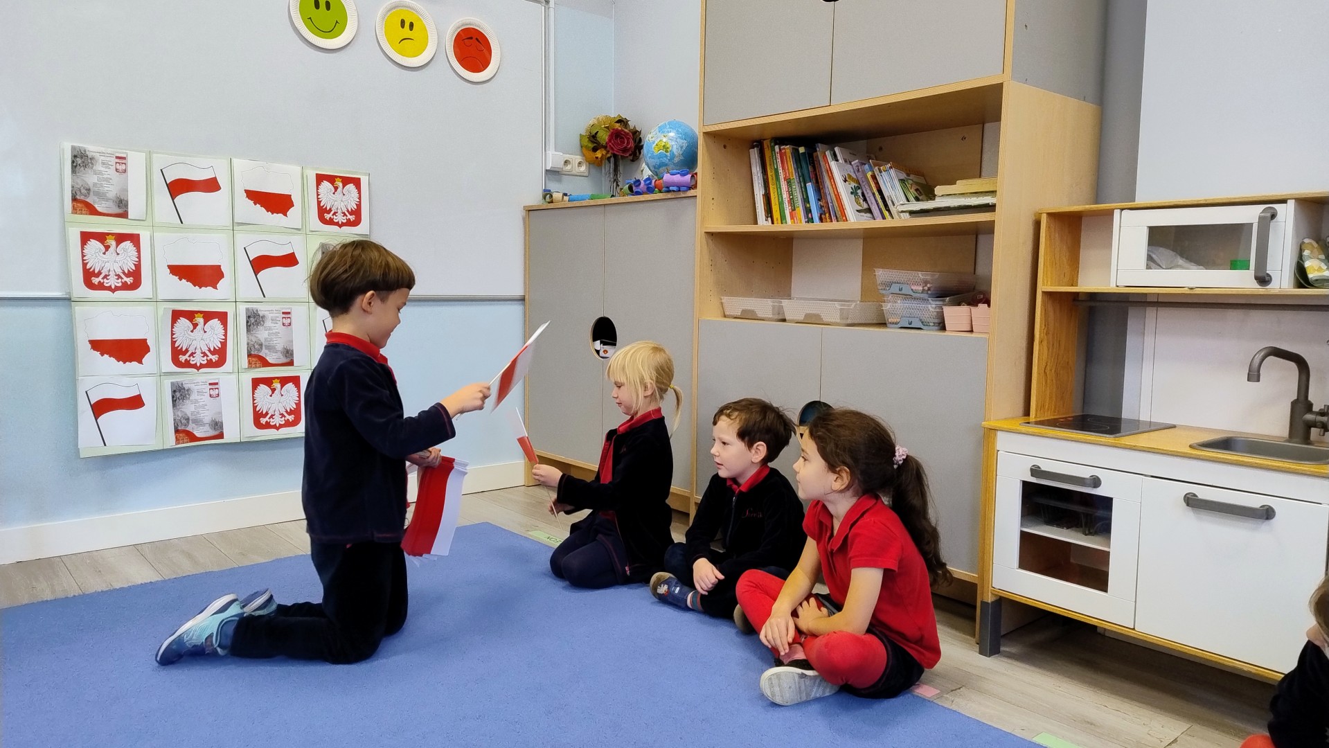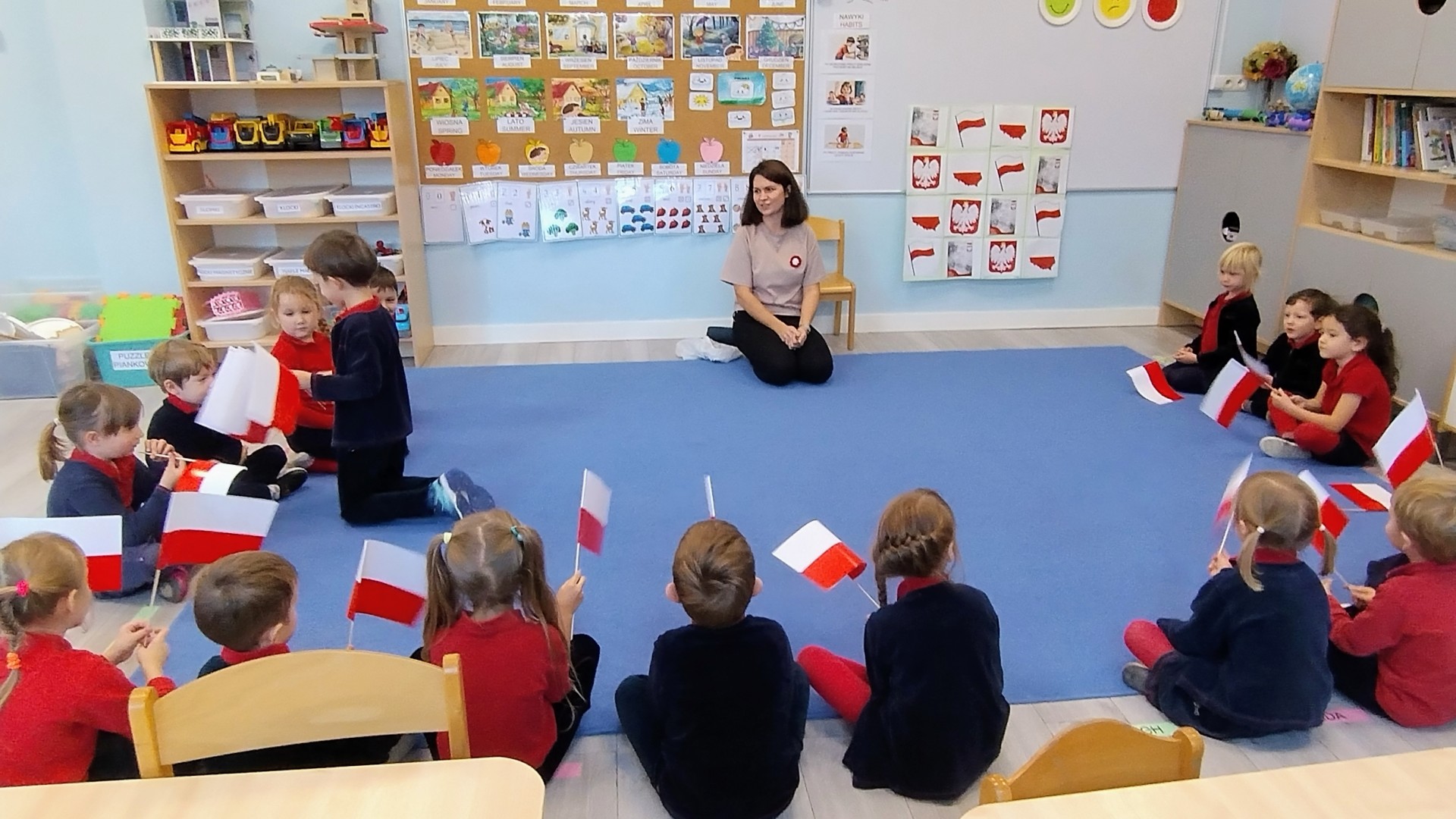 Podczas spotkania dzieci rozwiązywały zagadki, wspólnie odśpiewały hymn narodowy, a na zakończenie każdy przedszkolak otrzymał flagę, z którą będzie mógł wziąć udział w obchodach Święta Niepodległości.