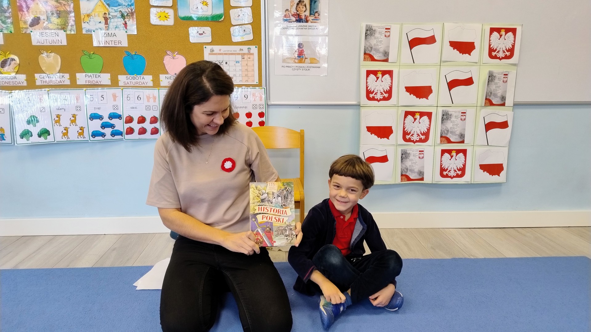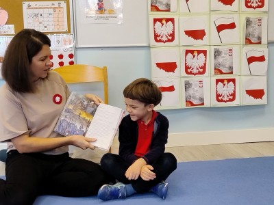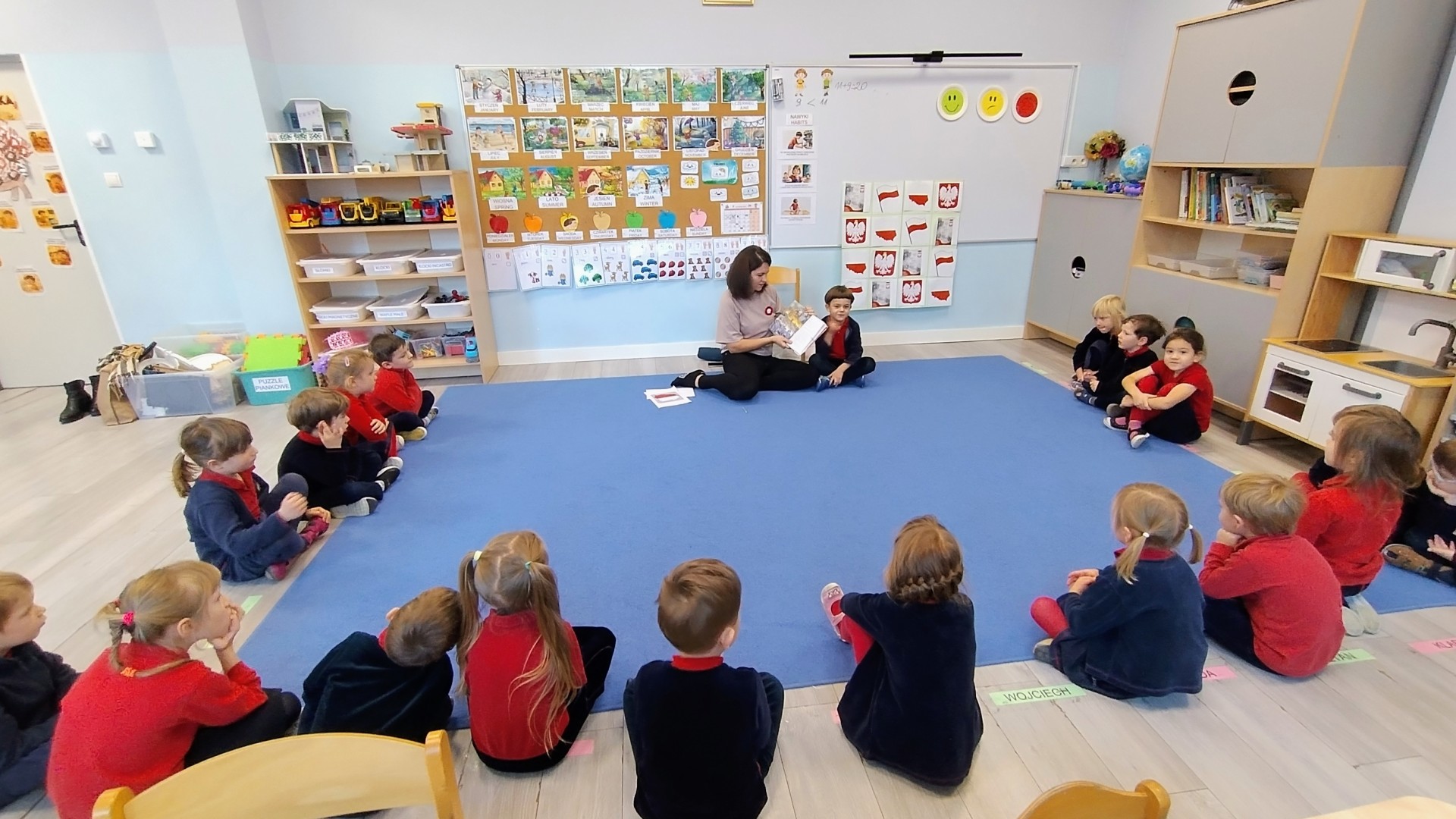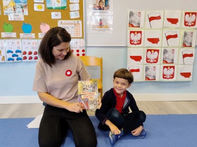 Nasze przedszkole odwiedziła pani Ula Guzewska, mama Juliana. Przyniosła ze sobą bardzo ciekawą książkę „115 barwnych opowieści o dziejach Polski”. Przeczytała nam jedną z historii, która opowiadała o tym, jak Polacy walczyli o niepodległość.