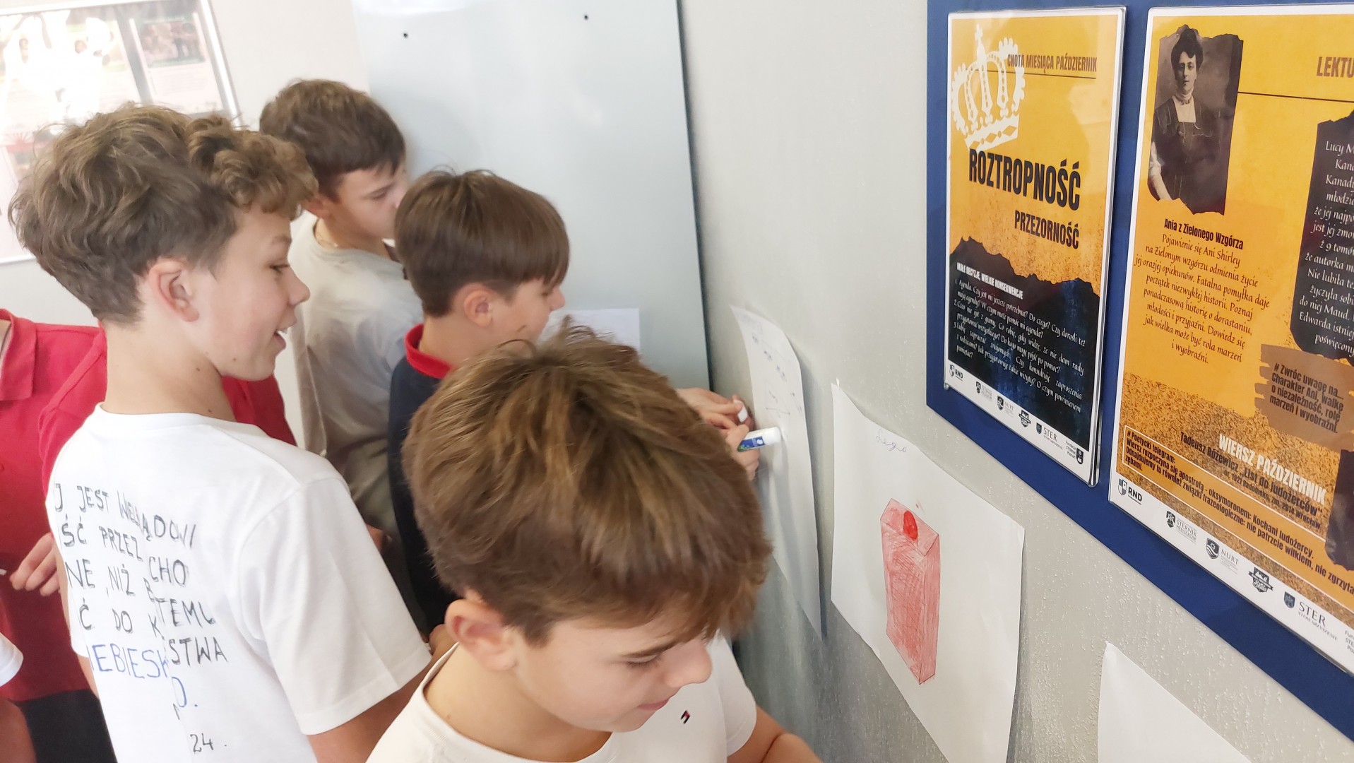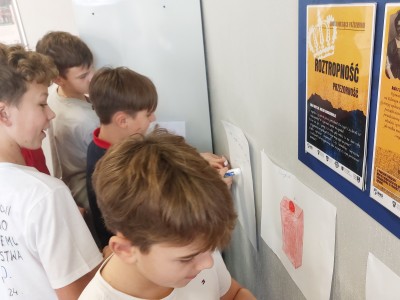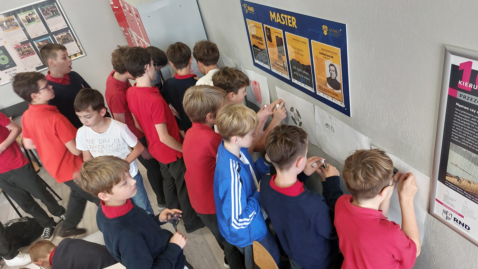 Każdy uczeń otrzymał pięć karteczek z własnym imieniem i nazwiskiem. Mógł je przykleić do plakatów odpowiadających jego zainteresowaniom. Wszystkie „głosy” zostały zliczone przez chłopców – wyniki (zabrakło nam czasu podczas lekcji) zostaną zaprezentowane na wspólnym plakacie podsumowującym zajęcia.