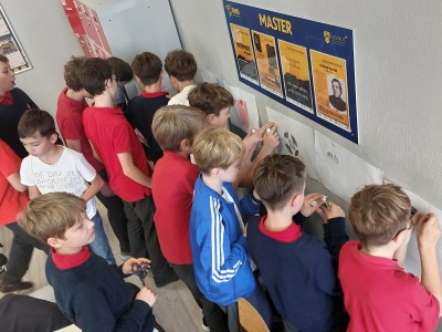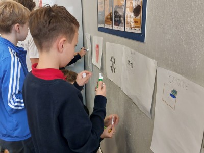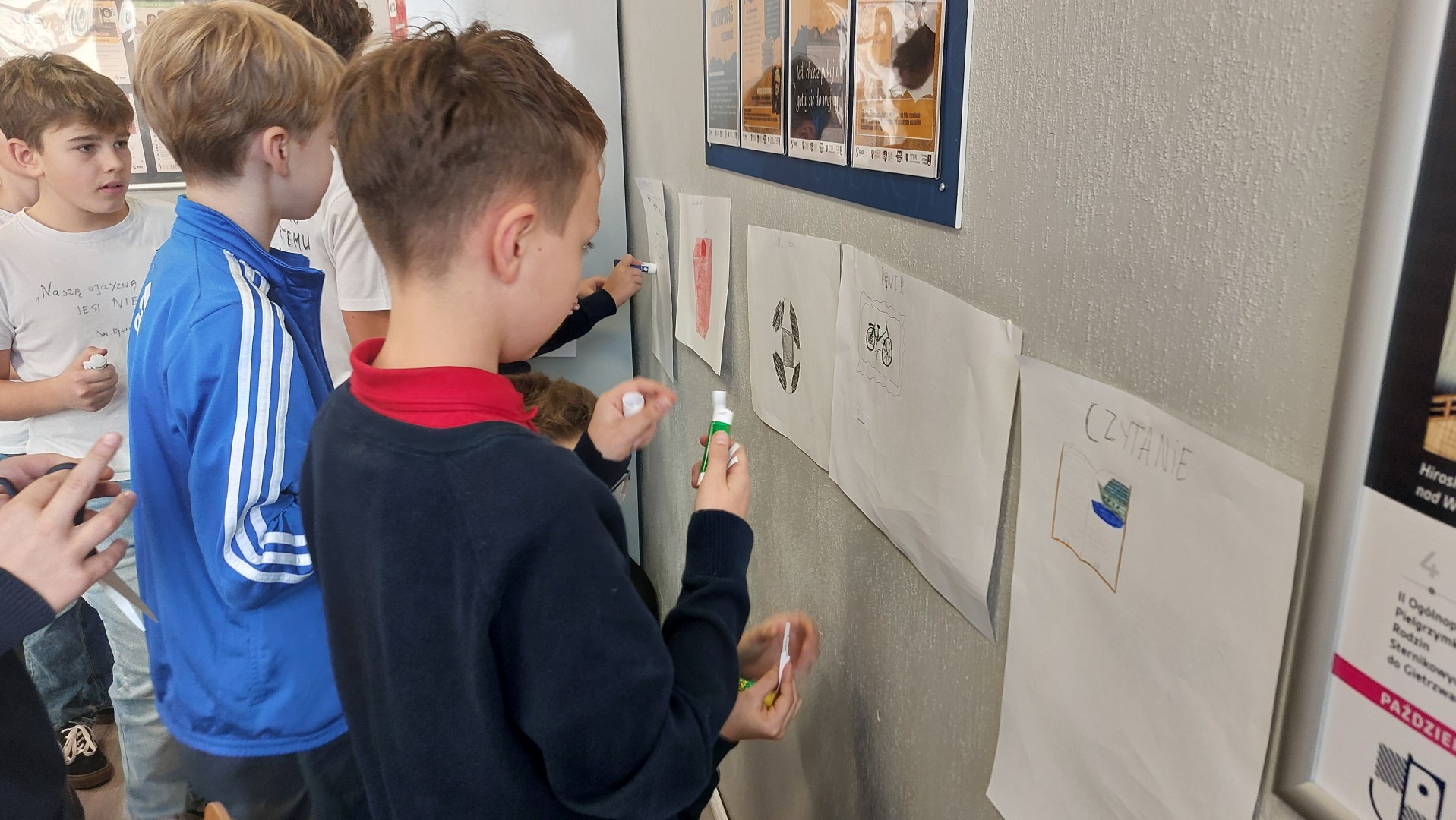 Każdy z chłopców zapisał w agendzie pięć ulubionych hobby. Następnie uczniowie zostali podzieleni na grupy, w których wypisali te zainteresowania, które łączyły przynajmniej dwie osoby. Wspólną listę umieściliśmy na tablicy. Spośród wszystkich propozycji wybraliśmy sześć, a każda z grup przygotowała mini plakat z nazwą i ilustracją przedstawiającą daną aktywność.