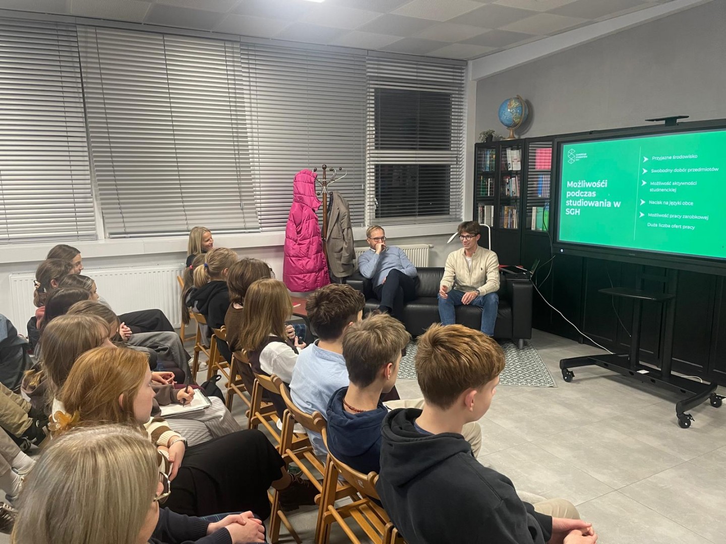 Antoni Świderski, nasz absolwent a obecnie student SGH, opowiadał o rekrutacji, studiach i możliwych formach zaangażowania w Szkole Głównej Handlowej w Warszawie. Natomiast nasz drugi gość, Bartosz Radzikowski, podzielił się swoim doświadczeniem związanym ze studiami za granicą. Wspólnie zastanawialiśmy się, jakie szanse i jakie zagrożenia mogą się wiązać z decyzją o podjęciu studiów na uczelni poza Polską.