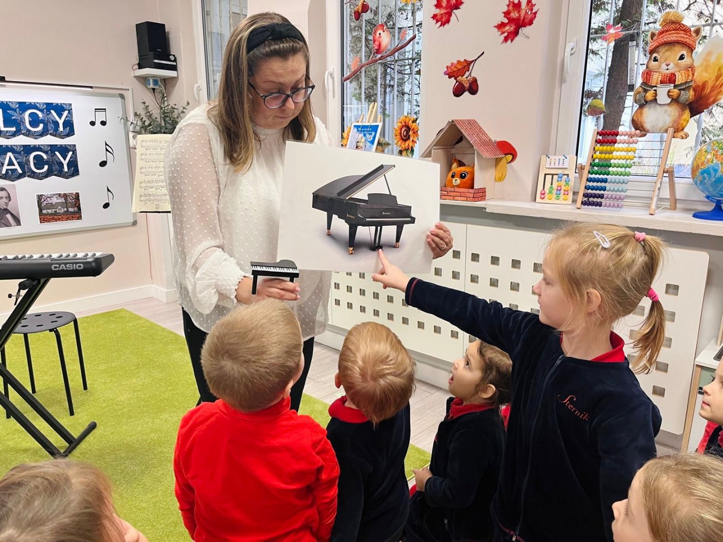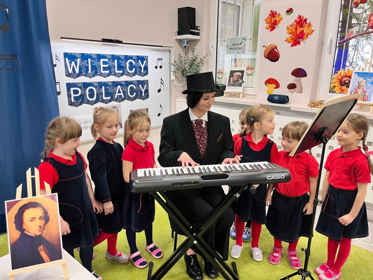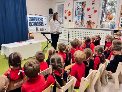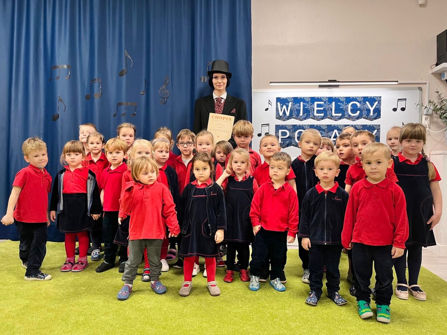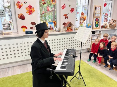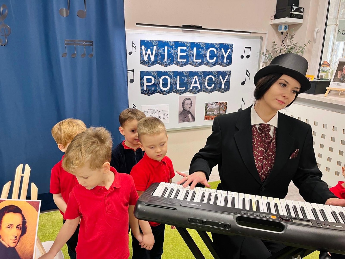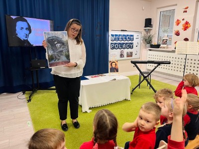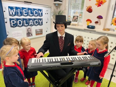 Dzieci dowiedziały się, gdzie się urodził, jak wyglądało jego dzieciństwo oraz w jakich miejscach mieszkał podczas swojego życia. Poznały także instrument, na którym tworzył swoje niezwykłe utwory oraz wysłuchały informacji o najważniejszych kompozycjach artysty. Na zakończenie zajęć czekała na dzieci wyjątkowa niespodzianka. W sali pojawiła się postać Fryderyka Chopina i usłyszeliśmy kilka jego utworów, dzięki temu przedszkolaki mogły poczuć klimat prawdziwego koncertu i jeszcze lepiej zrozumieć, jak brzmiała muzyka naszego wielkiego kompozytora.