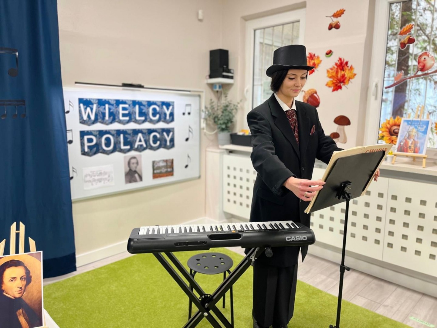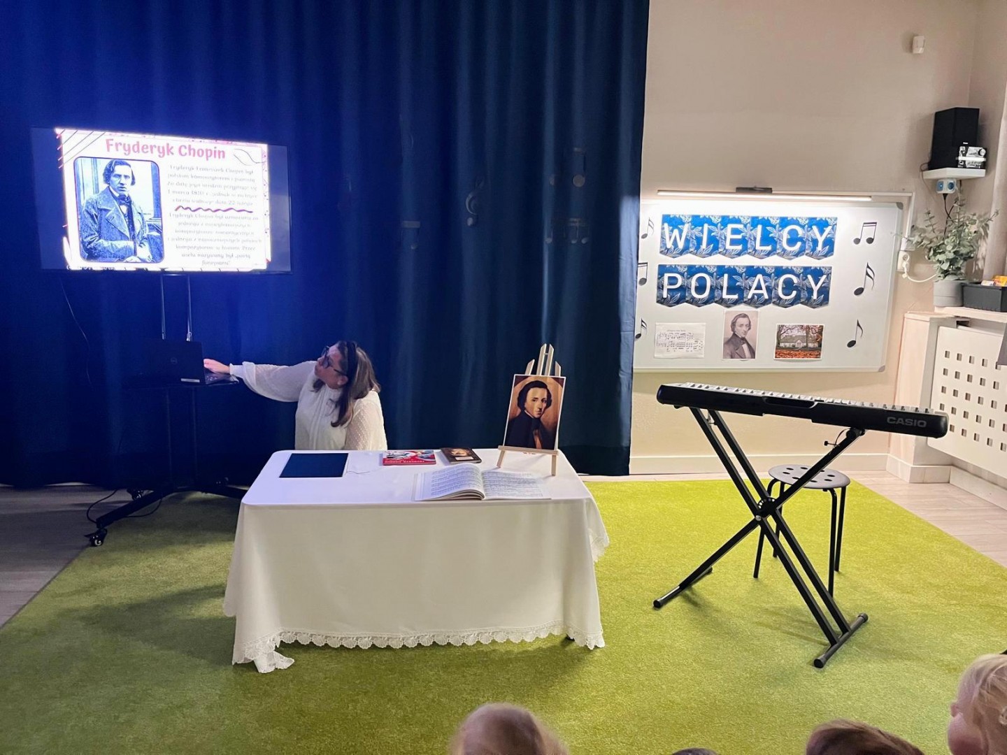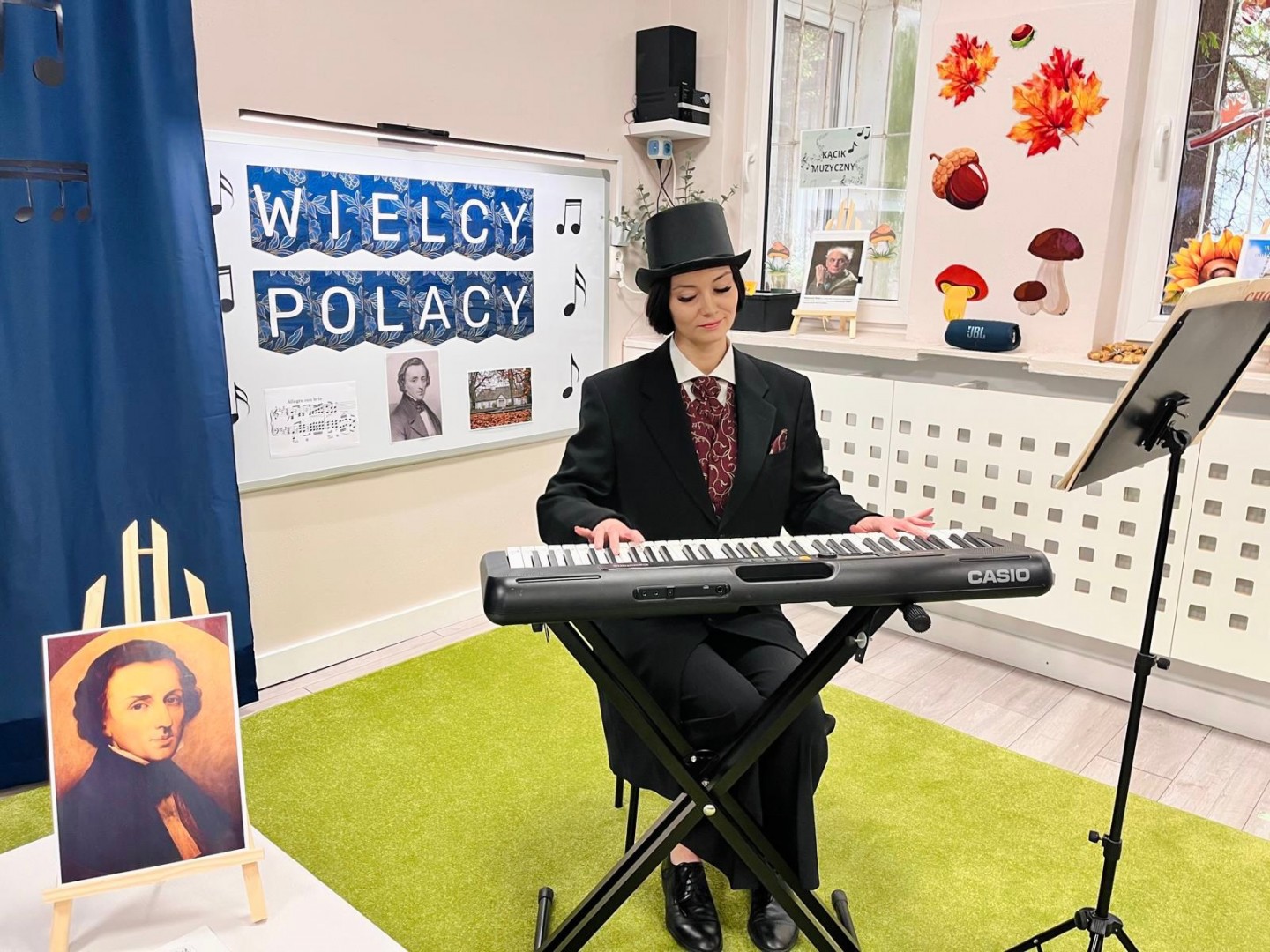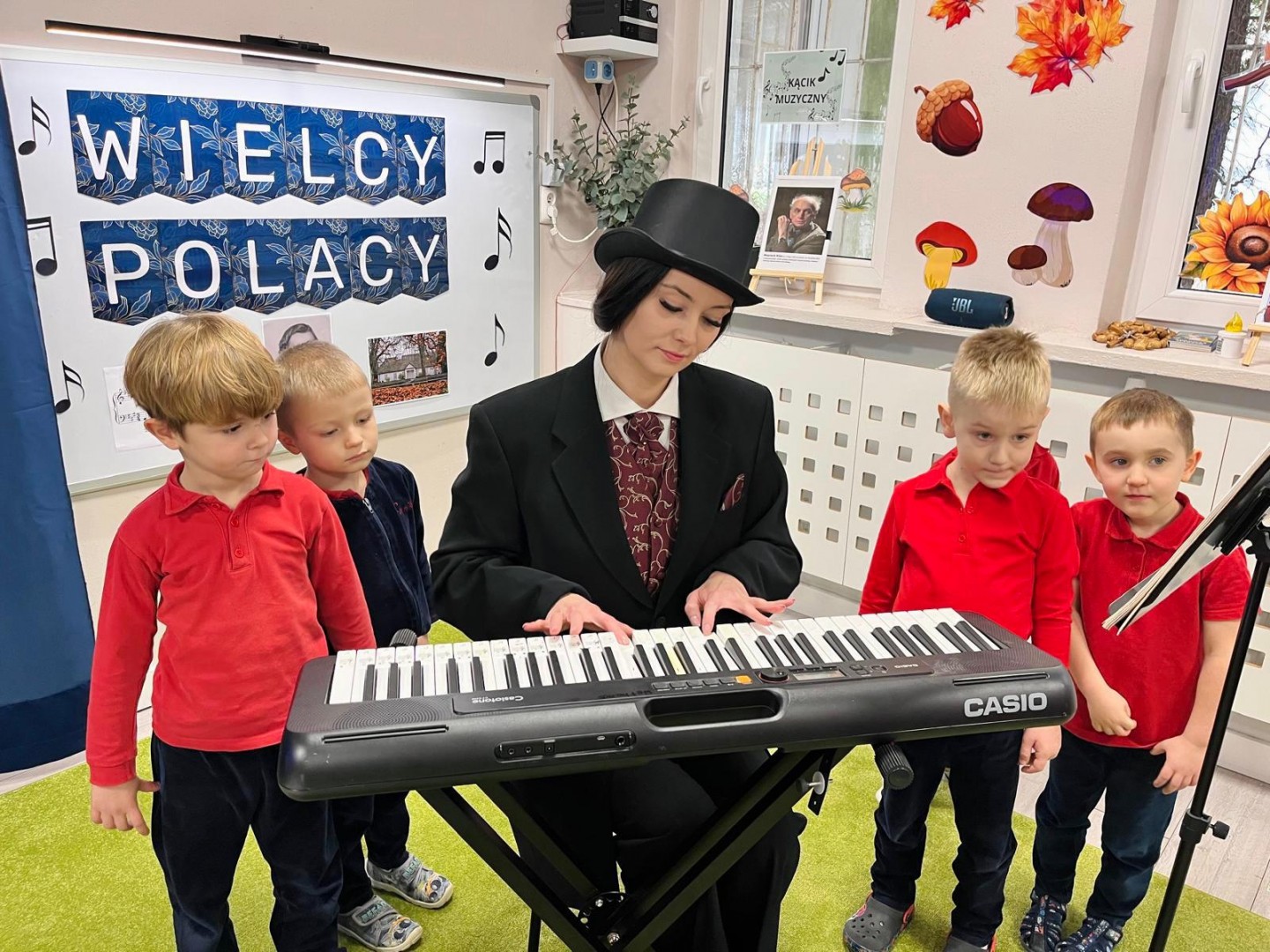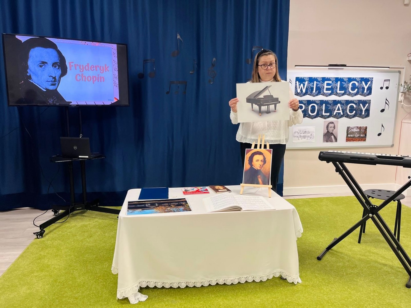 Dzieci dowiedziały się, gdzie się urodził, jak wyglądało jego dzieciństwo oraz w jakich miejscach mieszkał podczas swojego życia. Poznały także instrument, na którym tworzył swoje niezwykłe utwory oraz wysłuchały informacji o najważniejszych kompozycjach artysty. Na zakończenie zajęć czekała na dzieci wyjątkowa niespodzianka. W sali pojawiła się postać Fryderyka Chopina i usłyszeliśmy kilka jego utworów, dzięki temu przedszkolaki mogły poczuć klimat prawdziwego koncertu i jeszcze lepiej zrozumieć, jak brzmiała muzyka naszego wielkiego kompozytora.