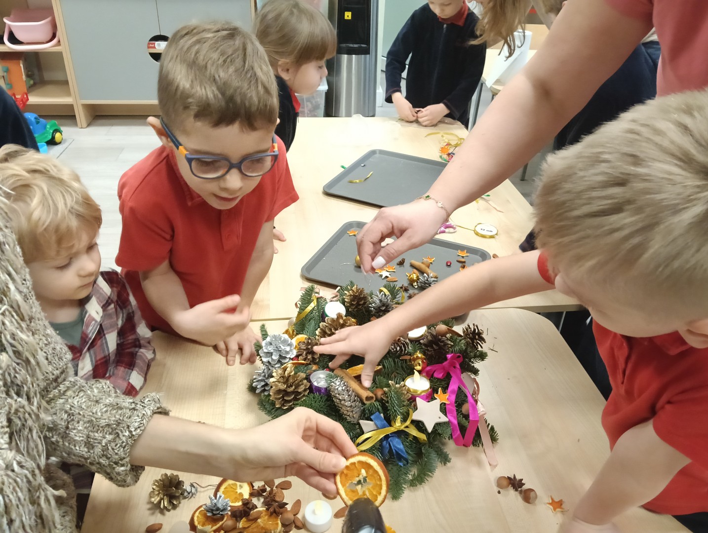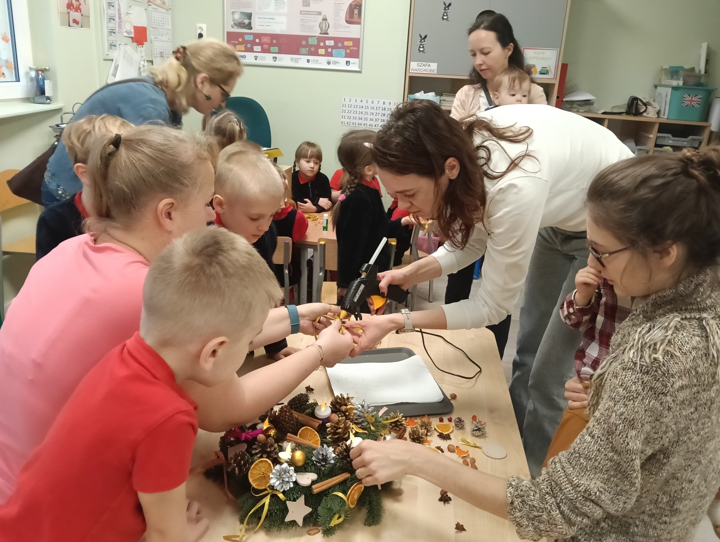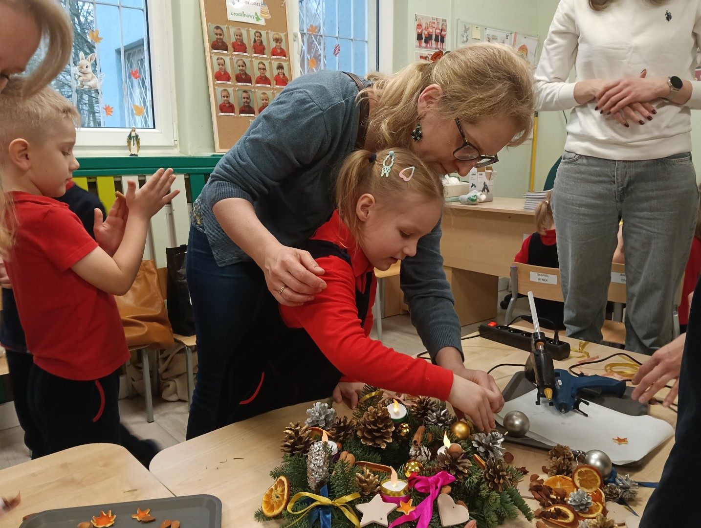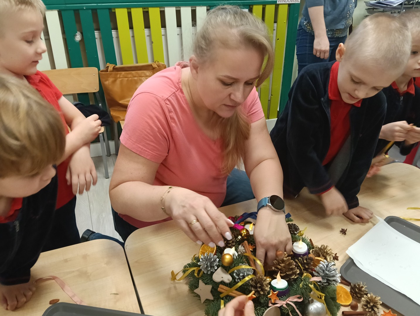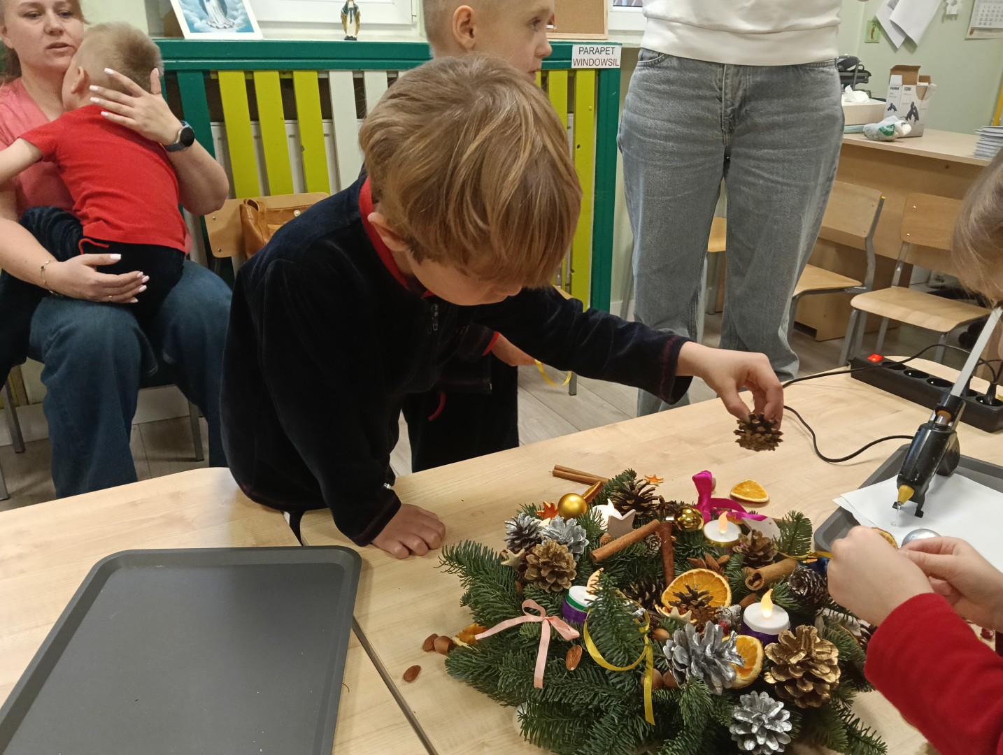 Korzystając z gotowego podkładu z gałązek, wszyscy z zaangażowaniem dodawali dekoracje, świeczki i świąteczne ozdoby. Wspólna praca wprowadziła radosną, rodzinną atmosferę, a dzieci z dumą prezentowały swoje kompozycje. Dzięki temu spotkaniu w sali zapanował wyjątkowy, adwentowy nastrój. Rodzicom bardzo serdecznie dziękujemy za zaangażowanie i poświęcony czas.