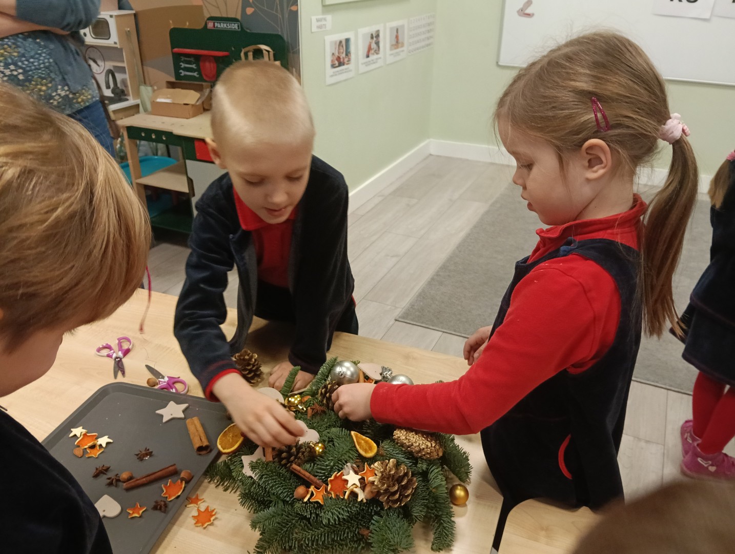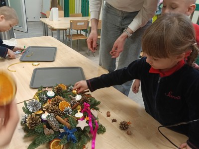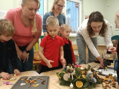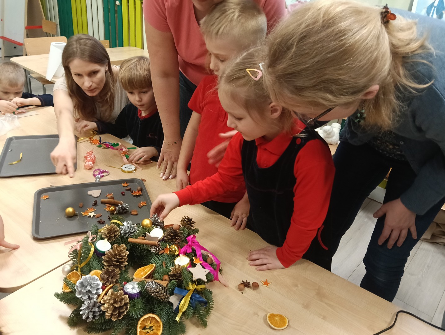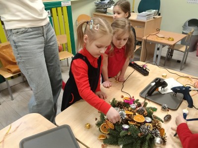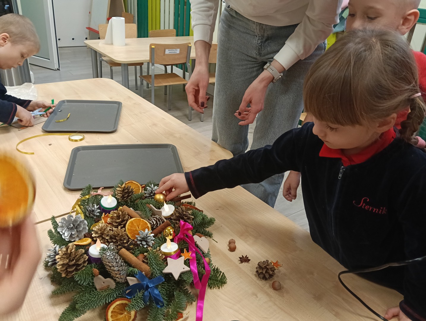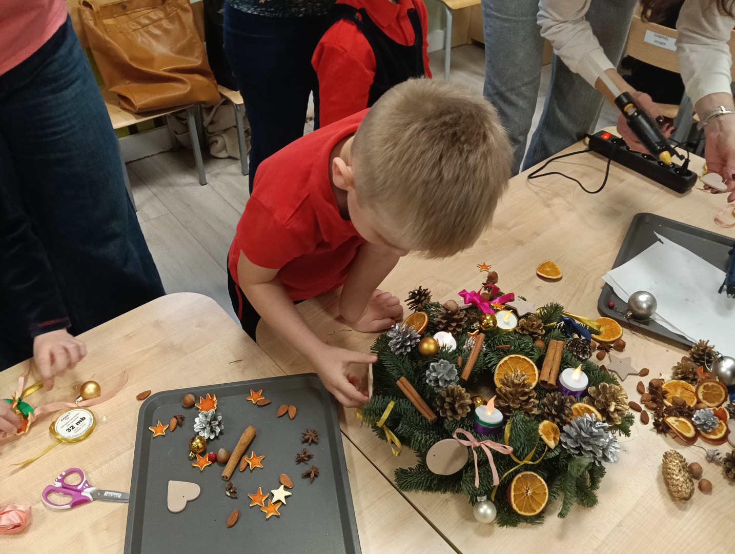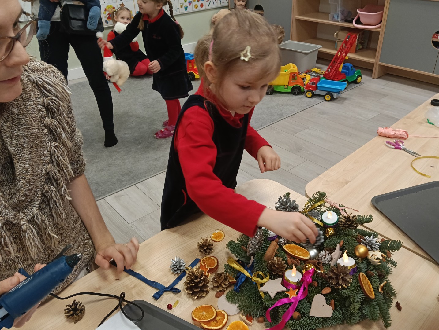 Korzystając z gotowego podkładu z gałązek, wszyscy z zaangażowaniem dodawali dekoracje, świeczki i świąteczne ozdoby. Wspólna praca wprowadziła radosną, rodzinną atmosferę, a dzieci z dumą prezentowały swoje kompozycje. Dzięki temu spotkaniu w sali zapanował wyjątkowy, adwentowy nastrój. Rodzicom bardzo serdecznie dziękujemy za zaangażowanie i poświęcony czas.