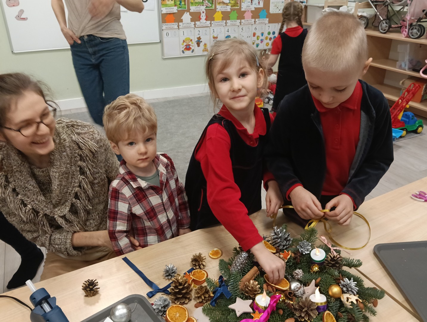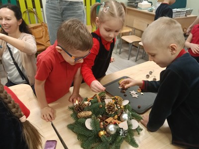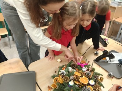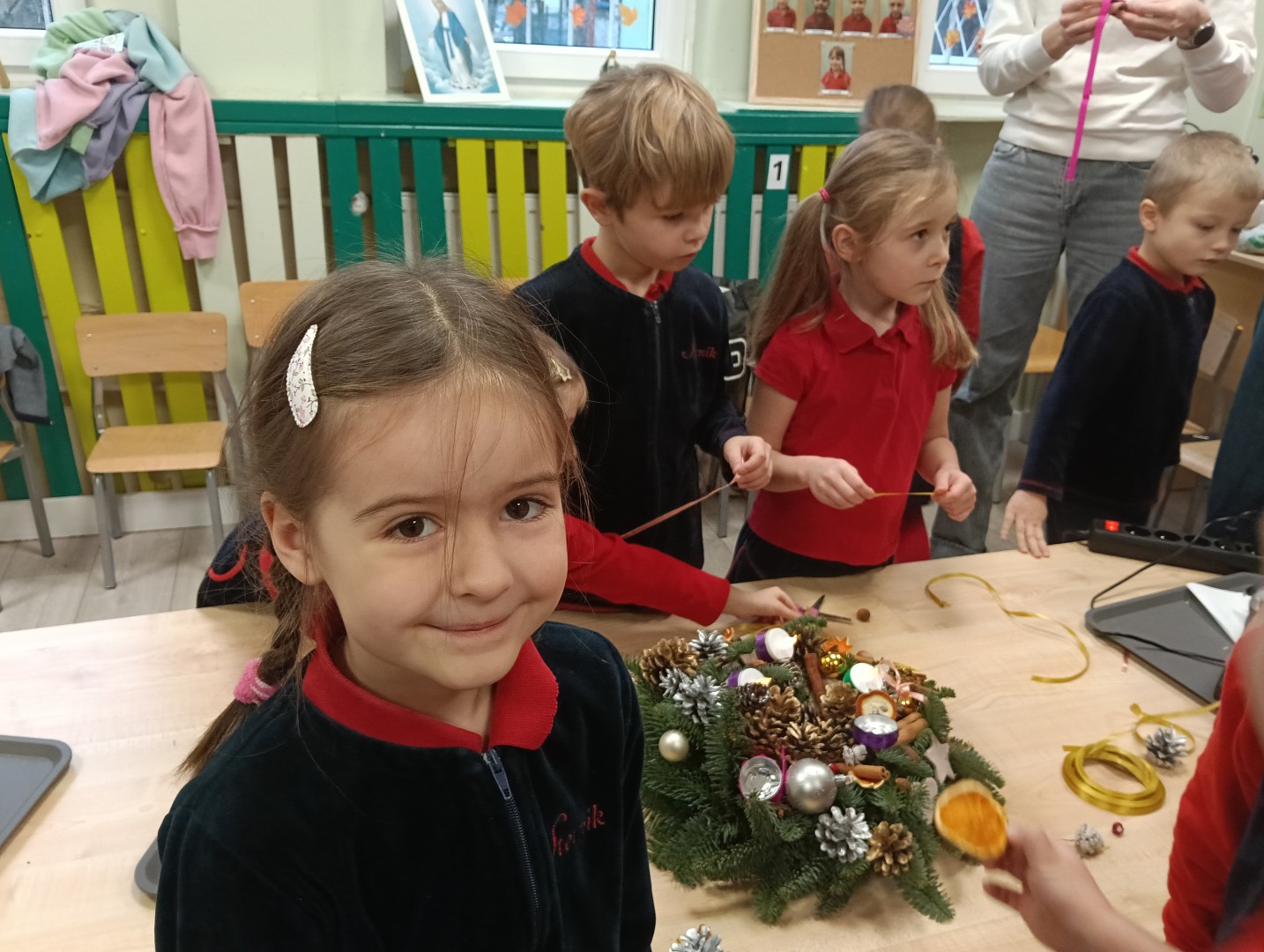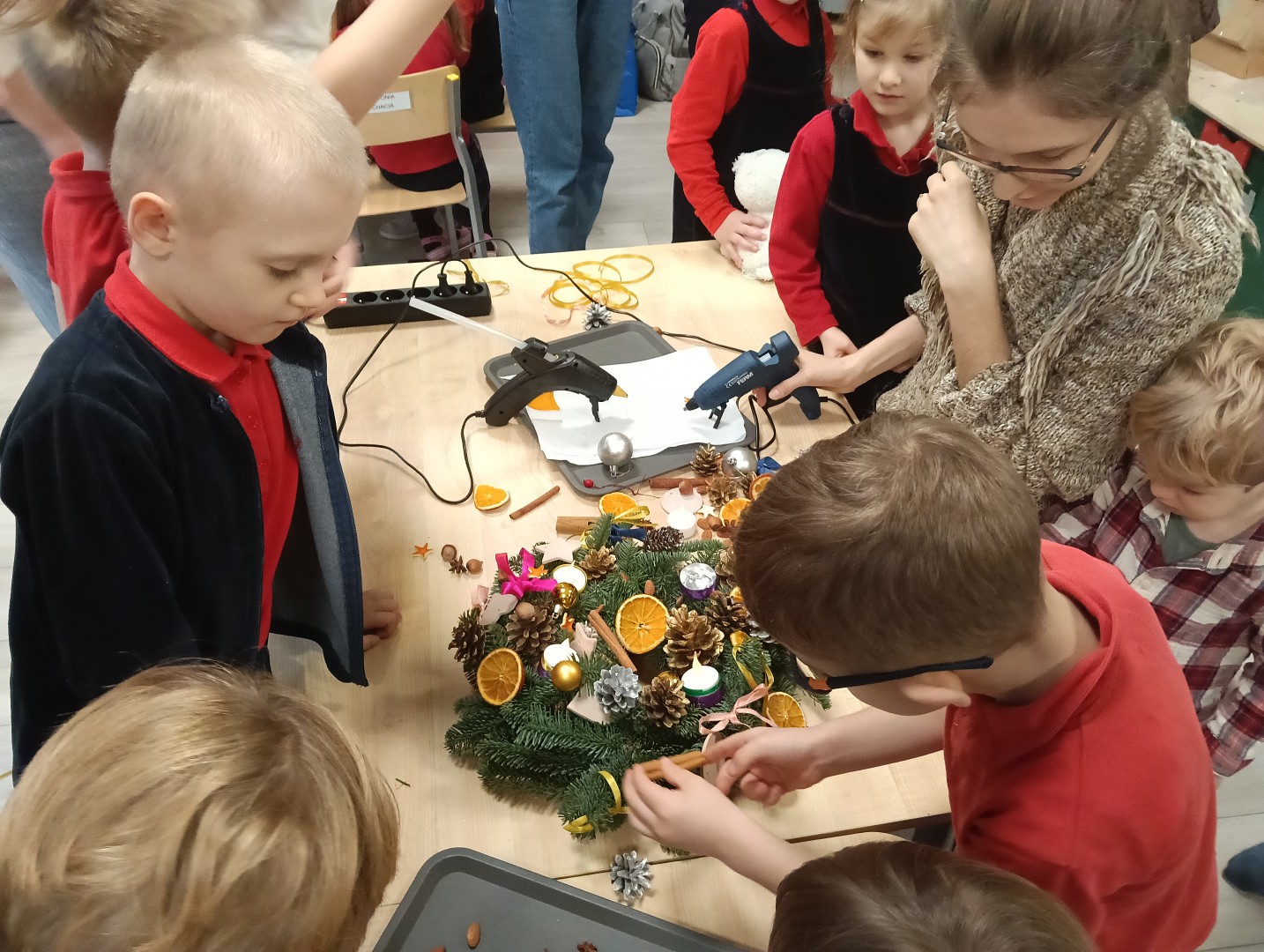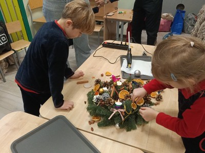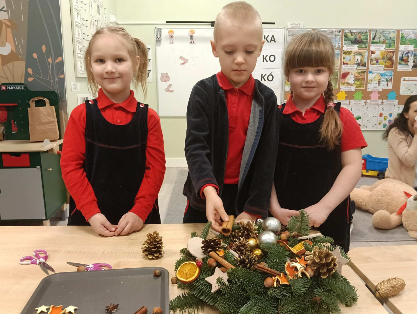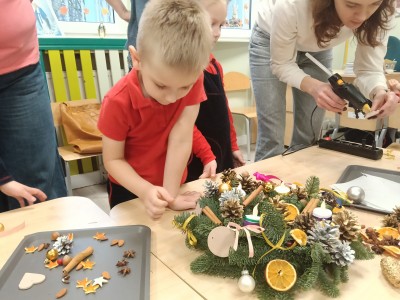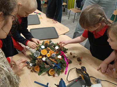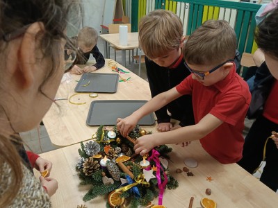 Korzystając z gotowego podkładu z gałązek, wszyscy z zaangażowaniem dodawali dekoracje, świeczki i świąteczne ozdoby. Wspólna praca wprowadziła radosną, rodzinną atmosferę, a dzieci z dumą prezentowały swoje kompozycje. Dzięki temu spotkaniu w sali zapanował wyjątkowy, adwentowy nastrój. Rodzicom bardzo serdecznie dziękujemy za zaangażowanie i poświęcony czas.