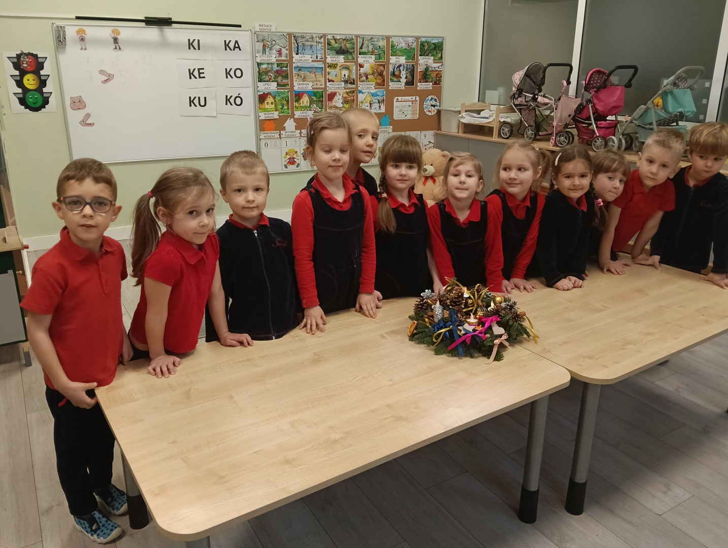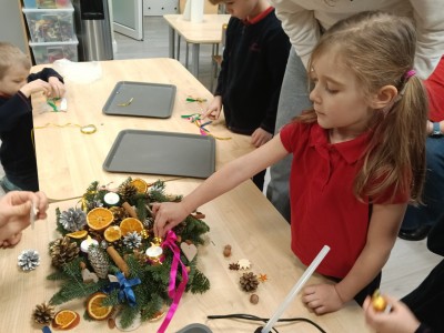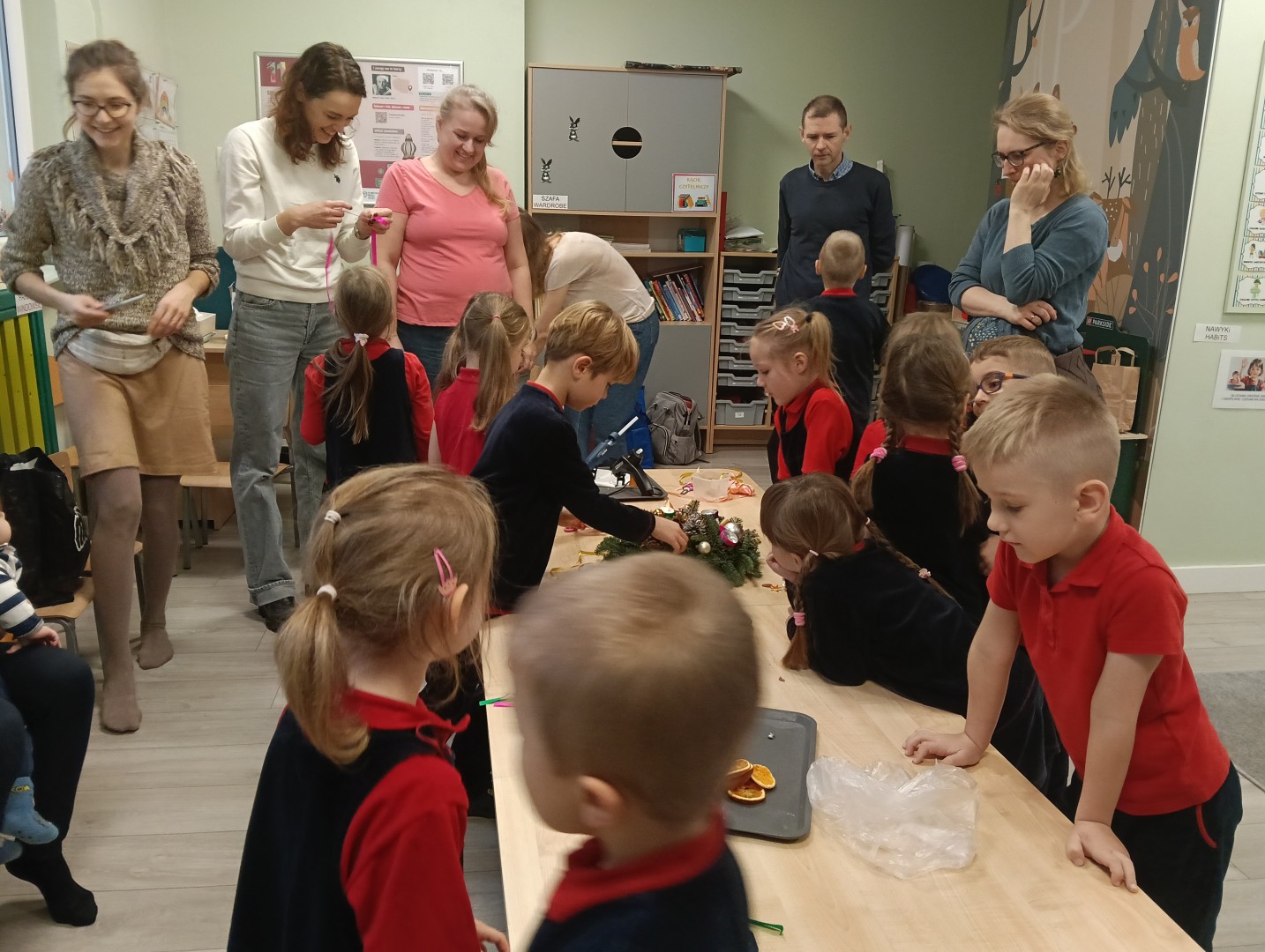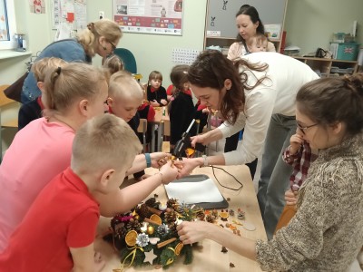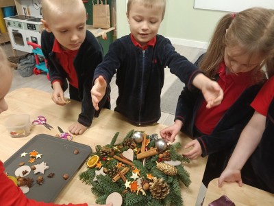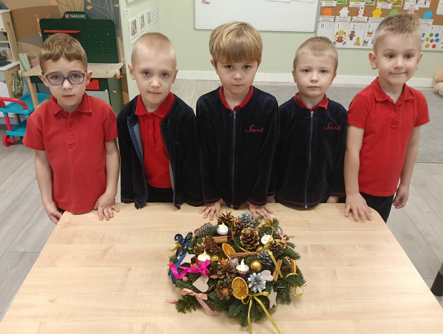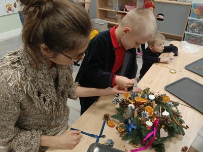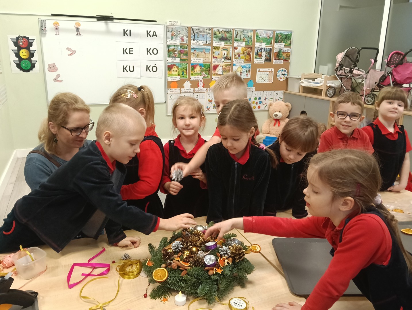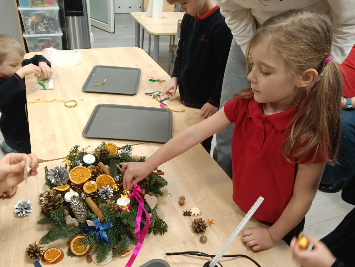 Korzystając z gotowego podkładu z gałązek, wszyscy z zaangażowaniem dodawali dekoracje, świeczki i świąteczne ozdoby. Wspólna praca wprowadziła radosną, rodzinną atmosferę, a dzieci z dumą prezentowały swoje kompozycje. Dzięki temu spotkaniu w sali zapanował wyjątkowy, adwentowy nastrój. Rodzicom bardzo serdecznie dziękujemy za zaangażowanie i poświęcony czas.