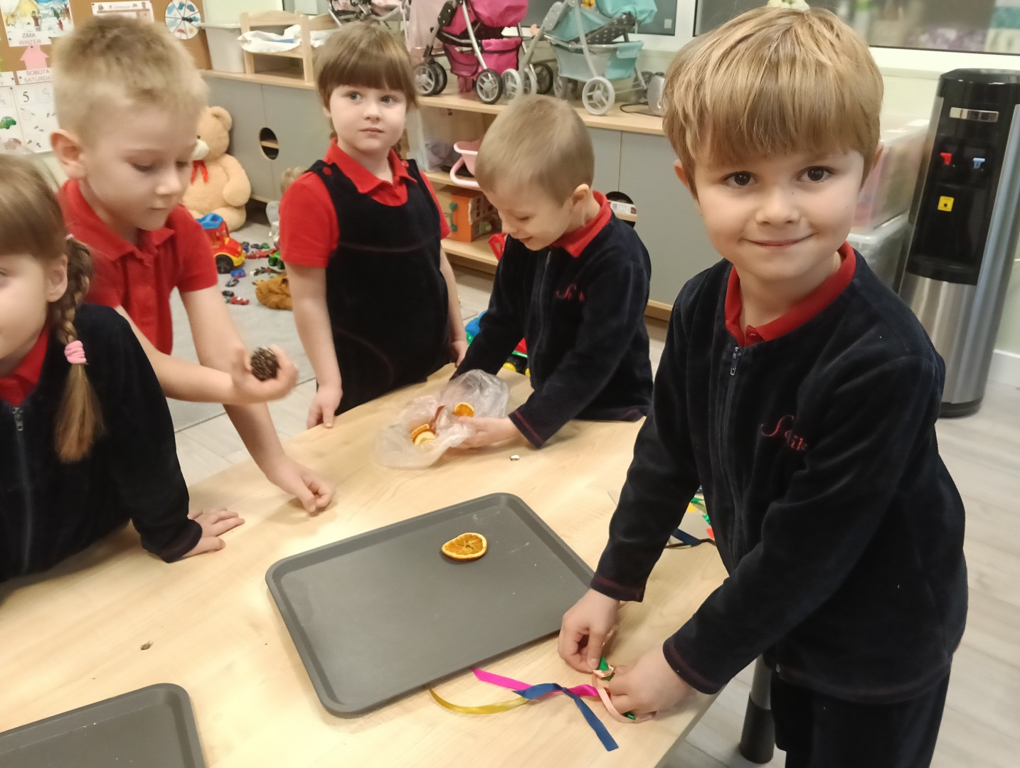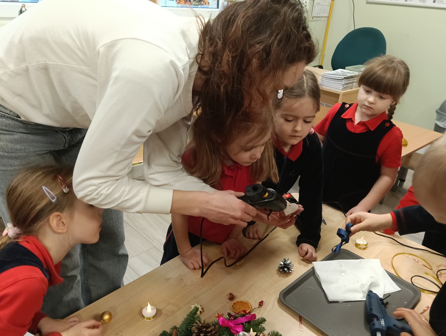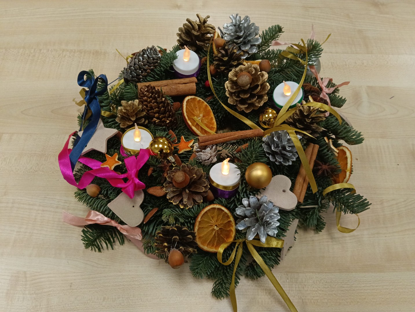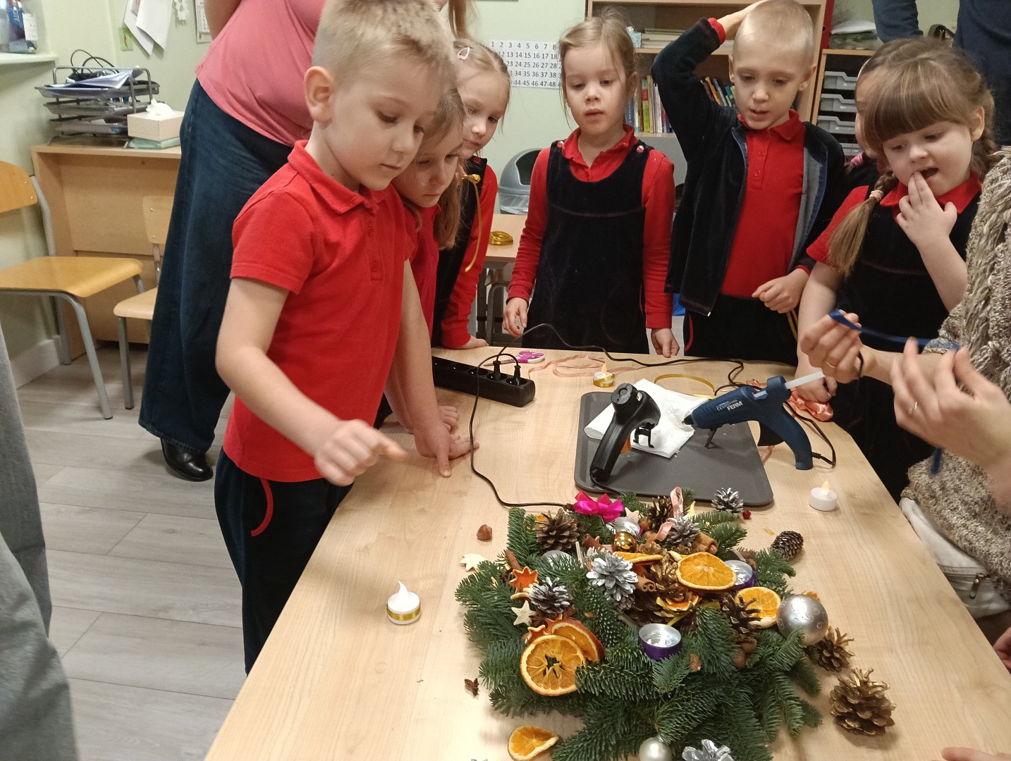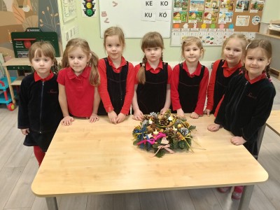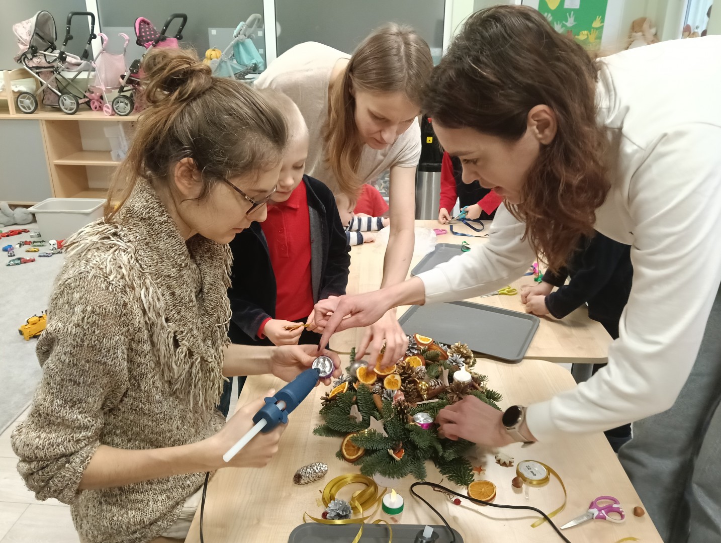 Korzystając z gotowego podkładu z gałązek, wszyscy z zaangażowaniem dodawali dekoracje, świeczki i świąteczne ozdoby. Wspólna praca wprowadziła radosną, rodzinną atmosferę, a dzieci z dumą prezentowały swoje kompozycje. Dzięki temu spotkaniu w sali zapanował wyjątkowy, adwentowy nastrój. Rodzicom bardzo serdecznie dziękujemy za zaangażowanie i poświęcony czas.