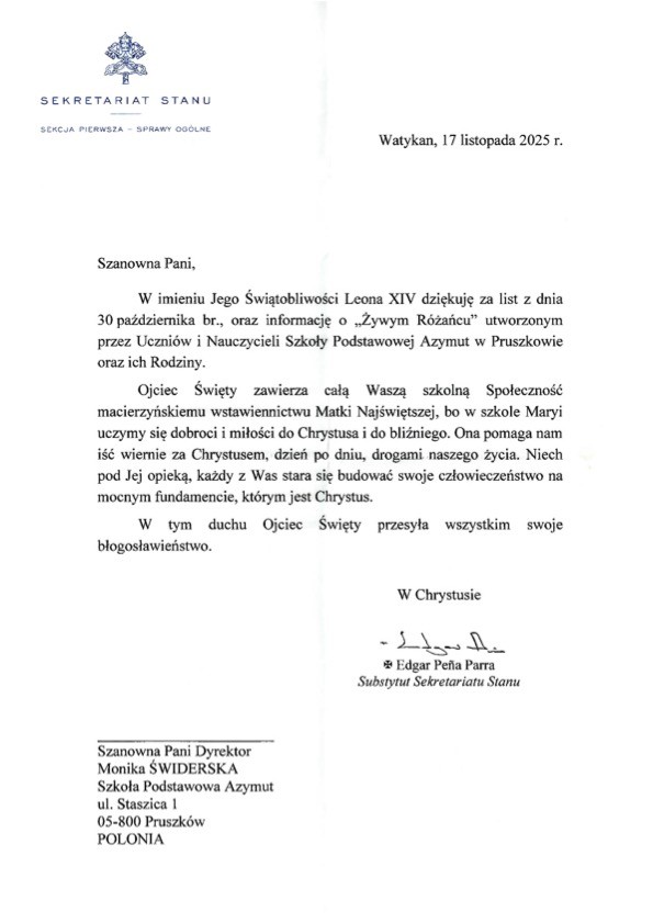 Możemy potwierdzić, że Poczta Polska i poczta Watykańska działają! Przesyłka nie tylko bezpiecznie dotarała, ale i otrzymaliśmy odpowiedź z podziękowaniem i błogosławieństwem od Ojca Świętego.