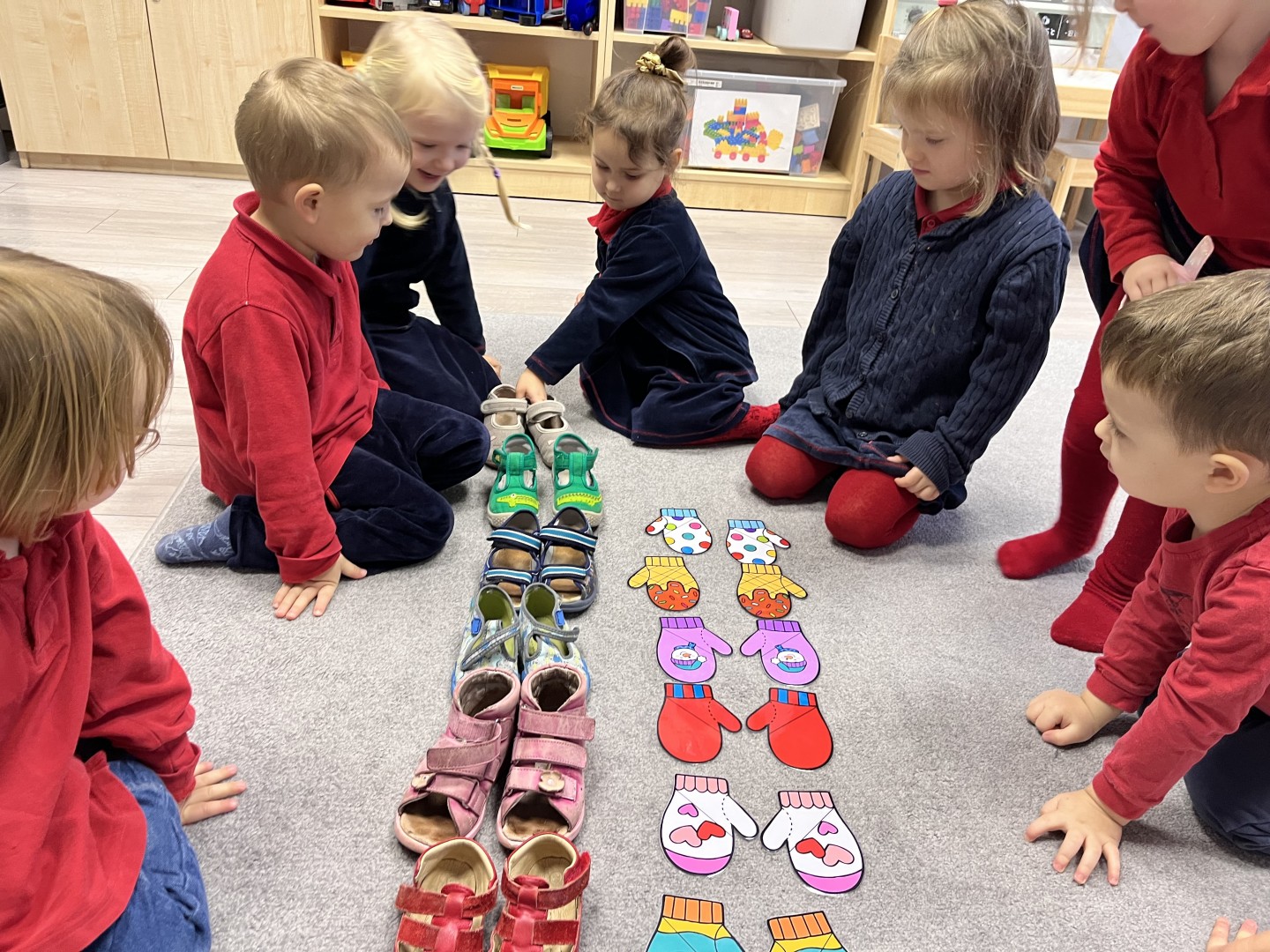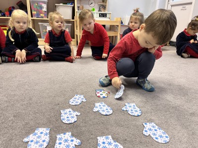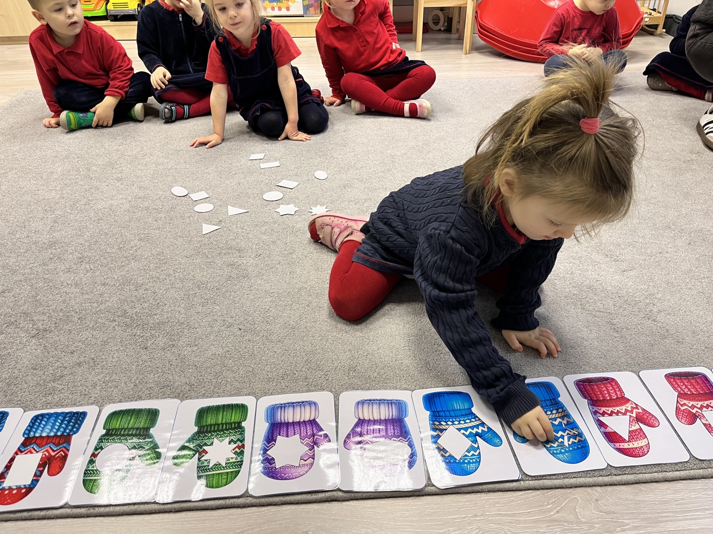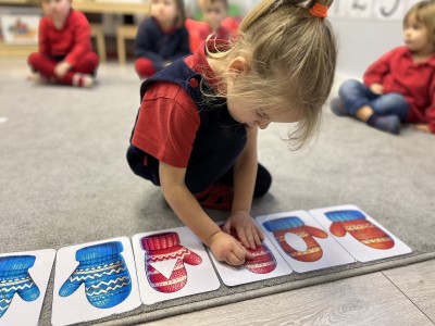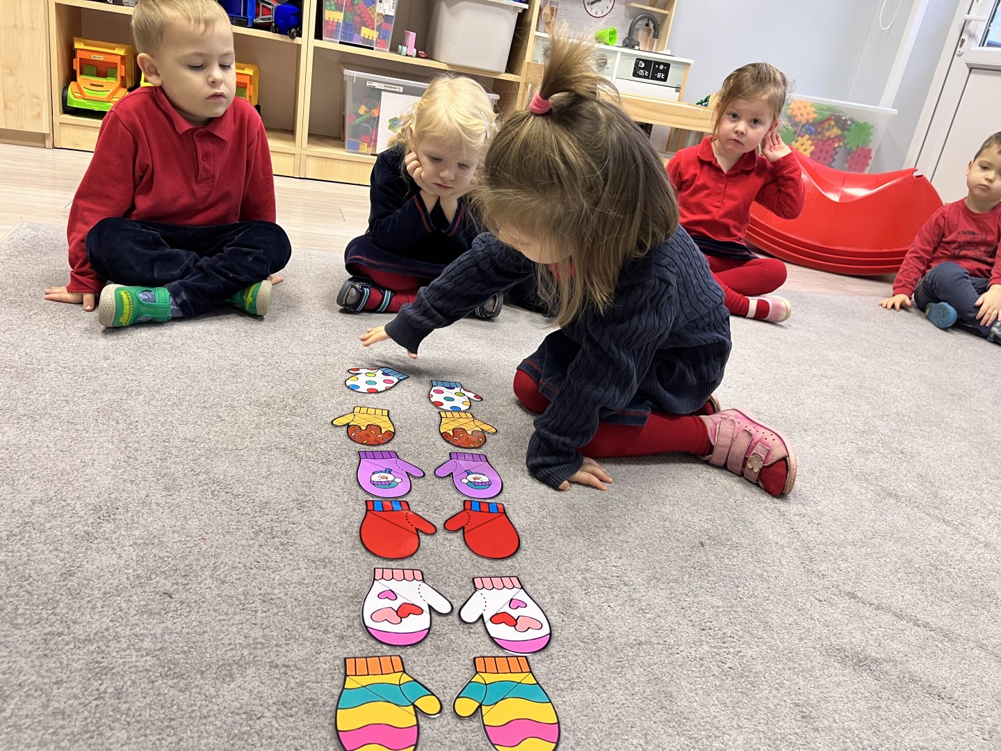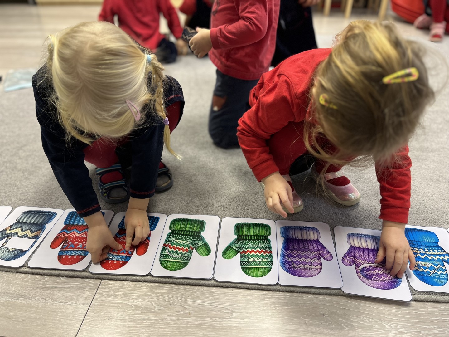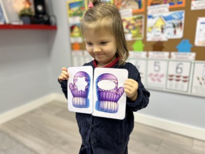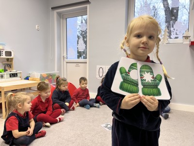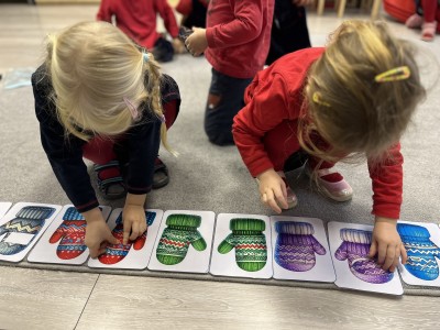 Naszą przygodę rozpoczęliśmy od odnajdywania pasujących do siebie par rękawiczek. Dzieci najpierw szukały dwóch identycznych, a następnie dopasowywały właściwe fragmenty wzoru do całej rękawiczki. Było to świetne ćwiczenie na koncentrację i analizę wzrokową. Następnie zagraliśmy w memory, oczywiście w tematyce rękawiczek. Przedszkolaki z dużym zaangażowaniem odkrywały kartoniki, starając się odnaleźć pasujące pary. Zabawa ta pomogła dzieciom utrwalać nazwy kolorów, rozwijać pamięć wzrokową i precyzję ruchów. Na zakończenie czekało zadanie praktyczne, przedszkolaki ściągnęły kapcie i ułożyły je w pary, a potem z rozsypanych kapci musiały odnaleźć swoje własne, poprawnie je dopasować i założyć na odpowiednie stopy. To ćwiczenie nie tylko wzmacniało samodzielność, ale także uczyło orientacji i rozpoznawania kierunków (prawa–lewa).