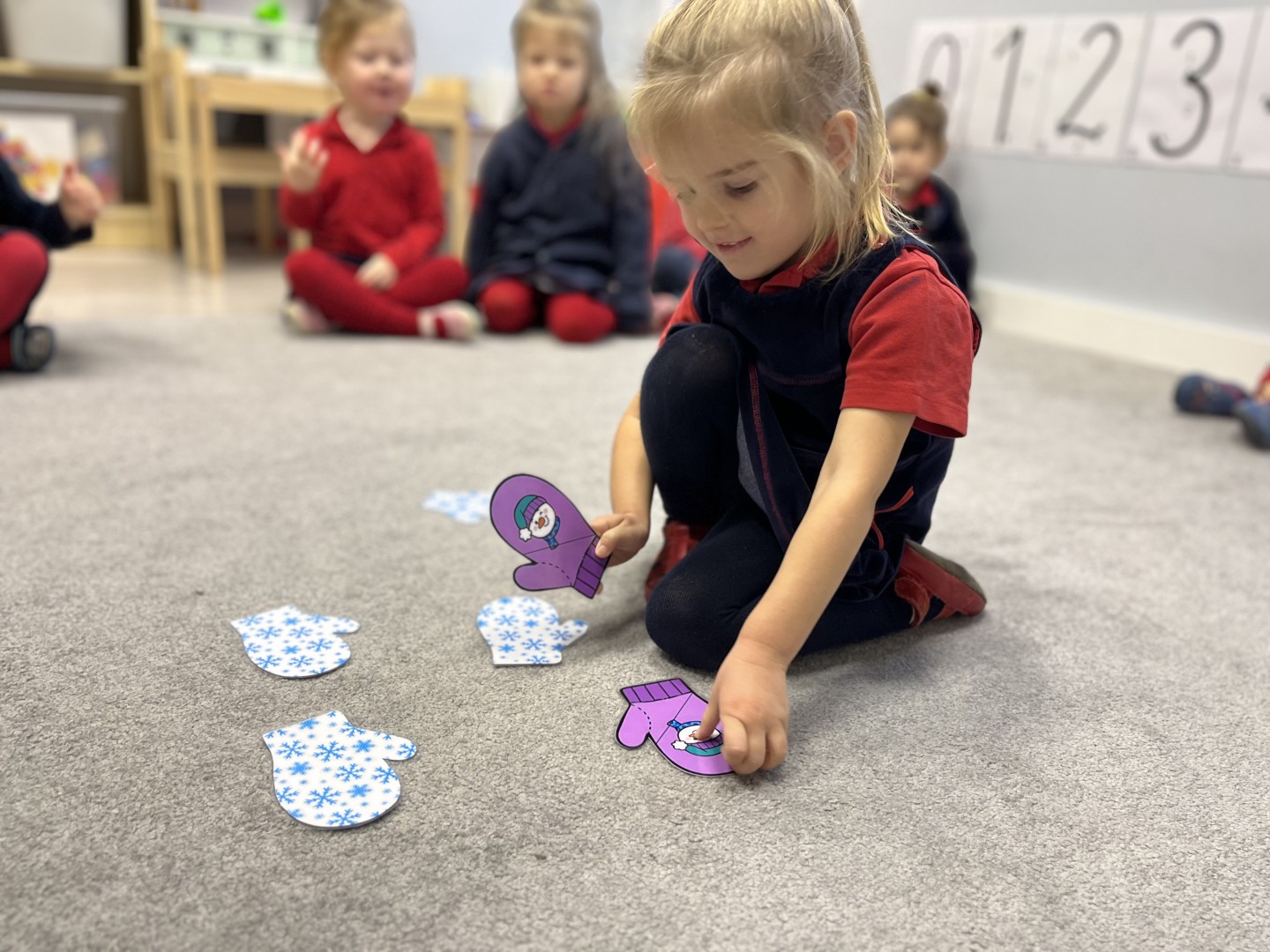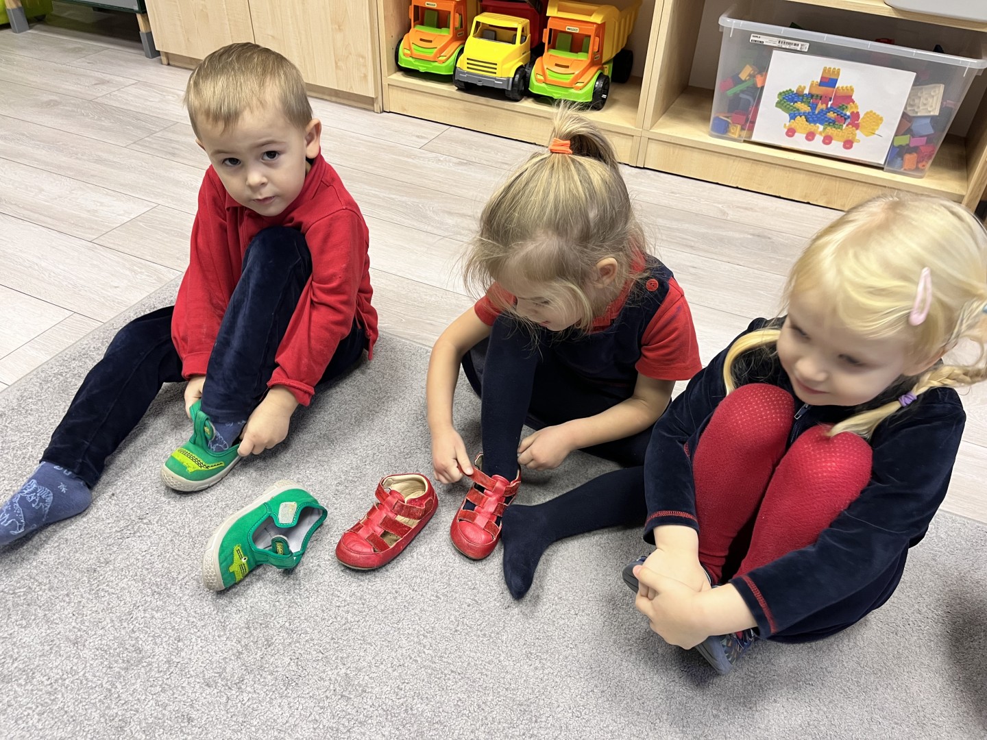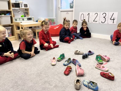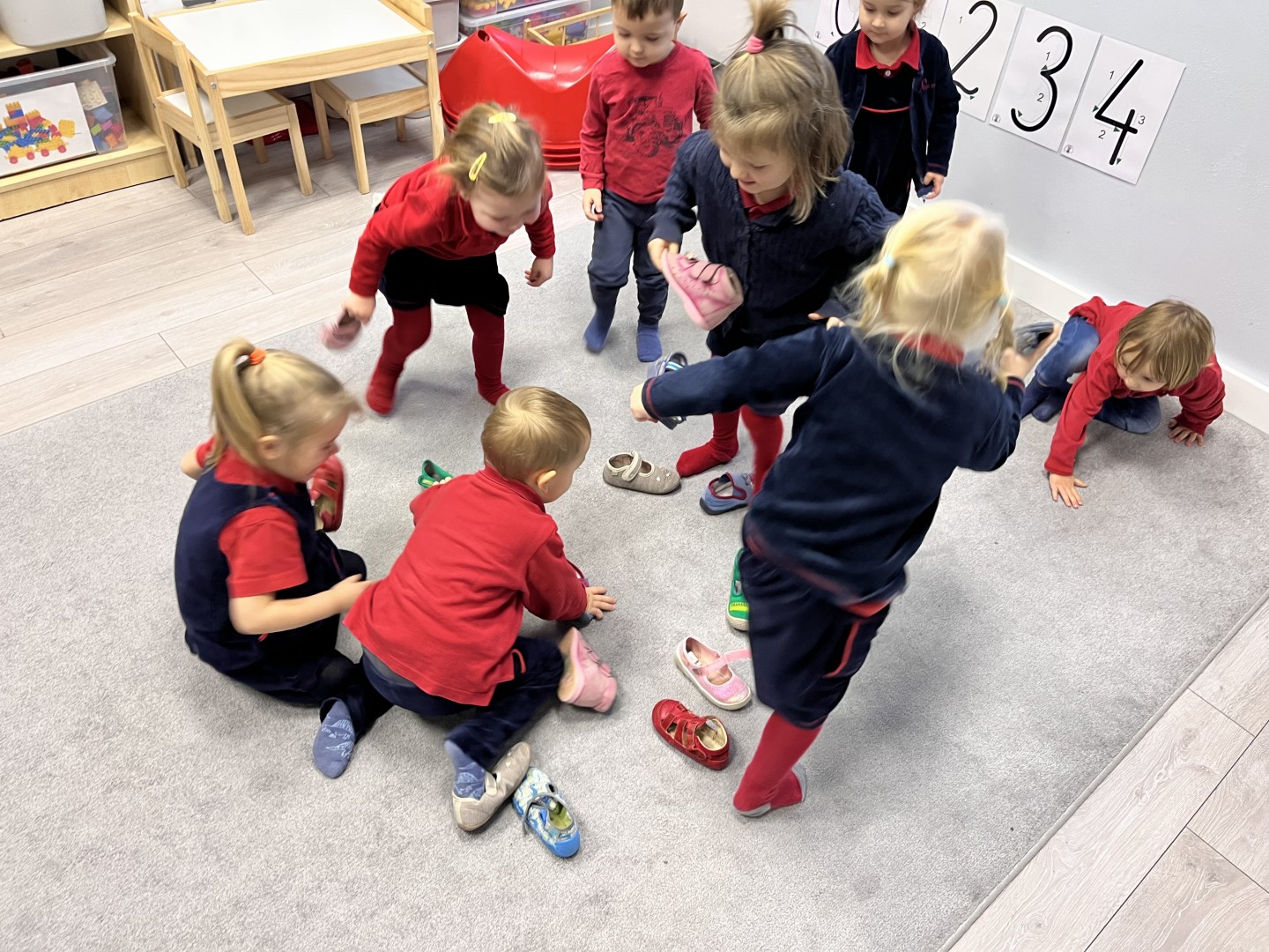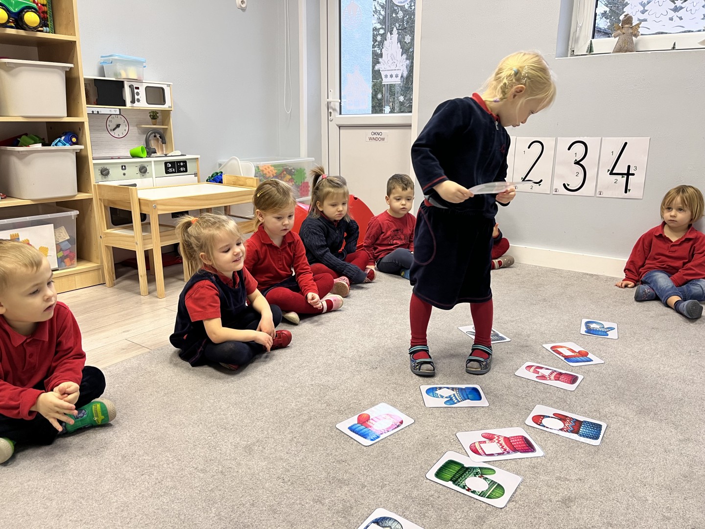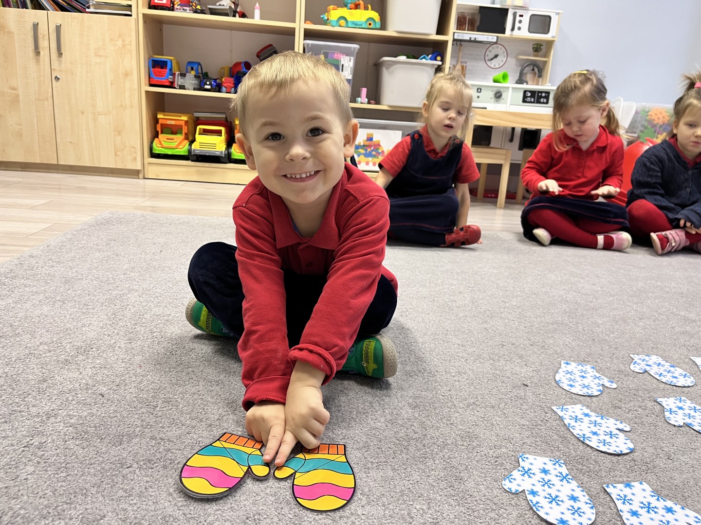 Naszą przygodę rozpoczęliśmy od odnajdywania pasujących do siebie par rękawiczek. Dzieci najpierw szukały dwóch identycznych, a następnie dopasowywały właściwe fragmenty wzoru do całej rękawiczki. Było to świetne ćwiczenie na koncentrację i analizę wzrokową. Następnie zagraliśmy w memory, oczywiście w tematyce rękawiczek. Przedszkolaki z dużym zaangażowaniem odkrywały kartoniki, starając się odnaleźć pasujące pary. Zabawa ta pomogła dzieciom utrwalać nazwy kolorów, rozwijać pamięć wzrokową i precyzję ruchów. Na zakończenie czekało zadanie praktyczne, przedszkolaki ściągnęły kapcie i ułożyły je w pary, a potem z rozsypanych kapci musiały odnaleźć swoje własne, poprawnie je dopasować i założyć na odpowiednie stopy. To ćwiczenie nie tylko wzmacniało samodzielność, ale także uczyło orientacji i rozpoznawania kierunków (prawa–lewa).