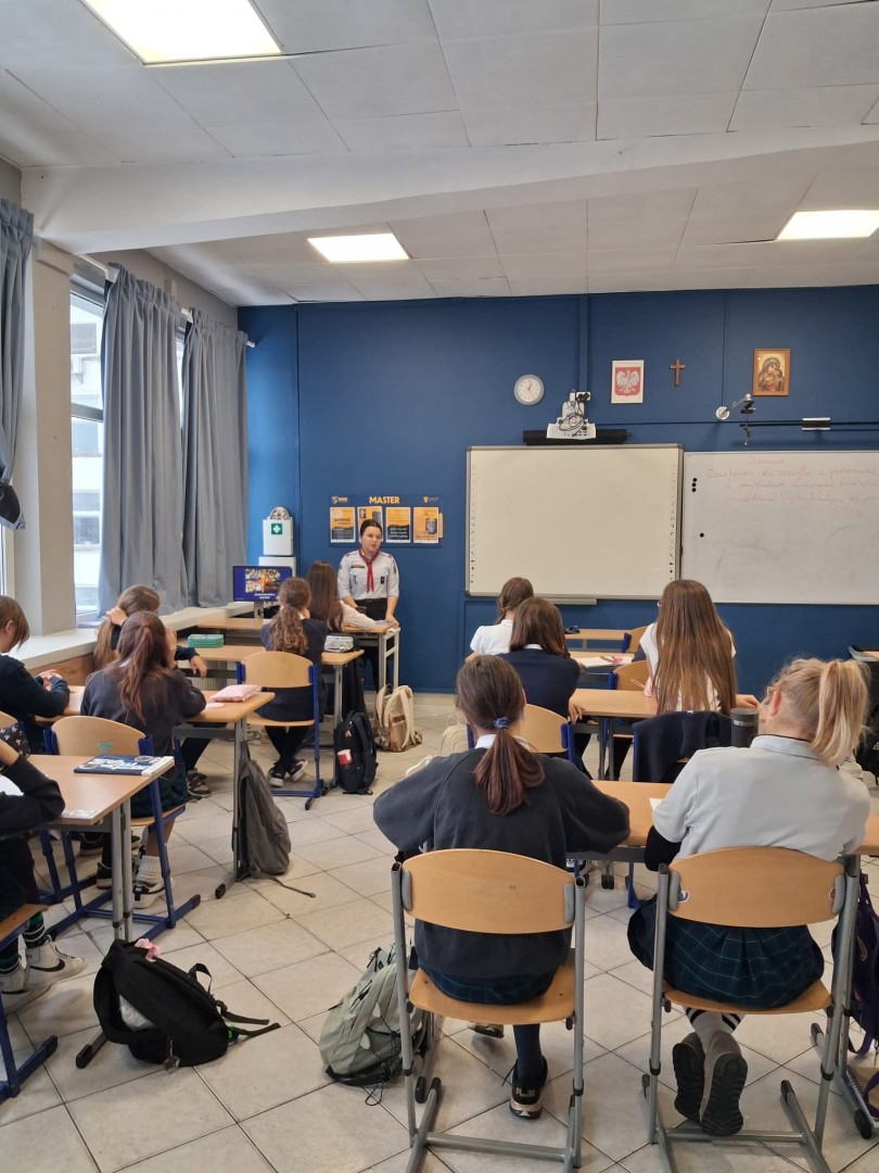 Chłopcy wysłuchali prelekcji Pana Huberta Masłowskiego, drużynowego, natomiast dziewczynki uczestniczyły w spotkaniu prowadzonym przez Panią Gabrielę Borządek – szefową ogniska młodych przewodniczek.