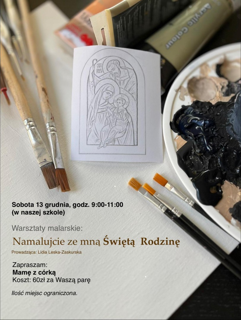 W sobotę, 13 grudnia, w godz. 9:00–11:00 zapraszamy na wyjątkowe warsztaty malarskie „Namalujcie ze mną Św. Rodzinę” — prowadzone przez panią Lidię Zaskurską, naszą mamę-artystkę, która z ogromną pasją i ciepłem poprowadzi duety mama + córka przez małe, twórcze „rekolekcje” z pędzlem w ręku.