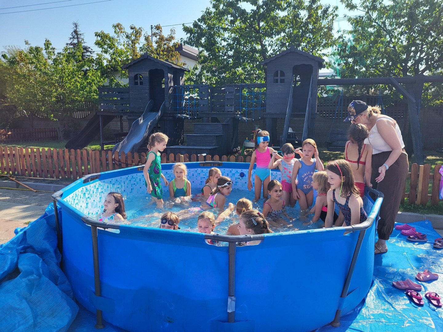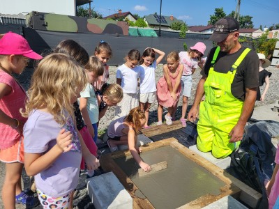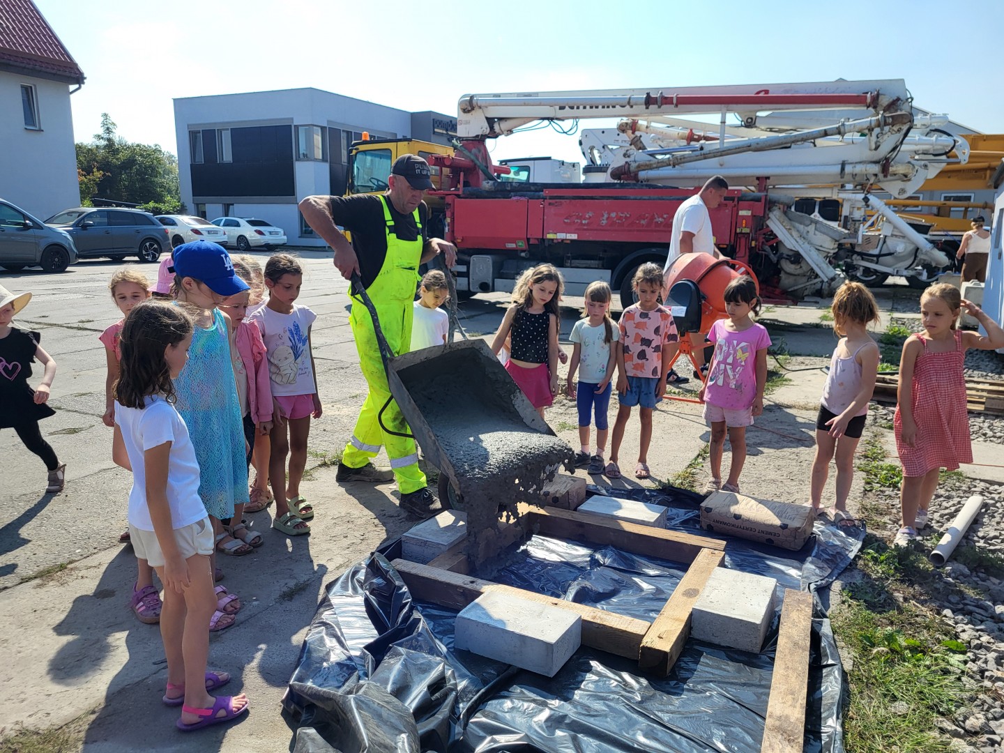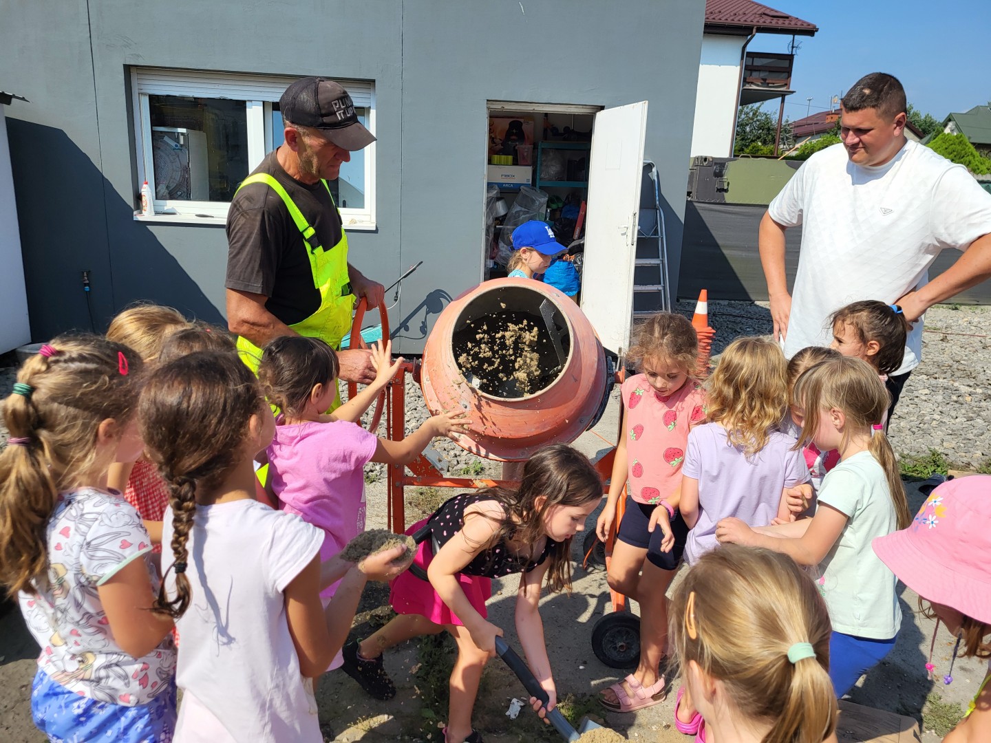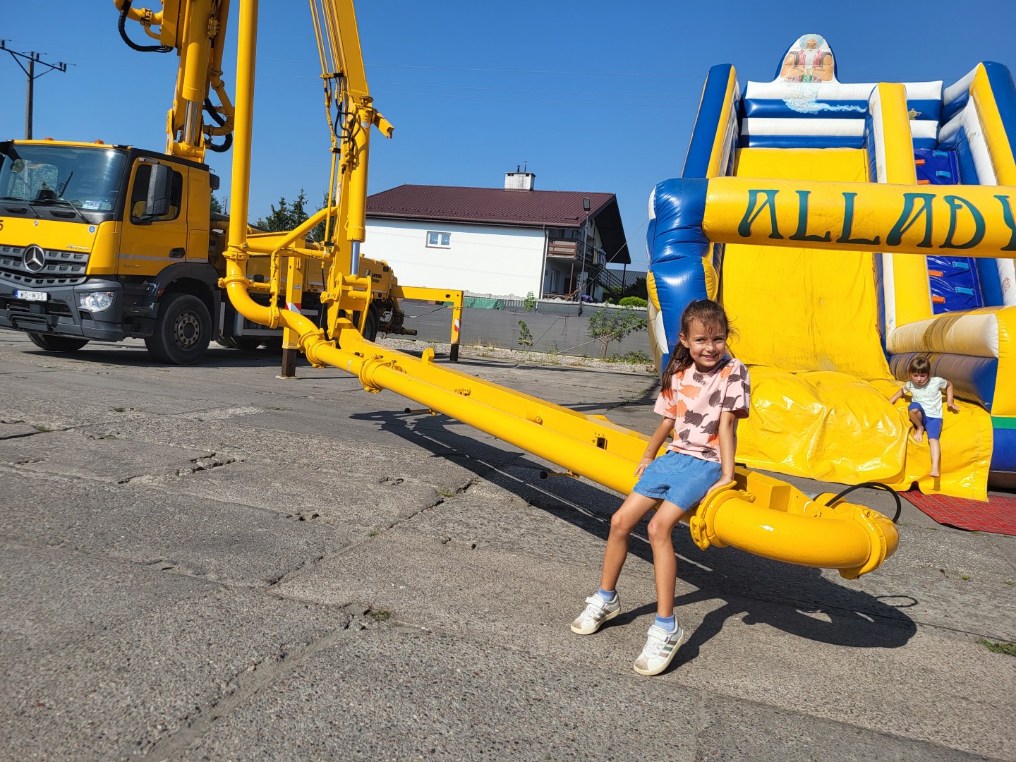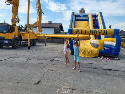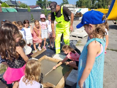 Na pewno niektórzy Tatusiowie mogą podpisać ze swoimi córkami umowę współpracy przy najbliższym remoncie lub budowie;) Dziewczynki oglądały sprzęt budowlany: pompy do betonu i pompogruszki oraz uczyły się nimi sterować. Tata Hani nadzorował proces wspólnego tworzenia betonu, w którym zostały odciśnięte dłonie, stopy i inne rysunki. Może w szkole przyda się kiedyś taka betonowa artystyczna płyta... Mama Hani oprowadziła nas po różnych częściach obiektu, gdzie mieszkało ptactwo domowe (kury, kaczki, gęsi, perliczki), psy, kameleon, kolorowe karpie koi i ogromne jesiotry, które lubią być głaskane:) Dziewczynki poznały również pracę groomera - specjalisty zajmującego się pielęgnacją zwierząt domowych. Kolejną atrakcją był dmuchaniec, a dzięki letniej pogodzie udała się kąpiel w basenie i zabawa na wodnej ślizgawce. Na koniec pojawił się urodzinowy tort Hani i radosne "Sto lat". Spełnienia marzeń, Haniu! Dziękujemy Pani Agnieszce i Panu Michałowi za zaangażowanie i ciepłe przyjęcie całej klasy.