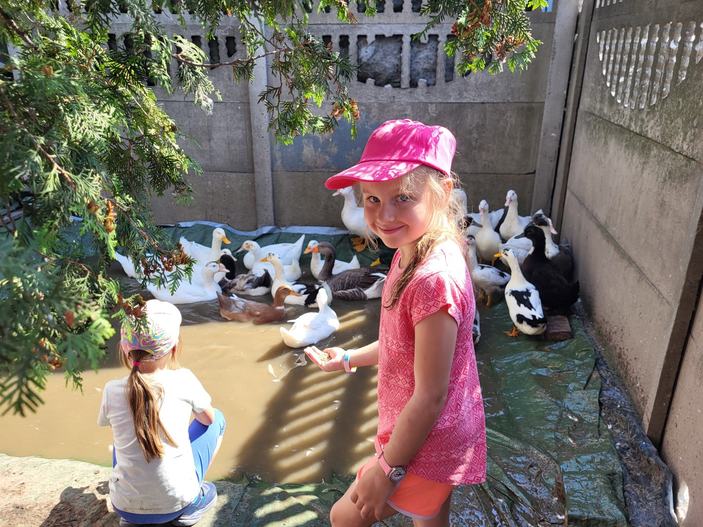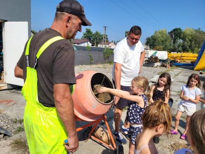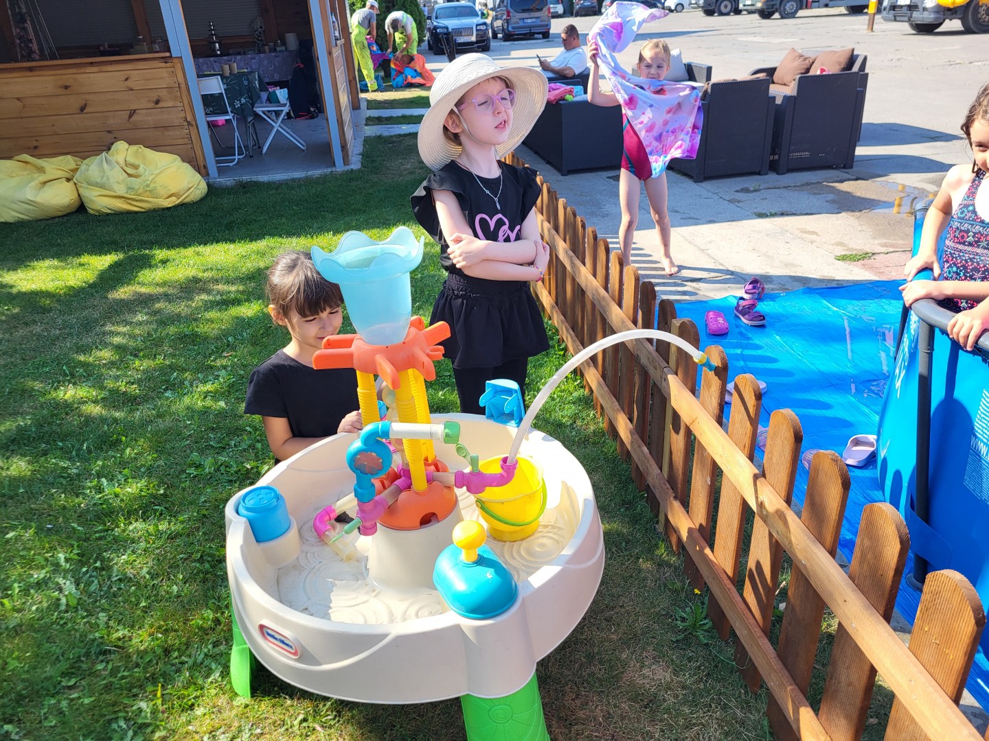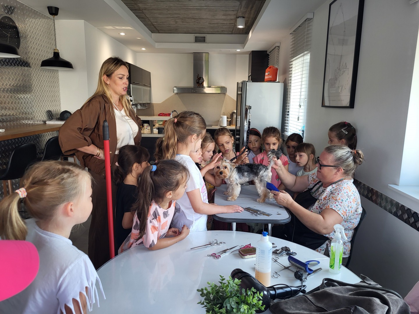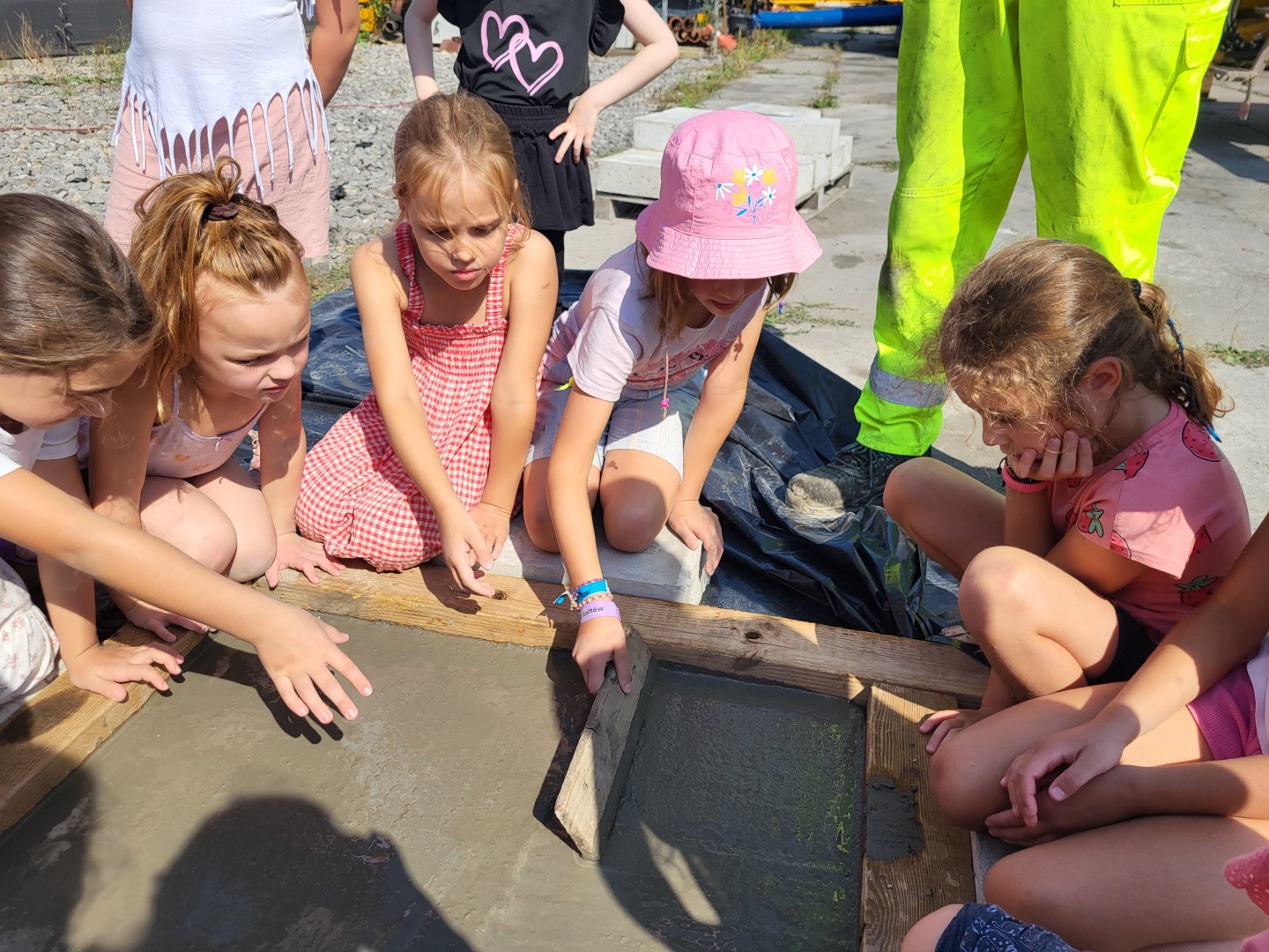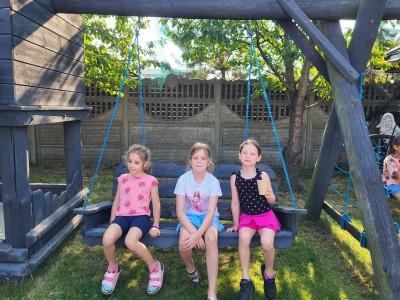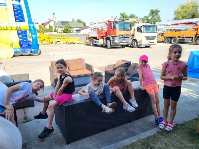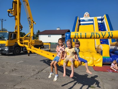 Na pewno niektórzy Tatusiowie mogą podpisać ze swoimi córkami umowę współpracy przy najbliższym remoncie lub budowie;) Dziewczynki oglądały sprzęt budowlany: pompy do betonu i pompogruszki oraz uczyły się nimi sterować. Tata Hani nadzorował proces wspólnego tworzenia betonu, w którym zostały odciśnięte dłonie, stopy i inne rysunki. Może w szkole przyda się kiedyś taka betonowa artystyczna płyta... Mama Hani oprowadziła nas po różnych częściach obiektu, gdzie mieszkało ptactwo domowe (kury, kaczki, gęsi, perliczki), psy, kameleon, kolorowe karpie koi i ogromne jesiotry, które lubią być głaskane:) Dziewczynki poznały również pracę groomera - specjalisty zajmującego się pielęgnacją zwierząt domowych. Kolejną atrakcją był dmuchaniec, a dzięki letniej pogodzie udała się kąpiel w basenie i zabawa na wodnej ślizgawce. Na koniec pojawił się urodzinowy tort Hani i radosne "Sto lat". Spełnienia marzeń, Haniu! Dziękujemy Pani Agnieszce i Panu Michałowi za zaangażowanie i ciepłe przyjęcie całej klasy.