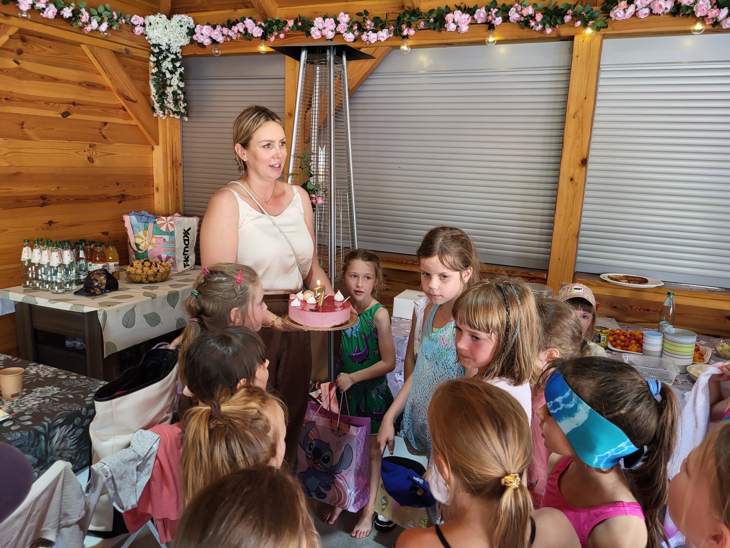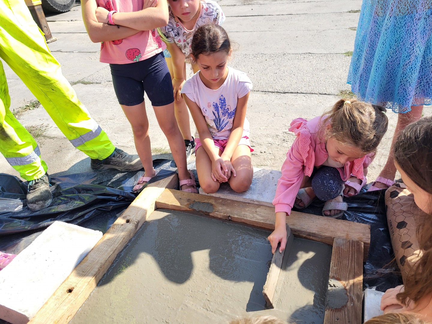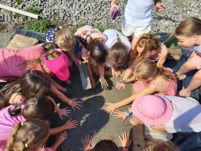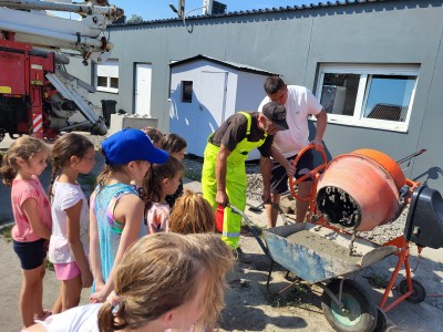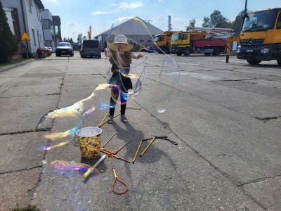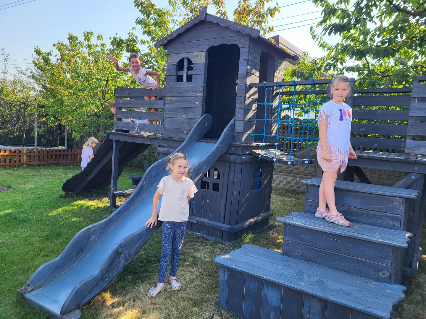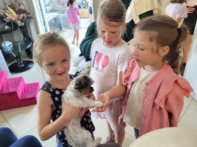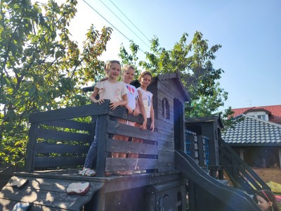 Na pewno niektórzy Tatusiowie mogą podpisać ze swoimi córkami umowę współpracy przy najbliższym remoncie lub budowie;) Dziewczynki oglądały sprzęt budowlany: pompy do betonu i pompogruszki oraz uczyły się nimi sterować. Tata Hani nadzorował proces wspólnego tworzenia betonu, w którym zostały odciśnięte dłonie, stopy i inne rysunki. Może w szkole przyda się kiedyś taka betonowa artystyczna płyta... Mama Hani oprowadziła nas po różnych częściach obiektu, gdzie mieszkało ptactwo domowe (kury, kaczki, gęsi, perliczki), psy, kameleon, kolorowe karpie koi i ogromne jesiotry, które lubią być głaskane:) Dziewczynki poznały również pracę groomera - specjalisty zajmującego się pielęgnacją zwierząt domowych. Kolejną atrakcją był dmuchaniec, a dzięki letniej pogodzie udała się kąpiel w basenie i zabawa na wodnej ślizgawce. Na koniec pojawił się urodzinowy tort Hani i radosne "Sto lat". Spełnienia marzeń, Haniu! Dziękujemy Pani Agnieszce i Panu Michałowi za zaangażowanie i ciepłe przyjęcie całej klasy.