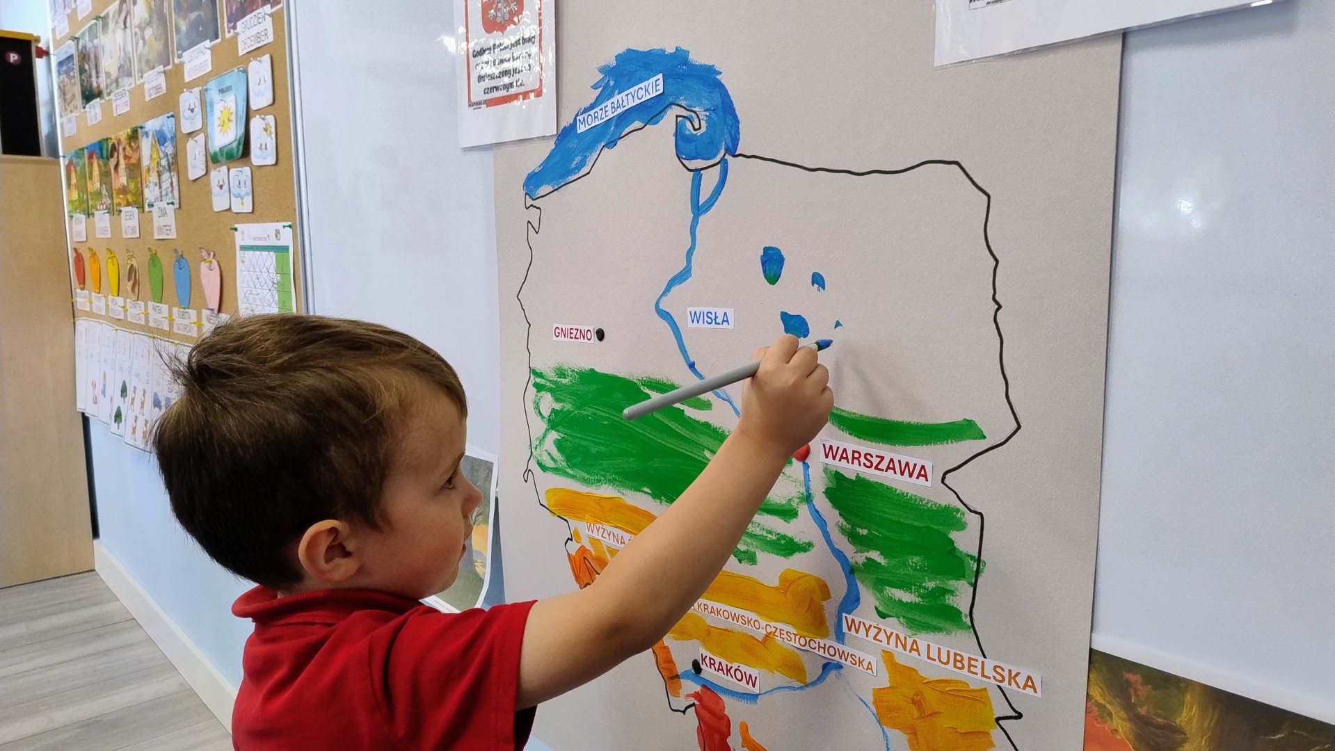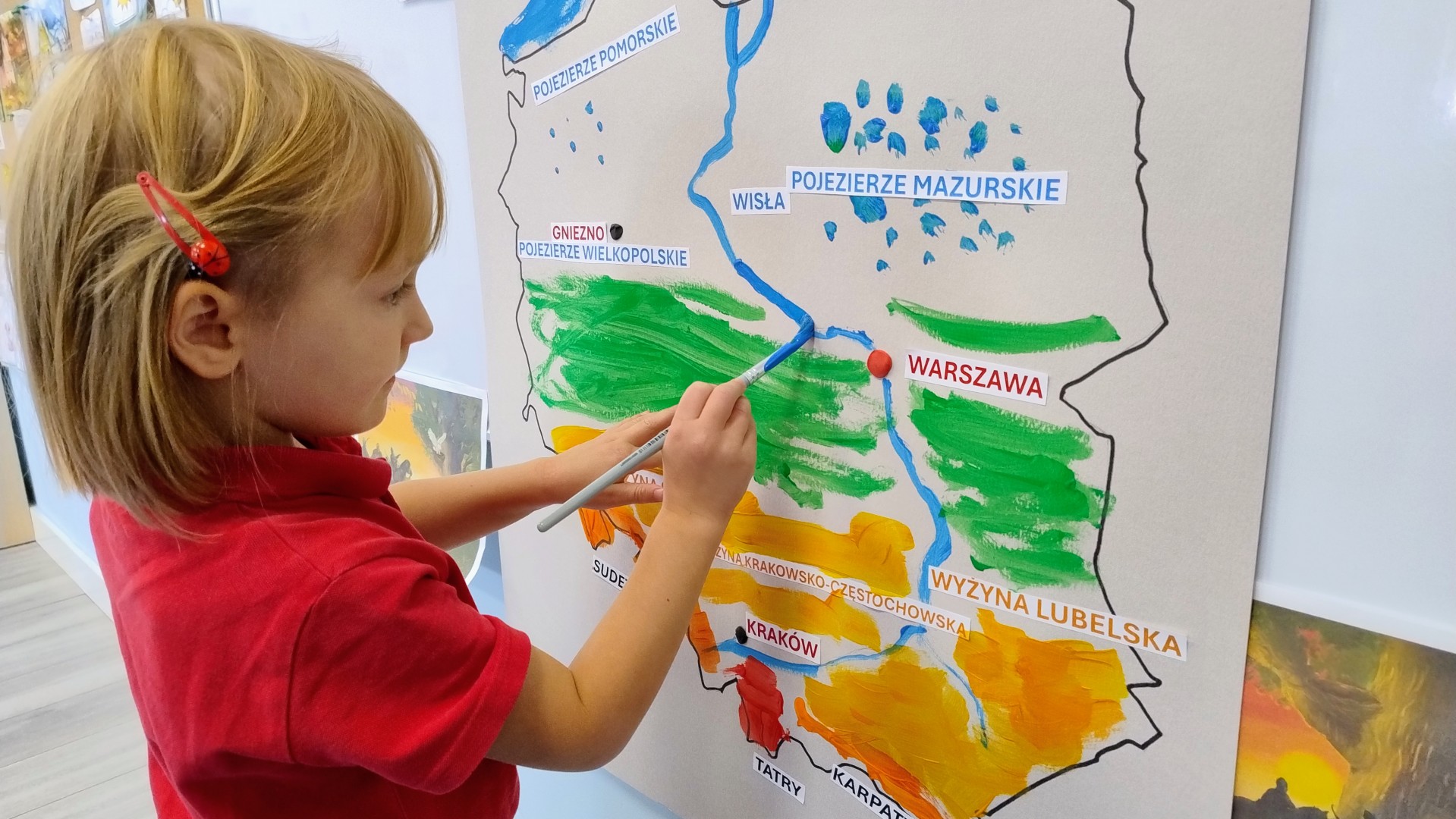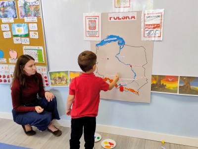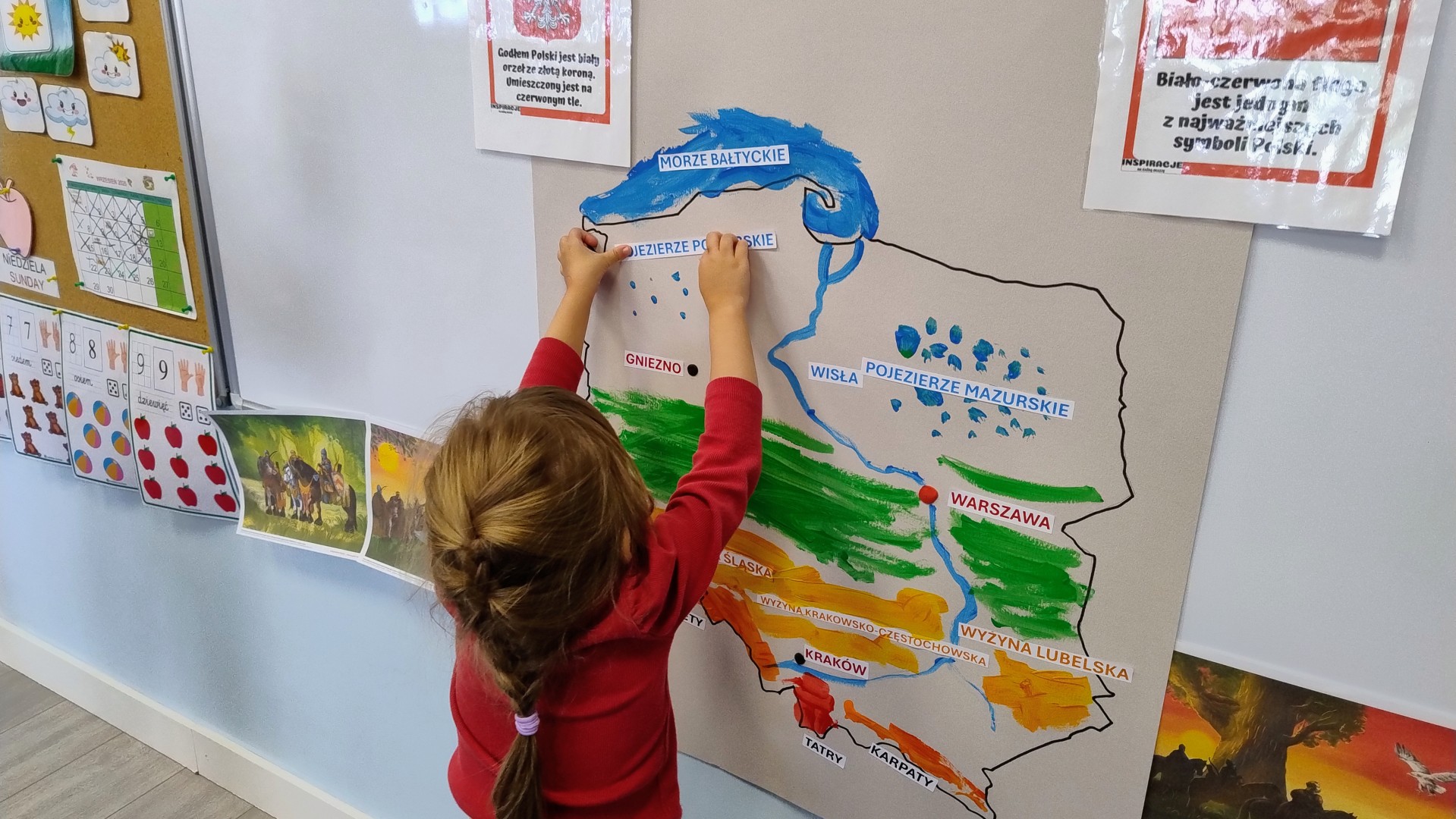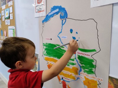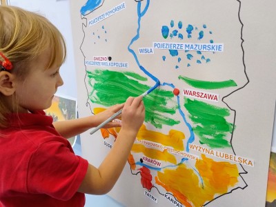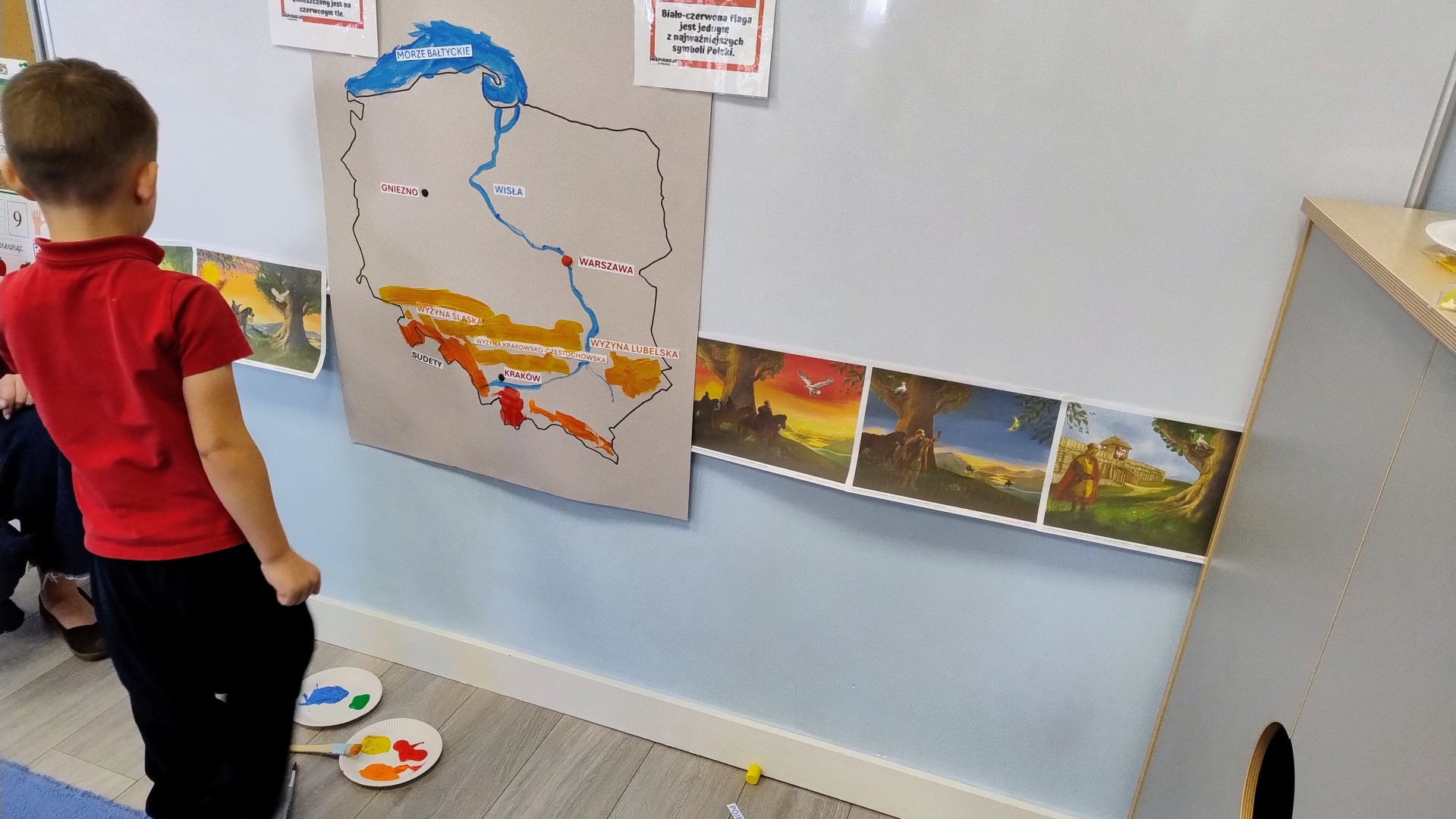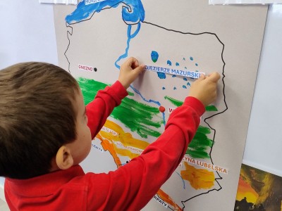 Następnie rozmawialiśmy o dawnych i obecnych stolicach Polski. Przedszkolaki przypomniały sobie również nasze symbole narodowe: flagę, godło i hymn. Zajęcia zakończyliśmy wspólnym tworzeniem dużej mapy Polski – dzieci z zaangażowaniem zaznaczały najważniejsze miasta, rzeki i góry.