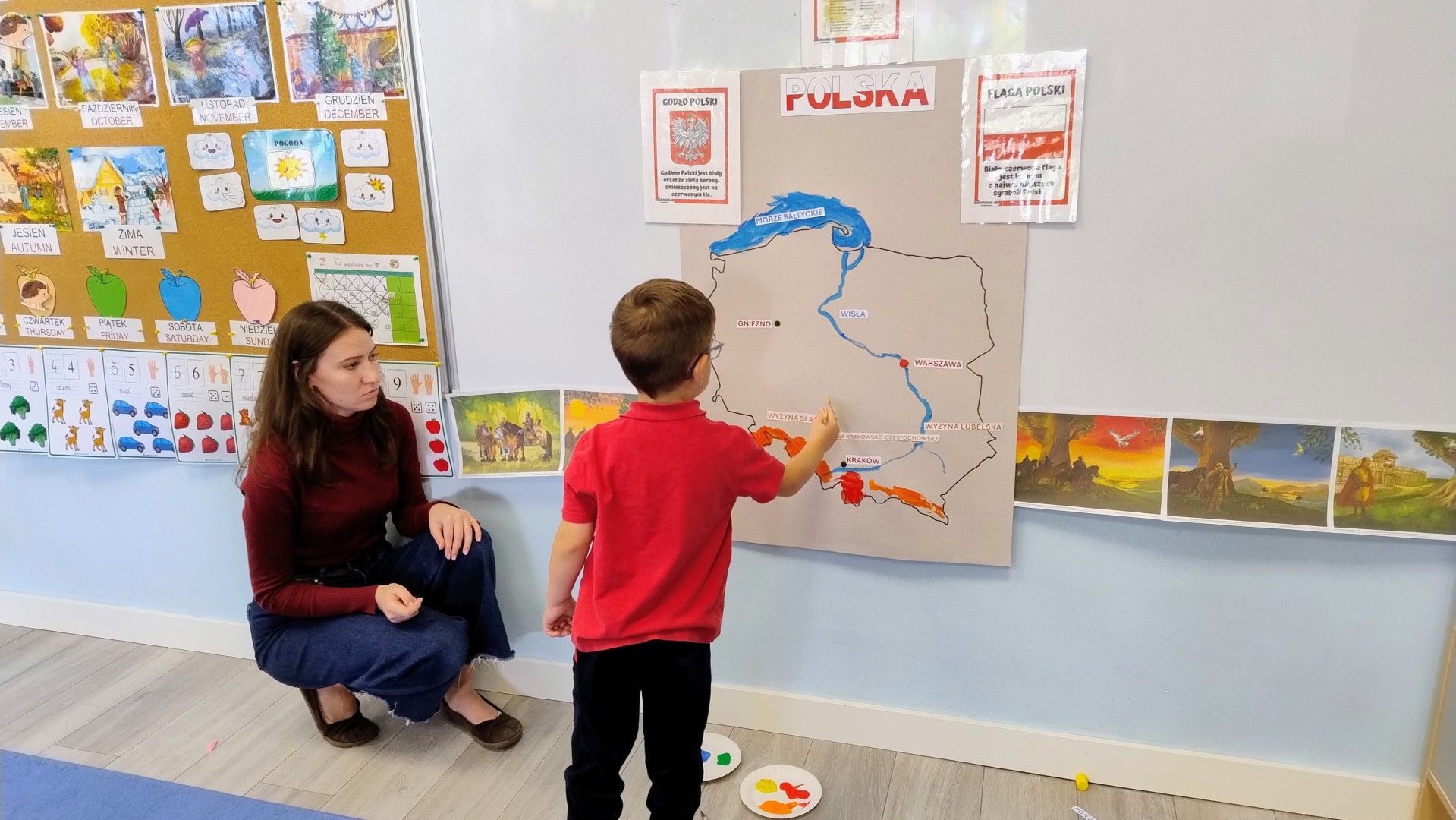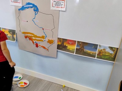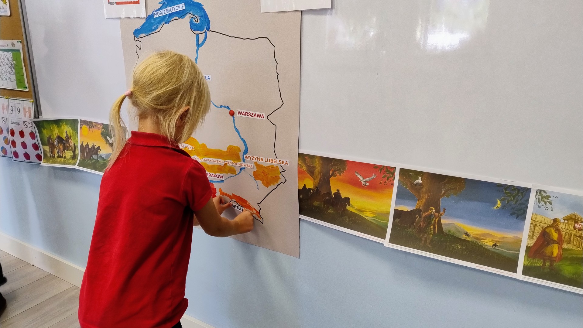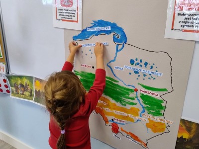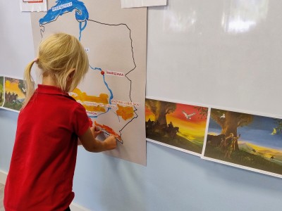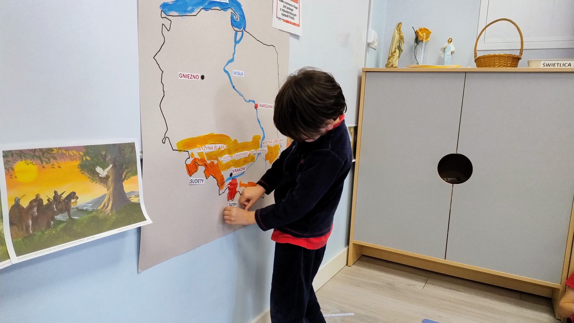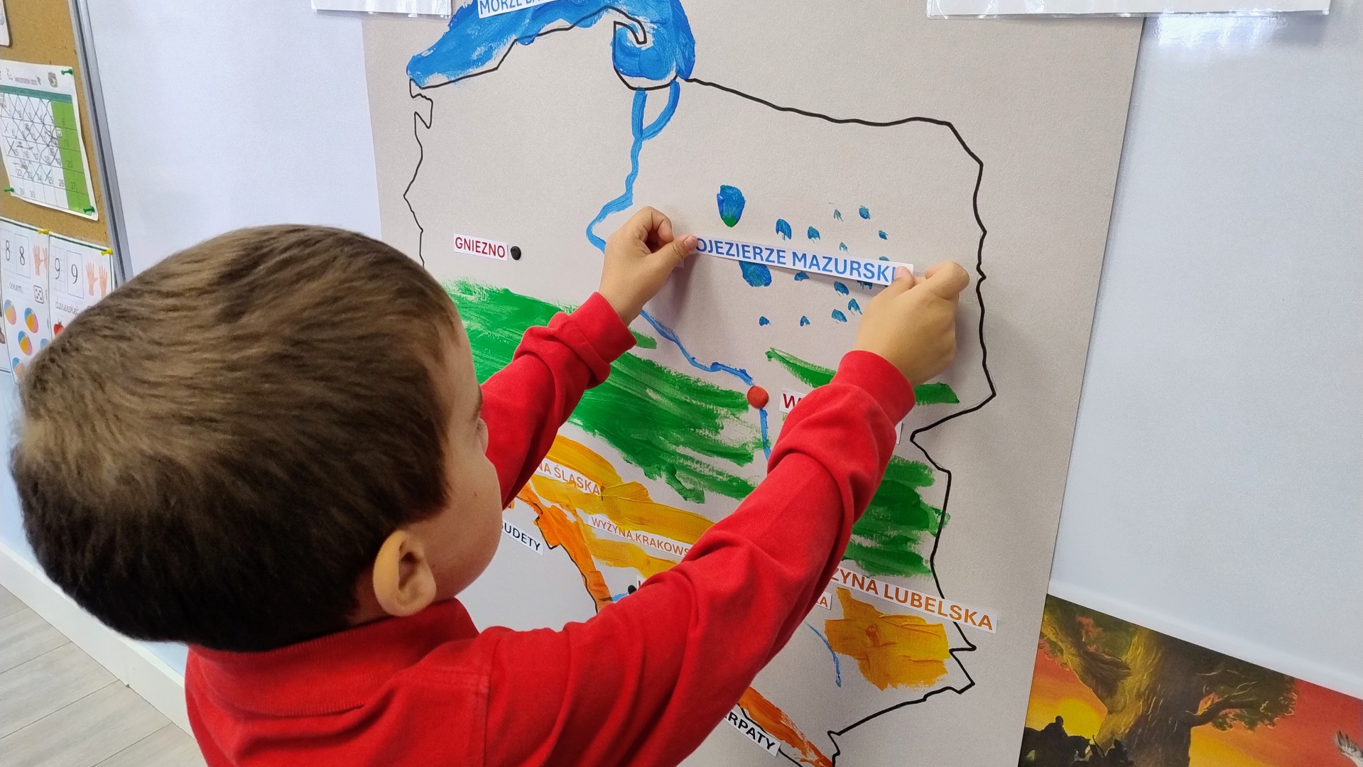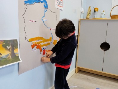 Następnie rozmawialiśmy o dawnych i obecnych stolicach Polski. Przedszkolaki przypomniały sobie również nasze symbole narodowe: flagę, godło i hymn. Zajęcia zakończyliśmy wspólnym tworzeniem dużej mapy Polski – dzieci z zaangażowaniem zaznaczały najważniejsze miasta, rzeki i góry.