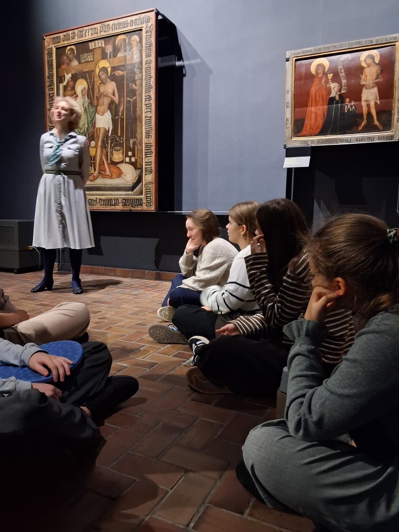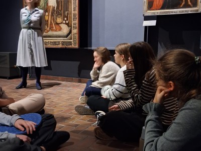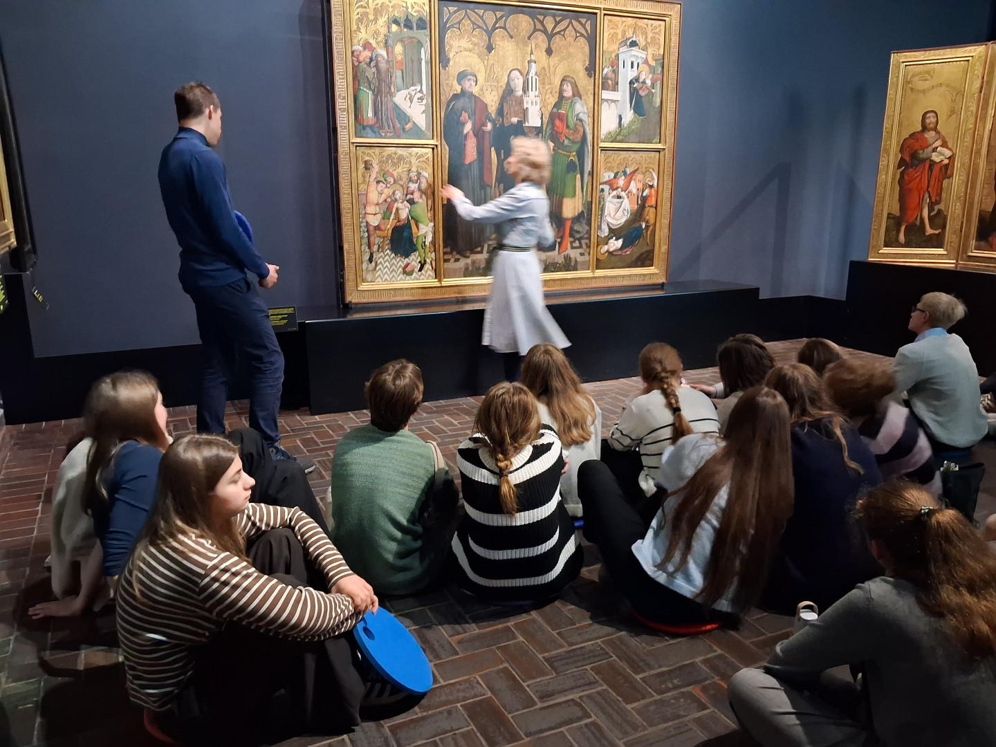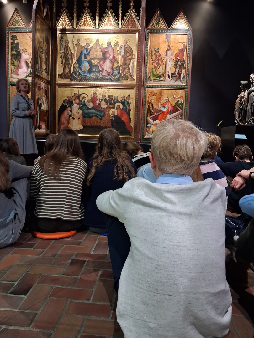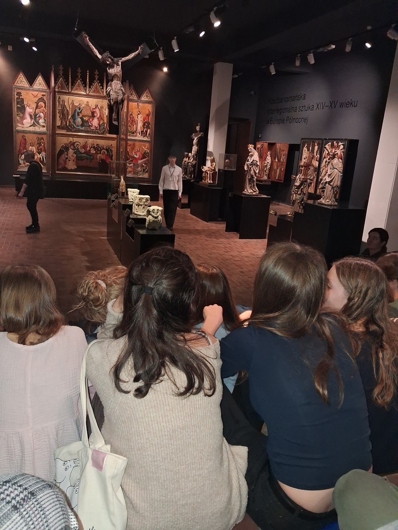 Spotkanie w galerii było okazją do rozmowy o trwającej blisko tysiąc lat epoce średniowiecza. Uczniowie obejrzeli nastawy ołtarzowe, rzeźby polichromowane, malarskie cykle narracyjne i przykłady rzemiosła artystycznego.