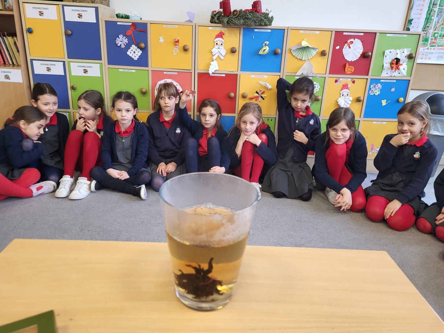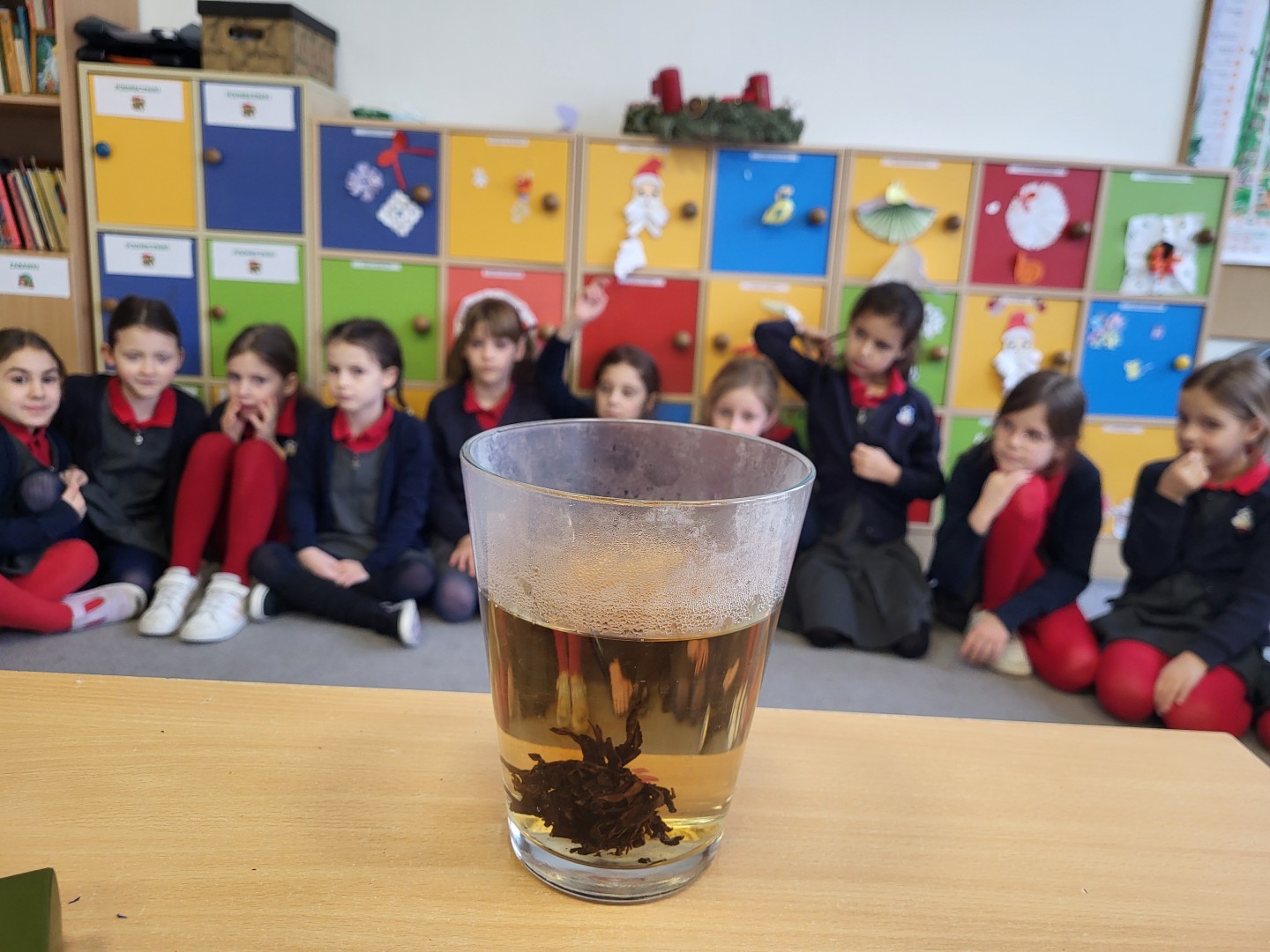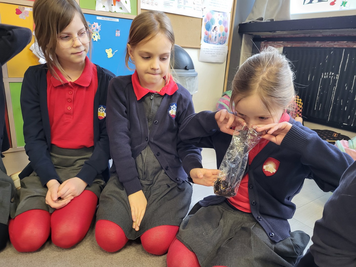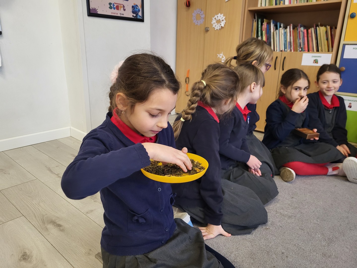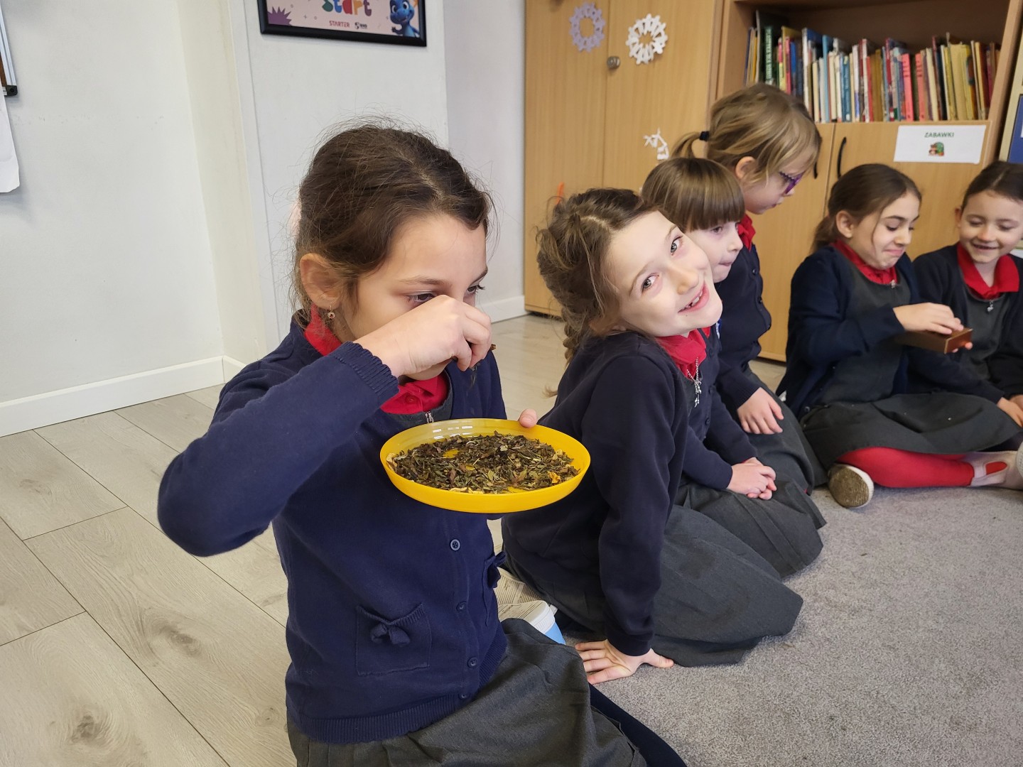 Przy tej okazji dowiedziały się, skąd pochodzi herbata, w jakiej formie rośnie i jak przebiega proces jej zrywania, co nie jest takie oczywiste. Rozpoznały wielozmysłowo różne rodzaje herbaty: czarne, zielone i owocowe. Wśród aromatów odnalazły też herbaty ziołowe takie jak mięta i rumianek. Na koniec wspólnie obserwowały, co się stanie z herbacianym kwiatem zwiniętym w kulkę, który został zalany wrzątkiem.