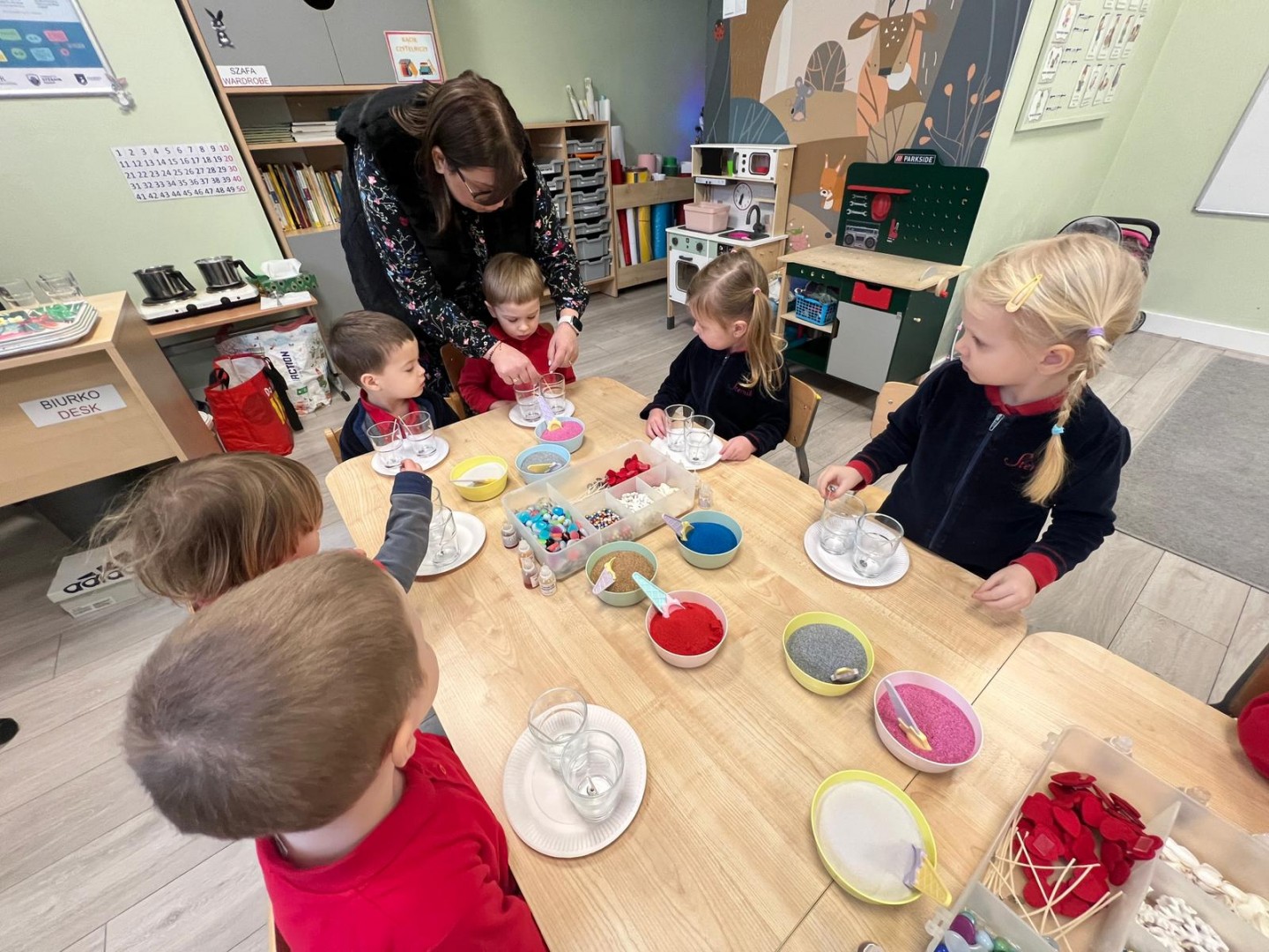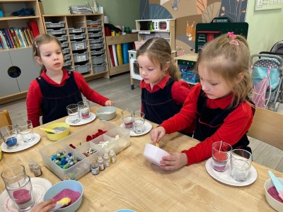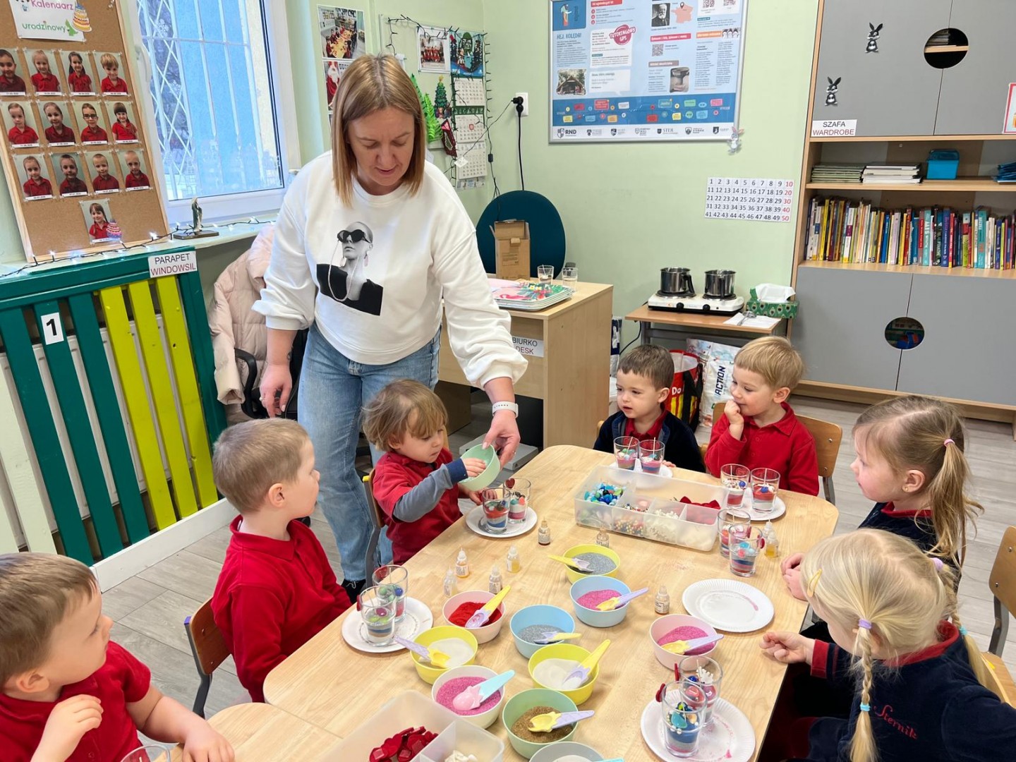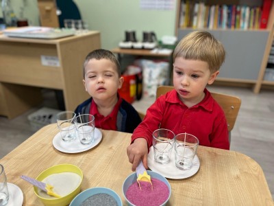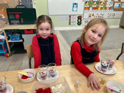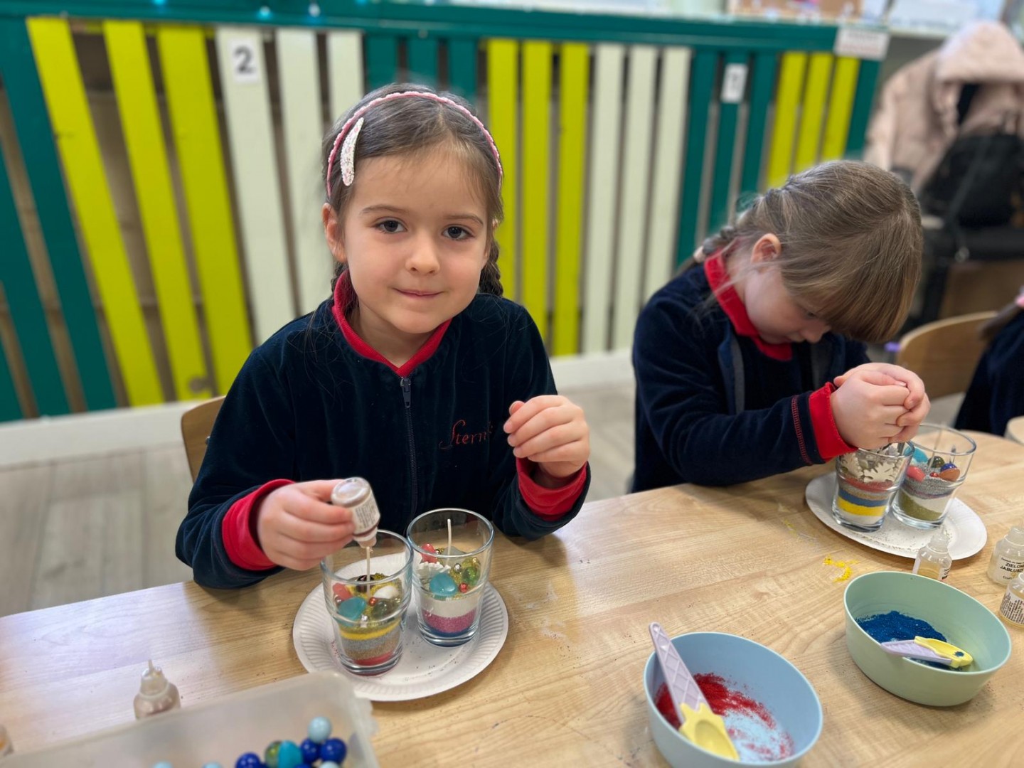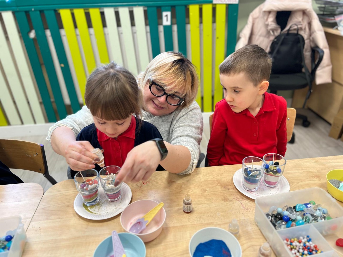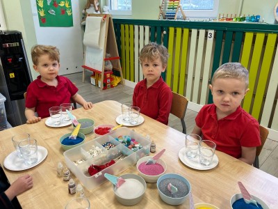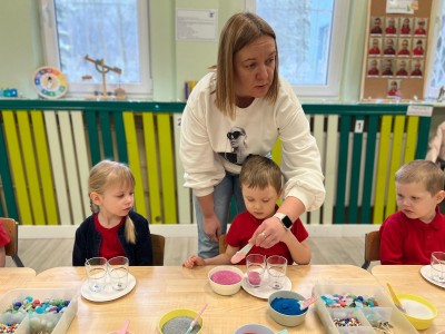 Powstałe prace będą pięknym i niepowtarzalnym prezentem dla Dziadków z okazji ich święta. Dzieci z wielkim zainteresowaniem i zaangażowaniem wsypywały kolorowy piasek do szklanych pojemniczków, tworząc barwne warstwy. Następnie dekorowały swoje prace kolorowymi kulkami, muszelkami oraz kamykami, dobierając ozdoby według własnych pomysłów. Każda świeca była inna i wyjątkowa, co podkreślało kreatywność oraz indywidualność małych twórców. Warsztaty sprawiły dzieciom wiele radości, a jednocześnie rozwijały ich zdolności manualne, wyobraźnię oraz umiejętność skupienia. Przedszkolaki z dumą prezentowały swoje prace, wkładając w nie dużo serca i wysiłku. Jesteśmy przekonani, że własnoręcznie wykonane świece sprawią Dziadkom ogromną radość i będą miłą pamiątką od wnucząt.