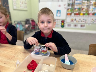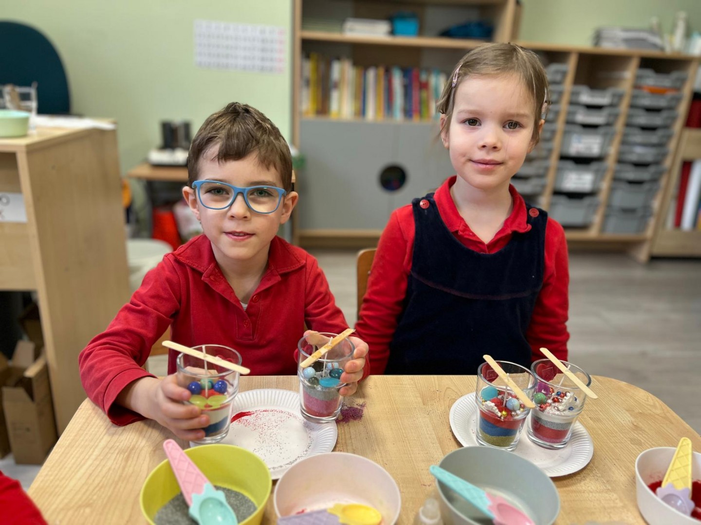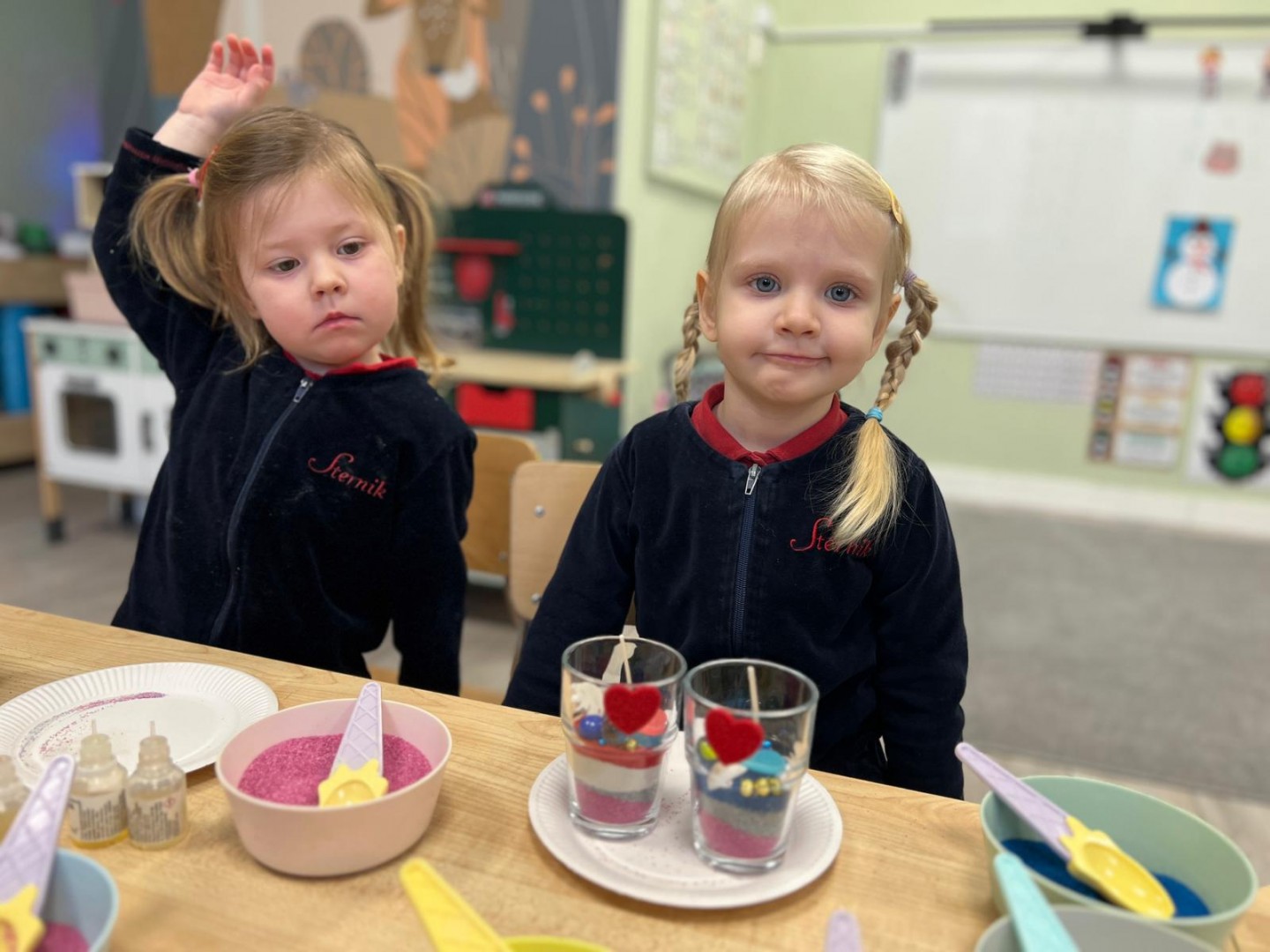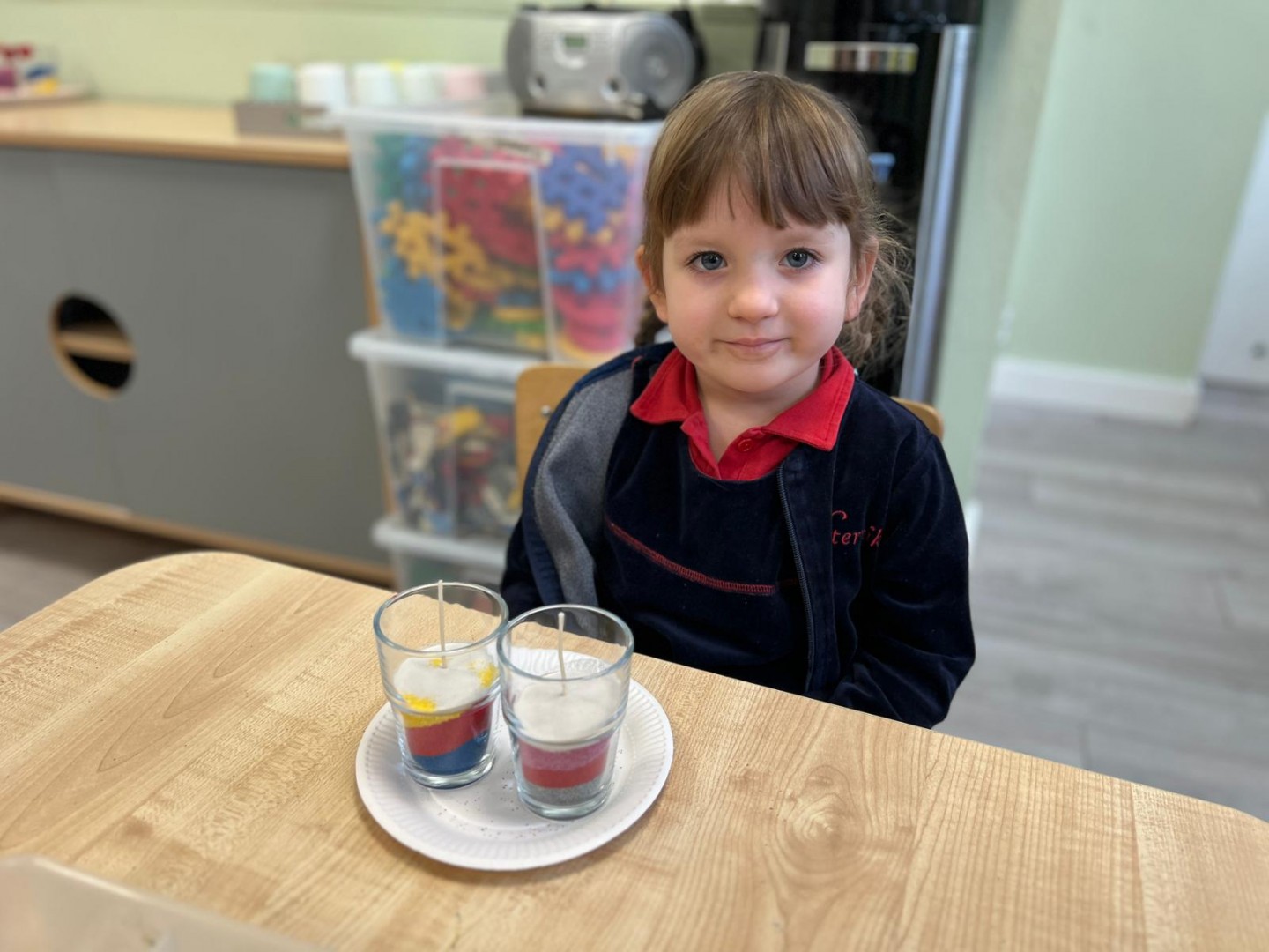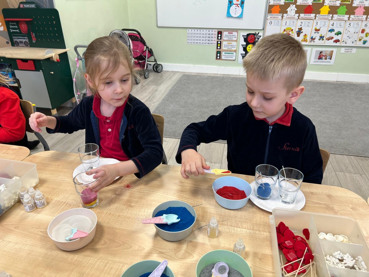 Powstałe prace będą pięknym i niepowtarzalnym prezentem dla Dziadków z okazji ich święta. Dzieci z wielkim zainteresowaniem i zaangażowaniem wsypywały kolorowy piasek do szklanych pojemniczków, tworząc barwne warstwy. Następnie dekorowały swoje prace kolorowymi kulkami, muszelkami oraz kamykami, dobierając ozdoby według własnych pomysłów. Każda świeca była inna i wyjątkowa, co podkreślało kreatywność oraz indywidualność małych twórców. Warsztaty sprawiły dzieciom wiele radości, a jednocześnie rozwijały ich zdolności manualne, wyobraźnię oraz umiejętność skupienia. Przedszkolaki z dumą prezentowały swoje prace, wkładając w nie dużo serca i wysiłku. Jesteśmy przekonani, że własnoręcznie wykonane świece sprawią Dziadkom ogromną radość i będą miłą pamiątką od wnucząt.