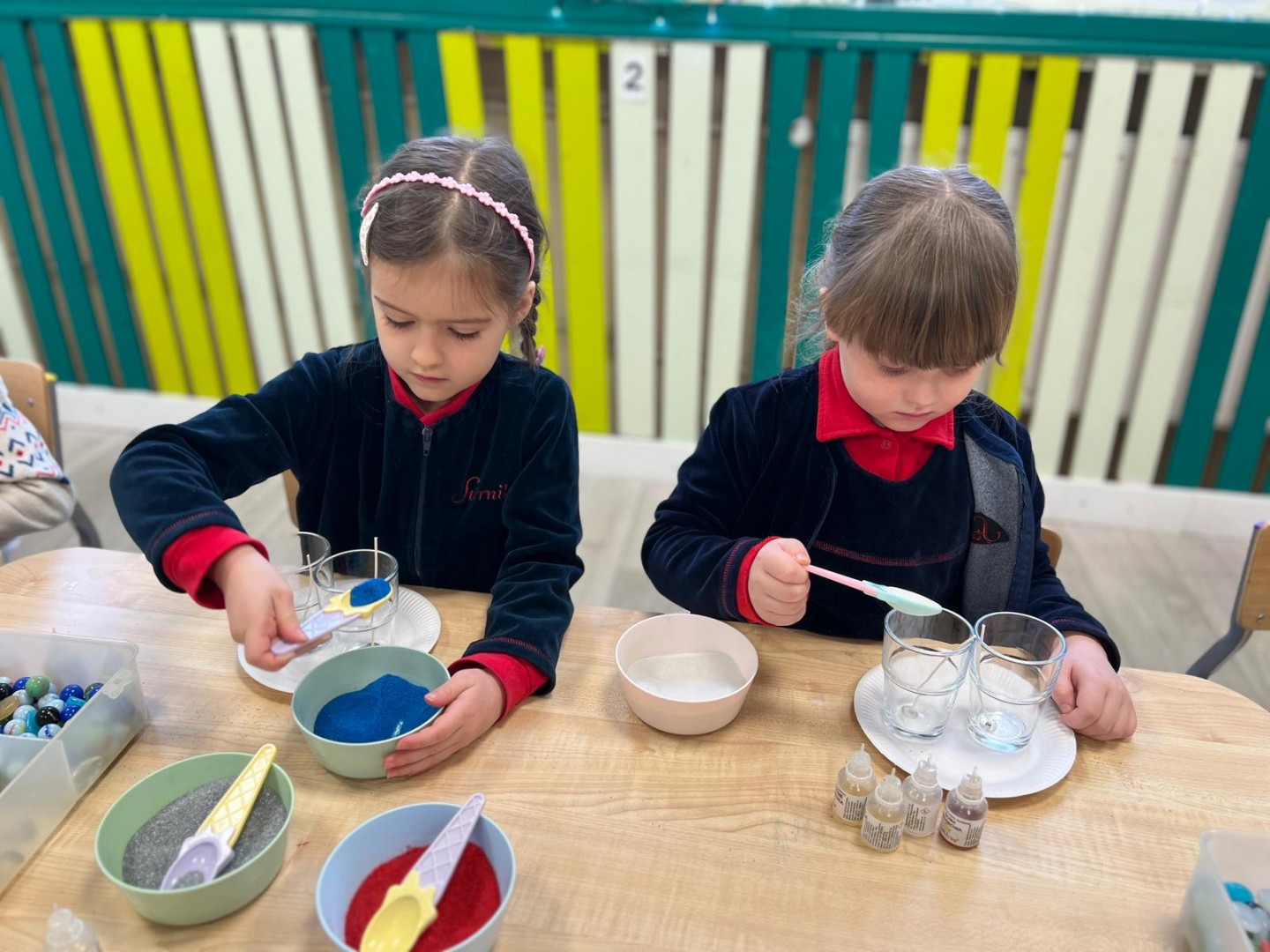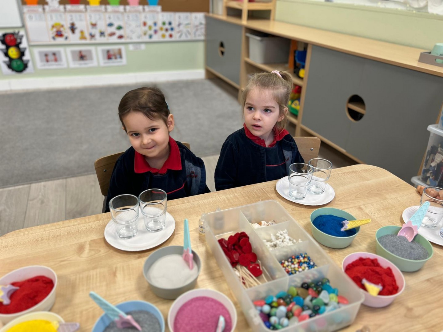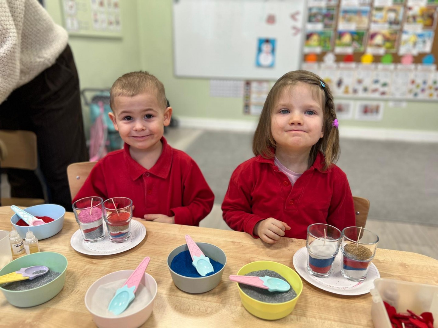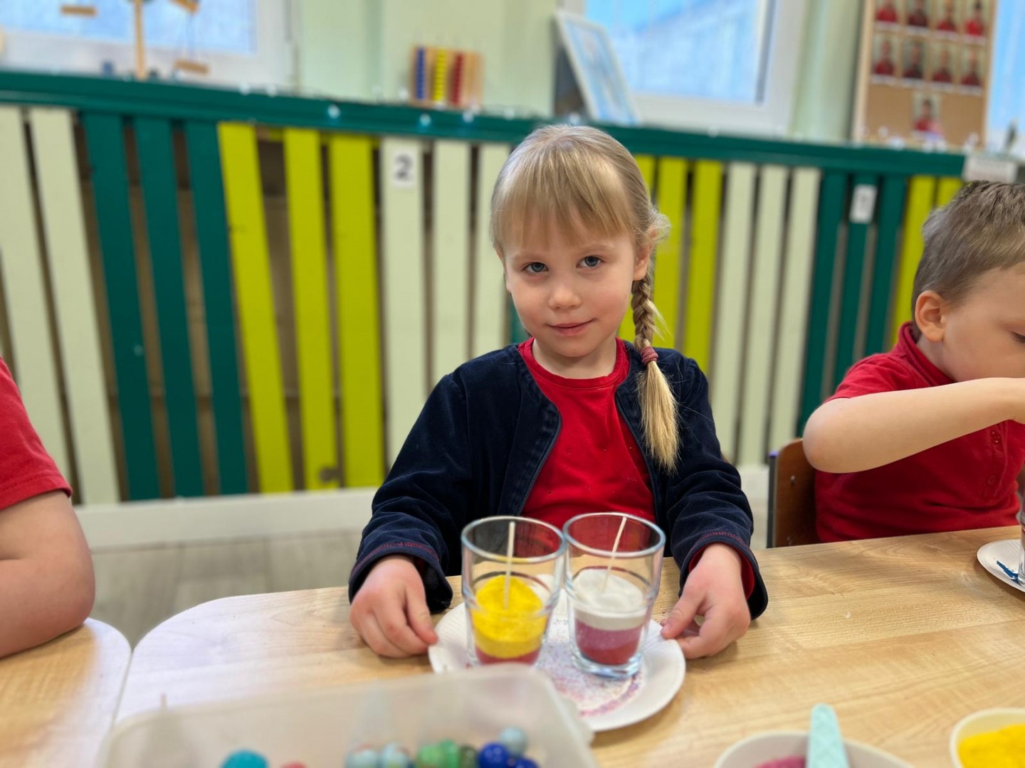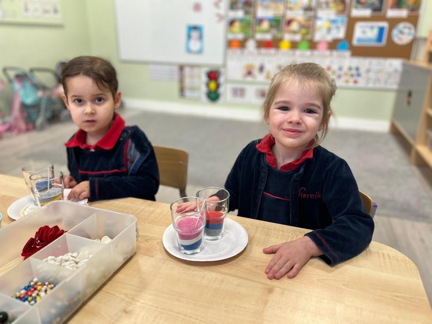 Powstałe prace będą pięknym i niepowtarzalnym prezentem dla Dziadków z okazji ich święta. Dzieci z wielkim zainteresowaniem i zaangażowaniem wsypywały kolorowy piasek do szklanych pojemniczków, tworząc barwne warstwy. Następnie dekorowały swoje prace kolorowymi kulkami, muszelkami oraz kamykami, dobierając ozdoby według własnych pomysłów. Każda świeca była inna i wyjątkowa, co podkreślało kreatywność oraz indywidualność małych twórców. Warsztaty sprawiły dzieciom wiele radości, a jednocześnie rozwijały ich zdolności manualne, wyobraźnię oraz umiejętność skupienia. Przedszkolaki z dumą prezentowały swoje prace, wkładając w nie dużo serca i wysiłku. Jesteśmy przekonani, że własnoręcznie wykonane świece sprawią Dziadkom ogromną radość i będą miłą pamiątką od wnucząt.