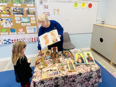 W zeszłym tygodniu przedszkolaków odwiedził wyjątkowy gość – babcia Klary, pani Anna Meisenhalter Crisantii, ikonopisarka i malarka, która opowiedziała dzieciom o swojej niezwykłej pracy.