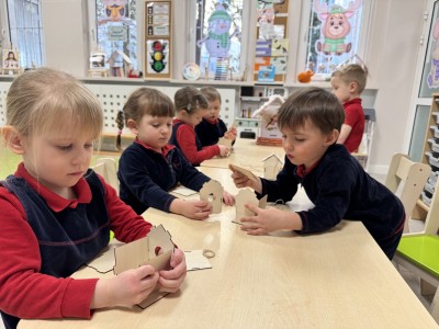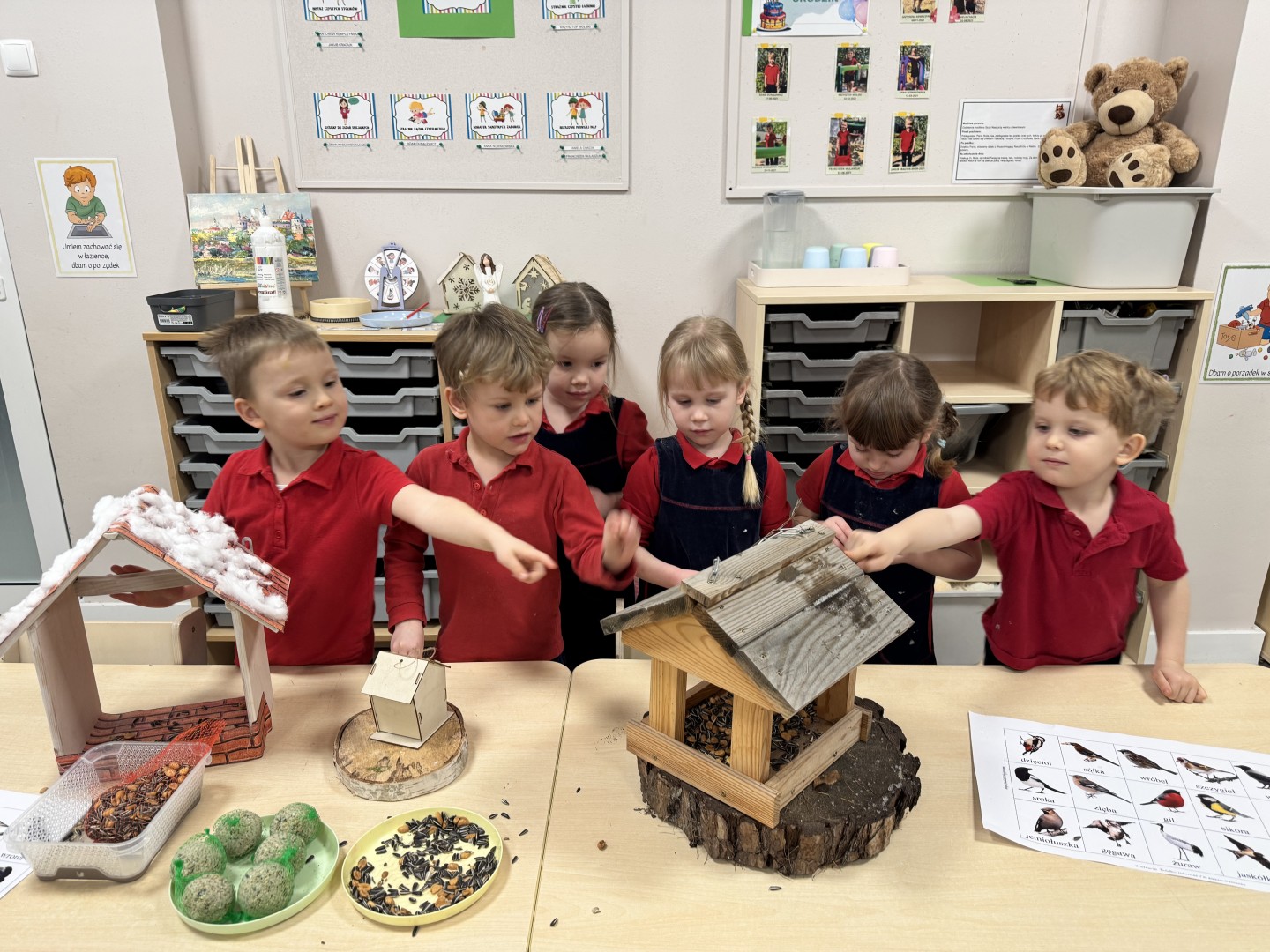 W części praktycznej dzieci samodzielnie wykonały drewniany karmnik, każde dziecko wybierało swojego ptaszka, następnie wycinało go i dopasowywało do karmnika, ucząc się, jaki pokarm i jakie miejsce są odpowiednie dla danego gatunku.