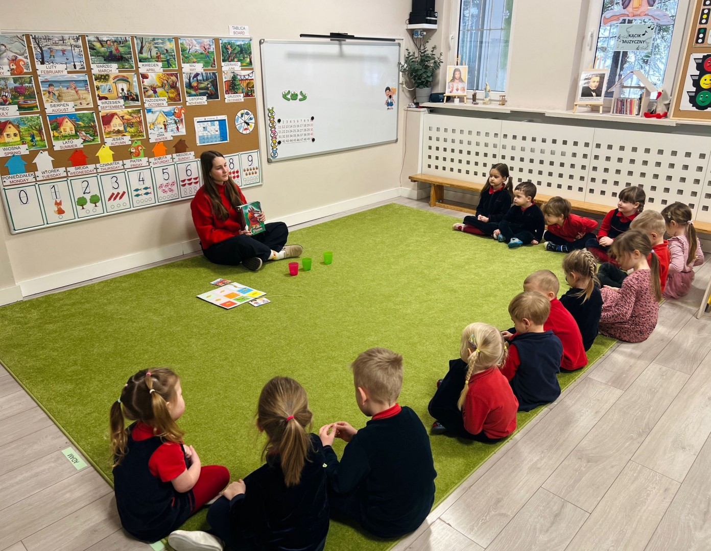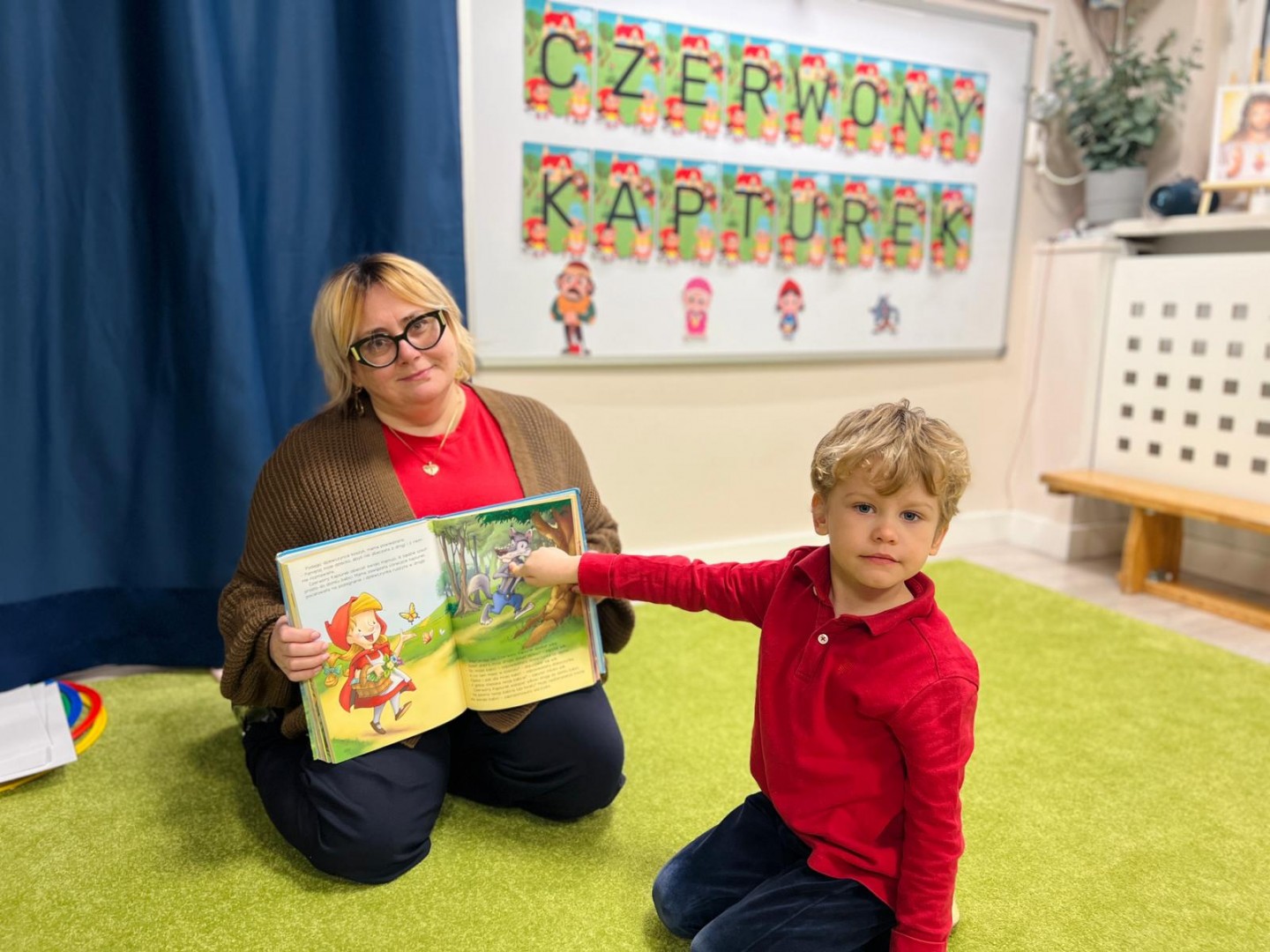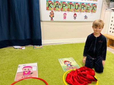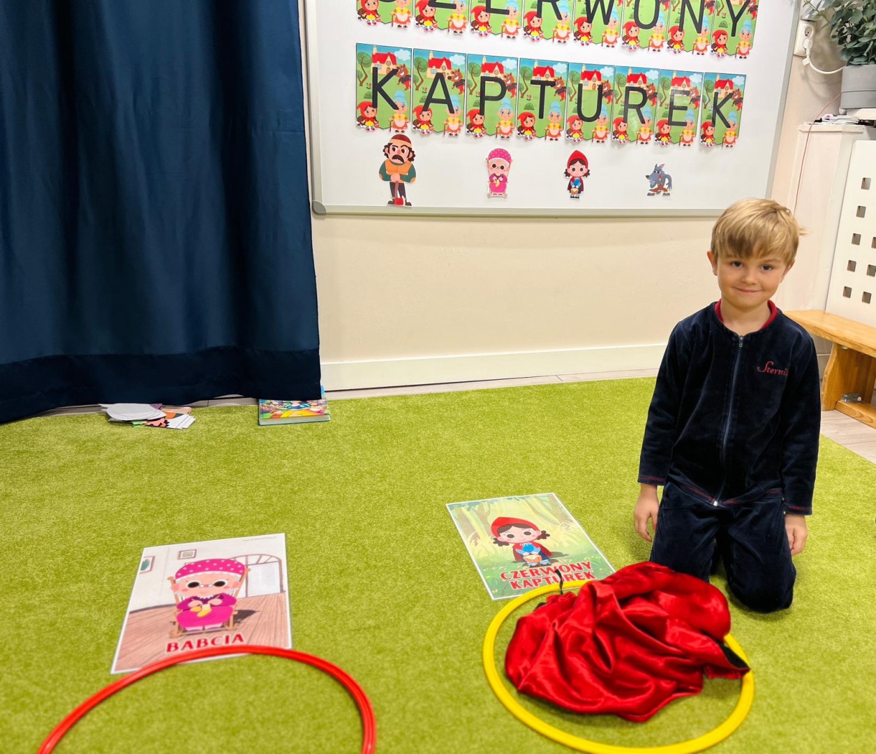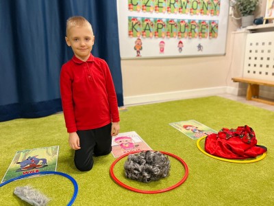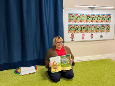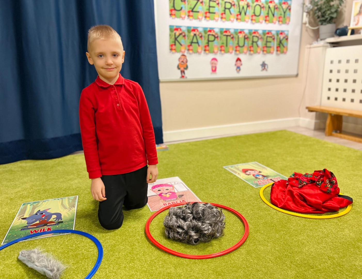 Dzieci zapoznały się z treścią bajki "Czerwony Kapturek". Po wysłuchaniu opowiadania aktywnie uczestniczyły w zabawach ruchowych inspirowanych jego treścią, naśladowały ruchy bohaterów oraz poruszały się po „lesie”, rozwijając wyobraźnię i sprawność ruchową. Następnie dzieci rozpoznawały i kategoryzowały przedmioty związane z bajką, ćwicząc spostrzegawczość oraz umiejętność logicznego myślenia. Na zakończenie zajęć dzieci zapoznały się z mottem bajki: "Bądź ostrożny i słuchaj dobrych rad", które stało się punktem wyjścia do rozmowy o bezpieczeństwie i właściwych zachowania.