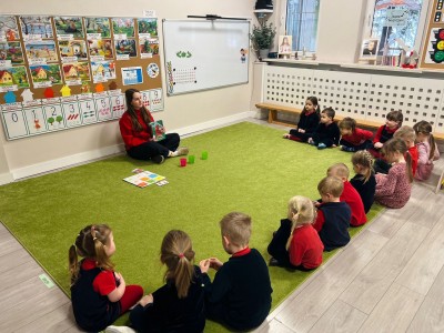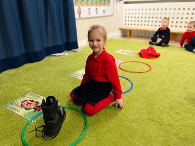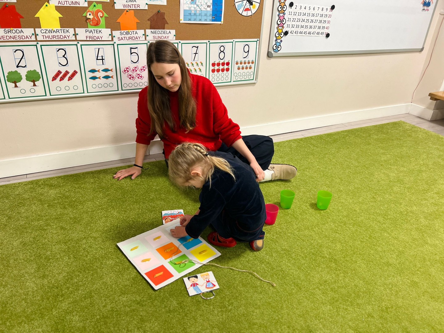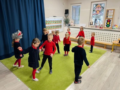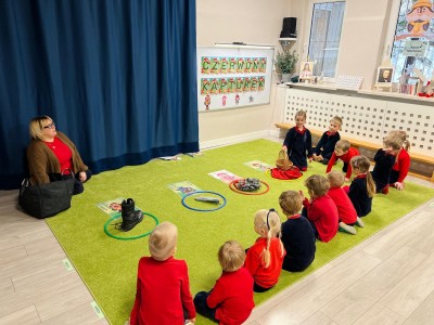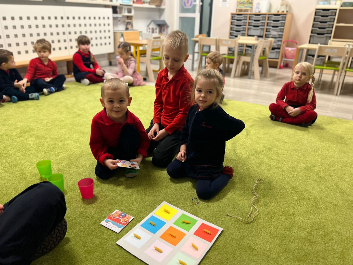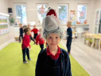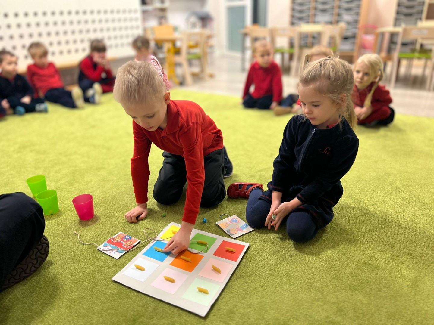 Dzieci zapoznały się z treścią bajki "Czerwony Kapturek". Po wysłuchaniu opowiadania aktywnie uczestniczyły w zabawach ruchowych inspirowanych jego treścią, naśladowały ruchy bohaterów oraz poruszały się po „lesie”, rozwijając wyobraźnię i sprawność ruchową. Następnie dzieci rozpoznawały i kategoryzowały przedmioty związane z bajką, ćwicząc spostrzegawczość oraz umiejętność logicznego myślenia. Na zakończenie zajęć dzieci zapoznały się z mottem bajki: "Bądź ostrożny i słuchaj dobrych rad", które stało się punktem wyjścia do rozmowy o bezpieczeństwie i właściwych zachowania.