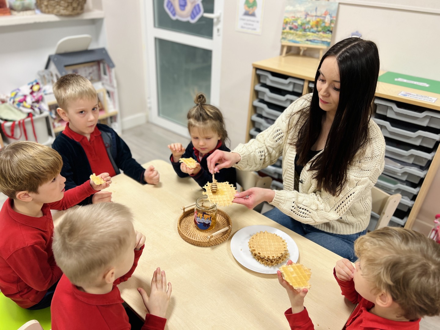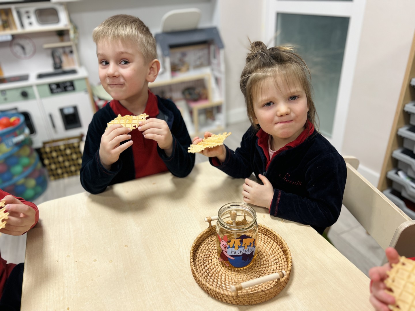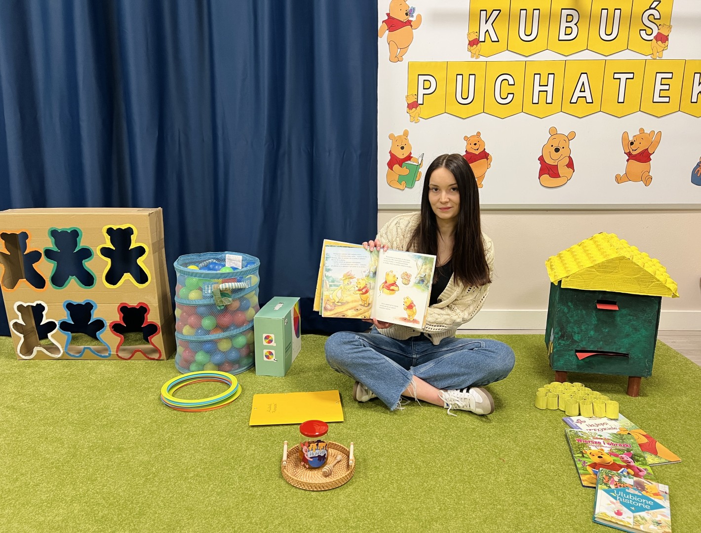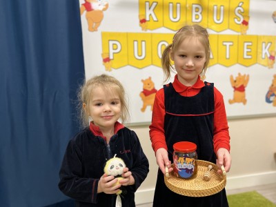 Dzieci wysłuchały bajki pt. „Kubuś i przyjaciele – dzień w ogrodzie”, która wprowadziła je w radosny, bajkowy nastrój. Podczas zajęć przedszkolaki dowiedziały się, co misie lubią jeść najbardziej – „małe co nieco”, czyli miodek.