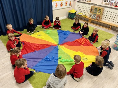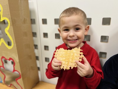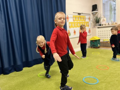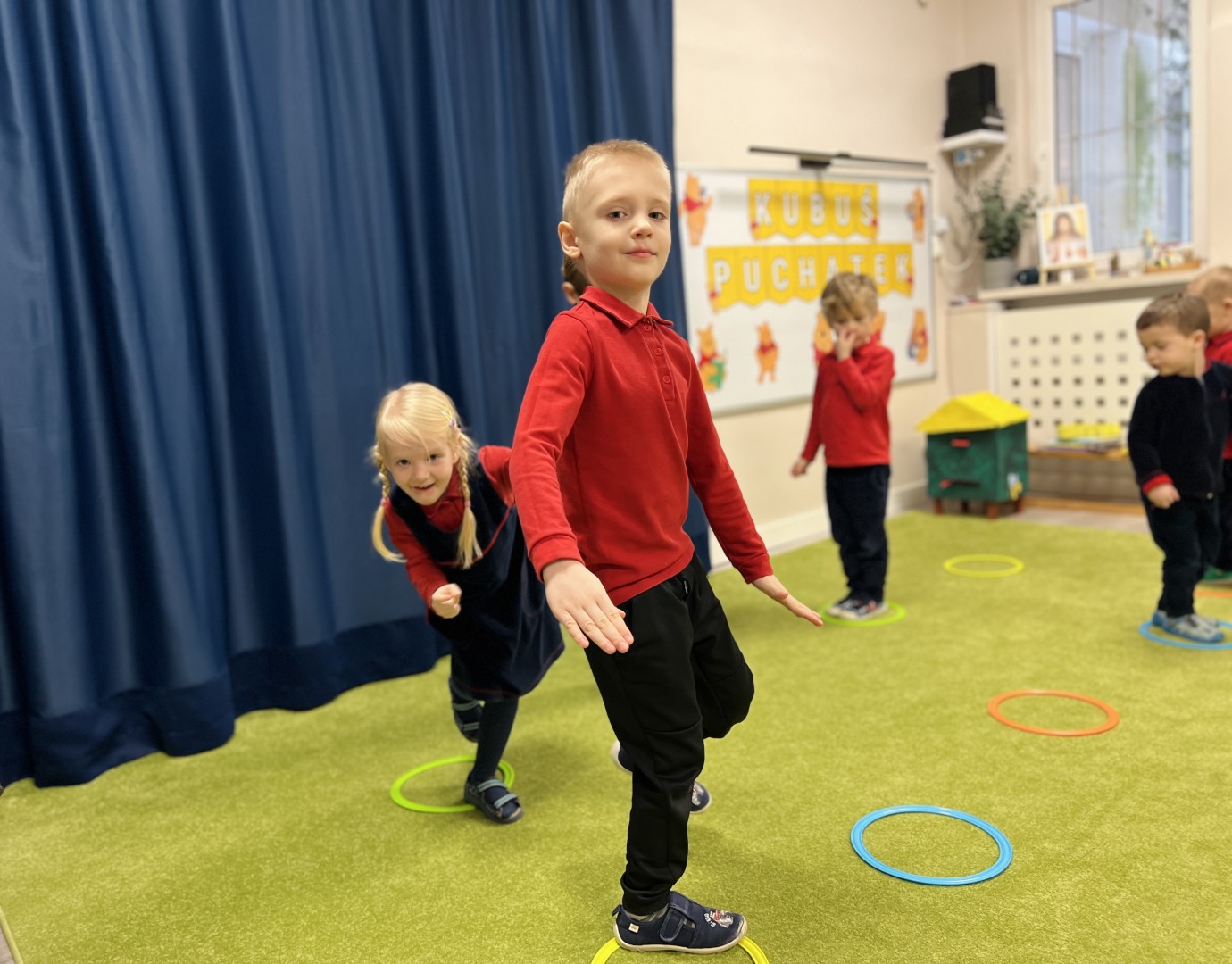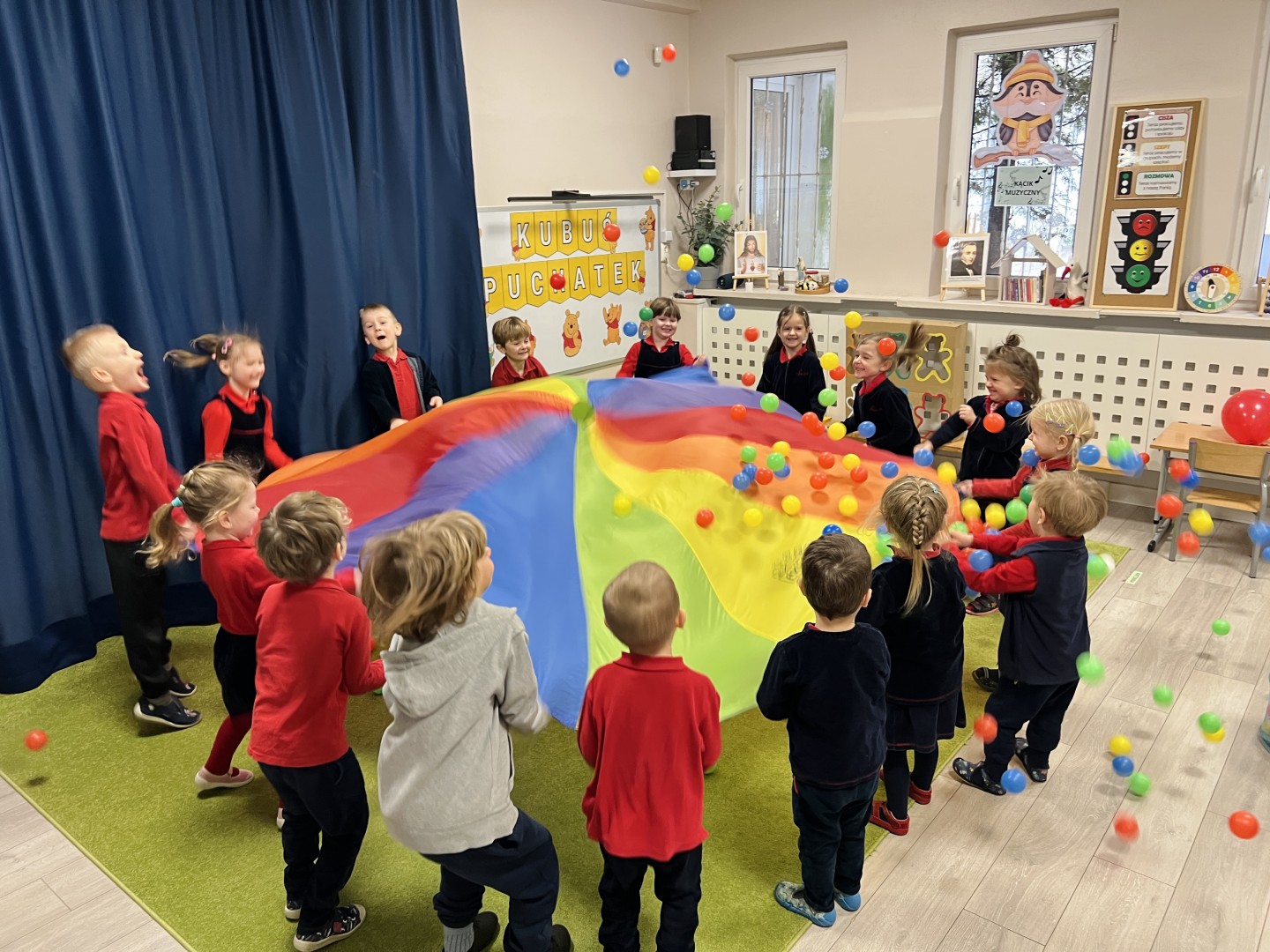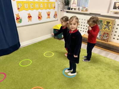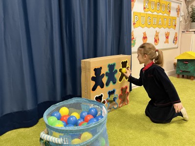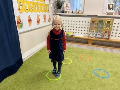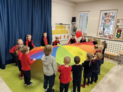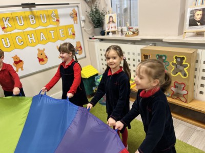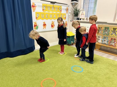 W dalszej części zajęć odbyły się zabawy ruchowe z wykorzystaniem chusty animacyjnej, a także rzut do celu – dopasowywanie odpowiedniego koloru misia. Dużo radości sprawiła dzieciom zabawa ruchowa „brykanie Tygryska”, podczas której ćwiczyły sprawność ruchową. Na zakończenie zajęć dzieci skosztowały „małego co nieco” – podpłomyków z miodem, co było miłym i smacznym podsumowaniem bajkowego spotkania.