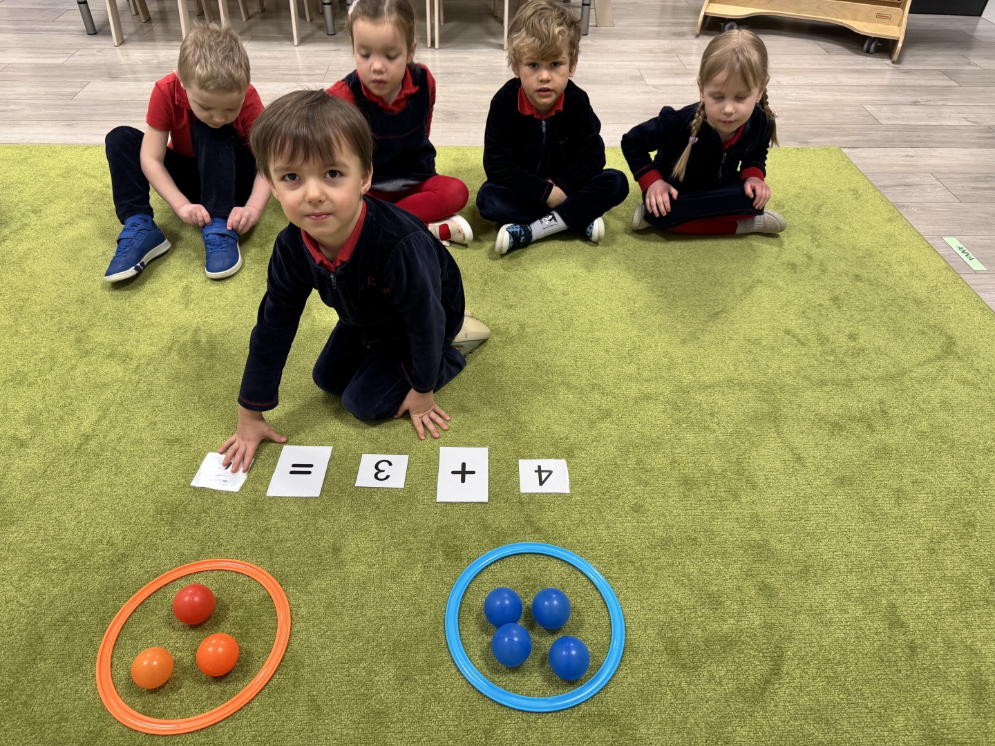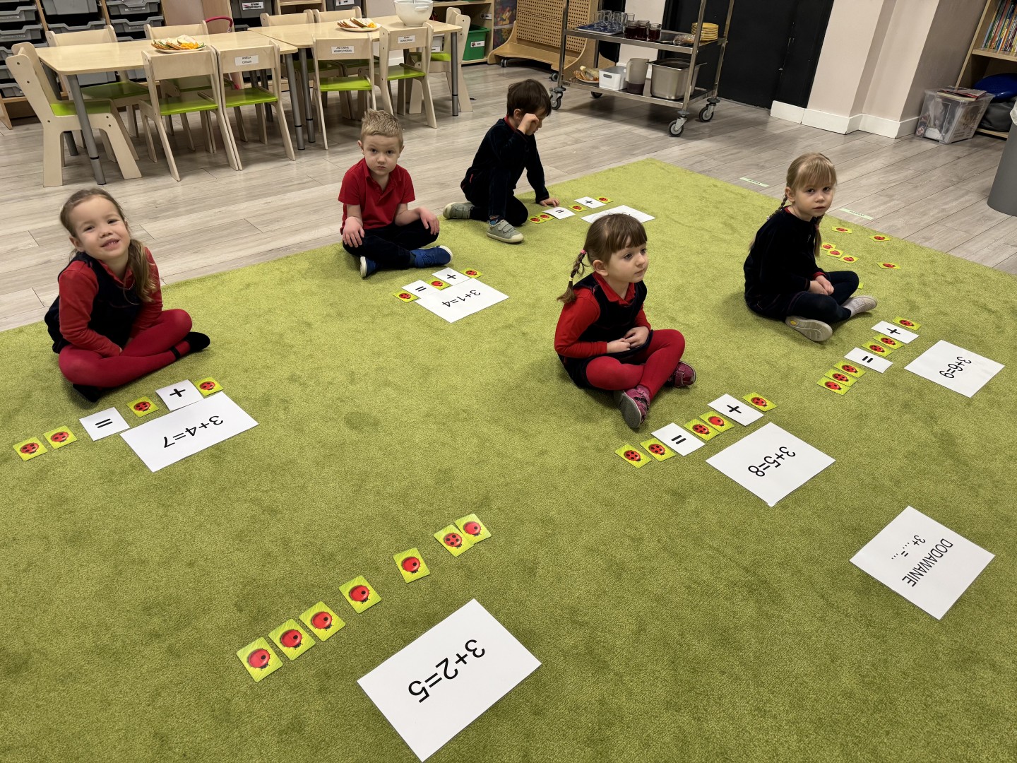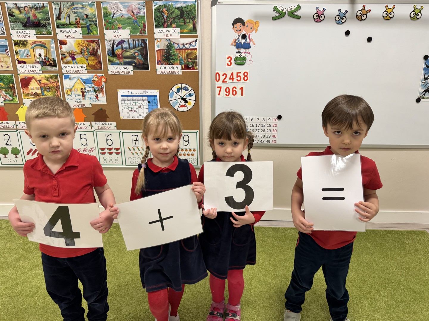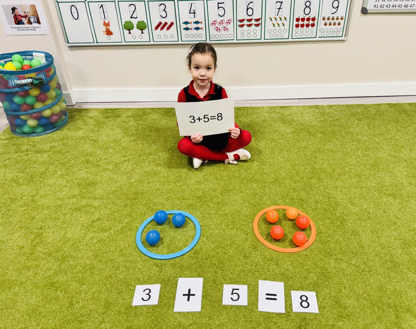 W trakcie zajęć dzieci utrwalały znajomość cyfr oraz poznawały znaczenie znaku dodawania. Ćwiczenia obejmowały wykonywanie działań z dominującą cyfrą 3, do której dzieci dodawały 1, 2 lub 3 — w zakresie liczbowym do 10.