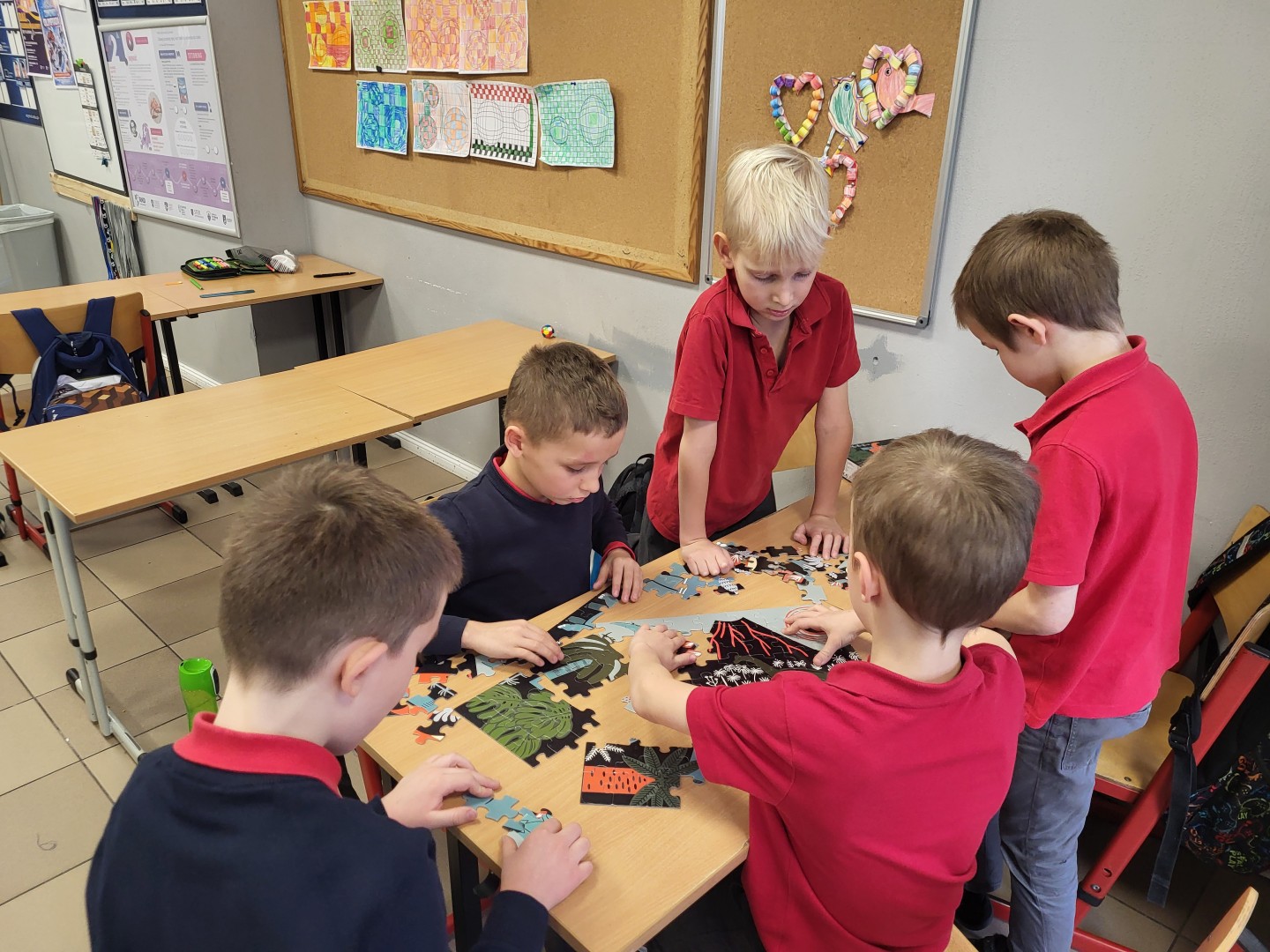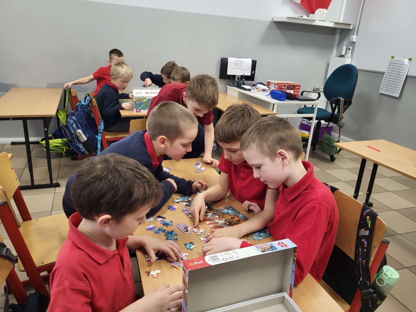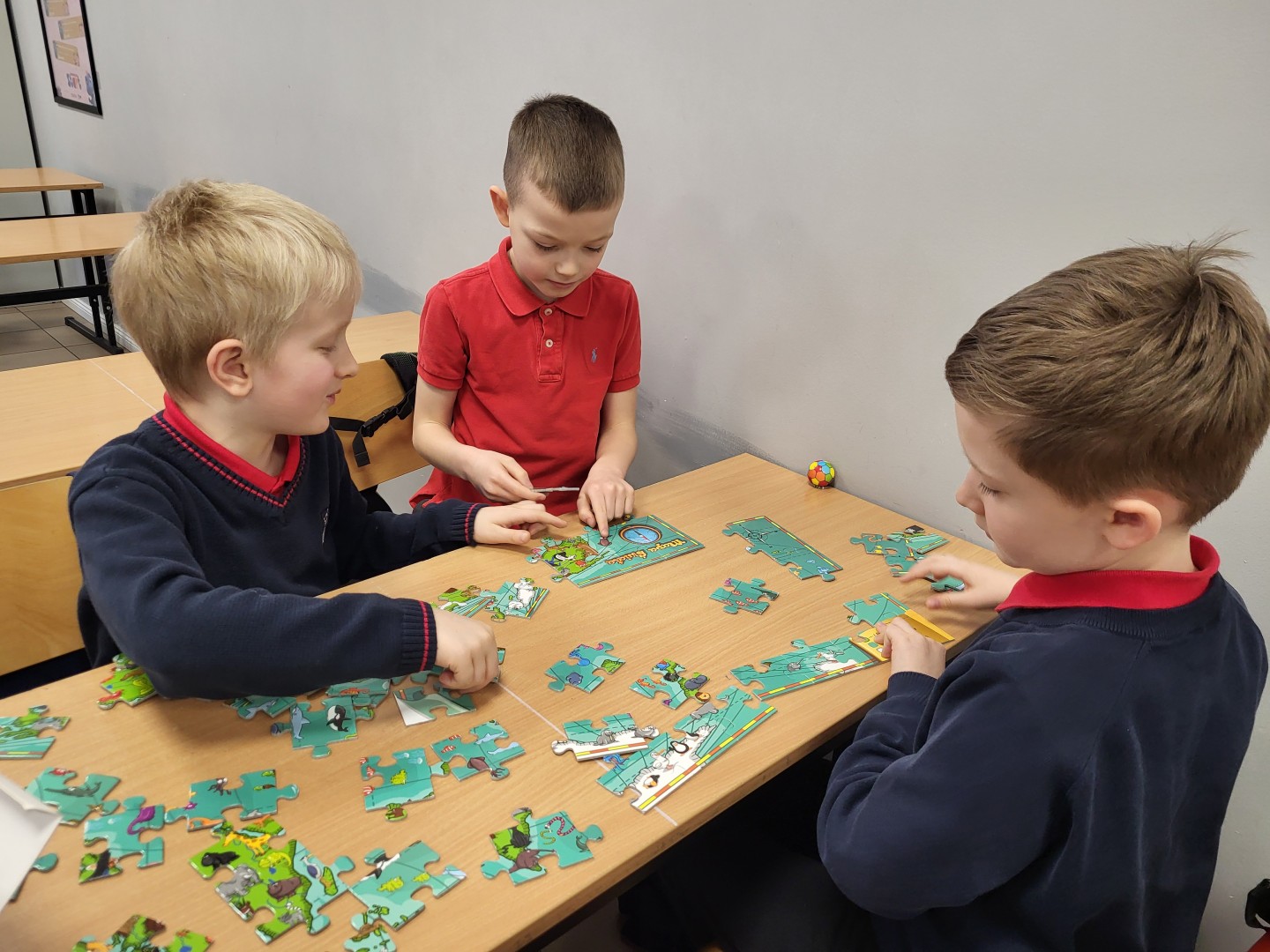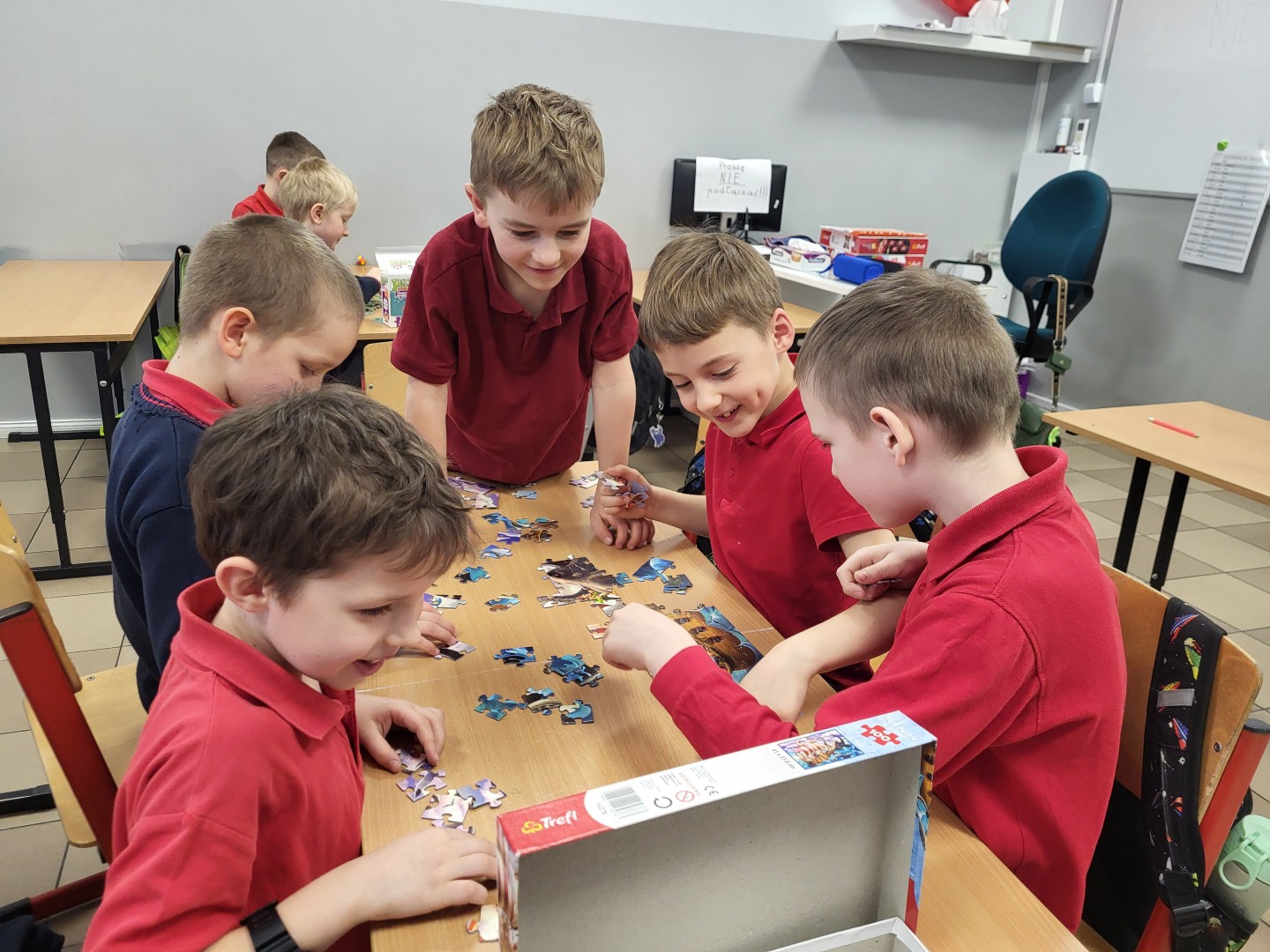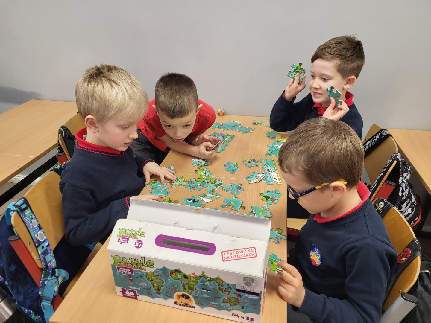 Stosowali różne strategie, aby stworzyć cały obrazek. Połączenie kilku osobnych fragmentów ułożonych przez każdego z chłopców nie zawsze było proste. Wywołało wiele emocji, z którymi trzeba było sobie poradzić. Niektórym trudno było zrezygnować ze swojego planu na rzecz grupy, a inni z ochotą pomagali innym grupom. Dla klasy było to wartościowe doświadczenie zakończone sukcesem w każdej grupce.