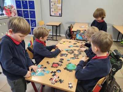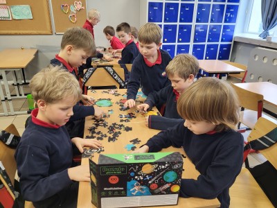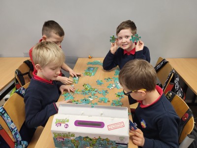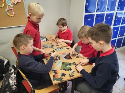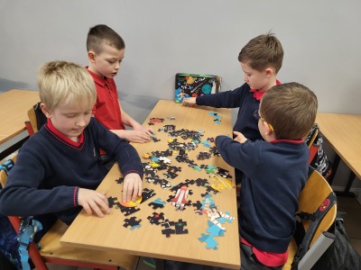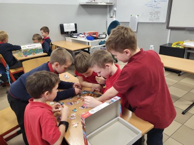 Na ostatnich muzycznych inspiracjach chłopcy z klasy 1A rozwijali współpracę, układając puzzle w małych grupach.