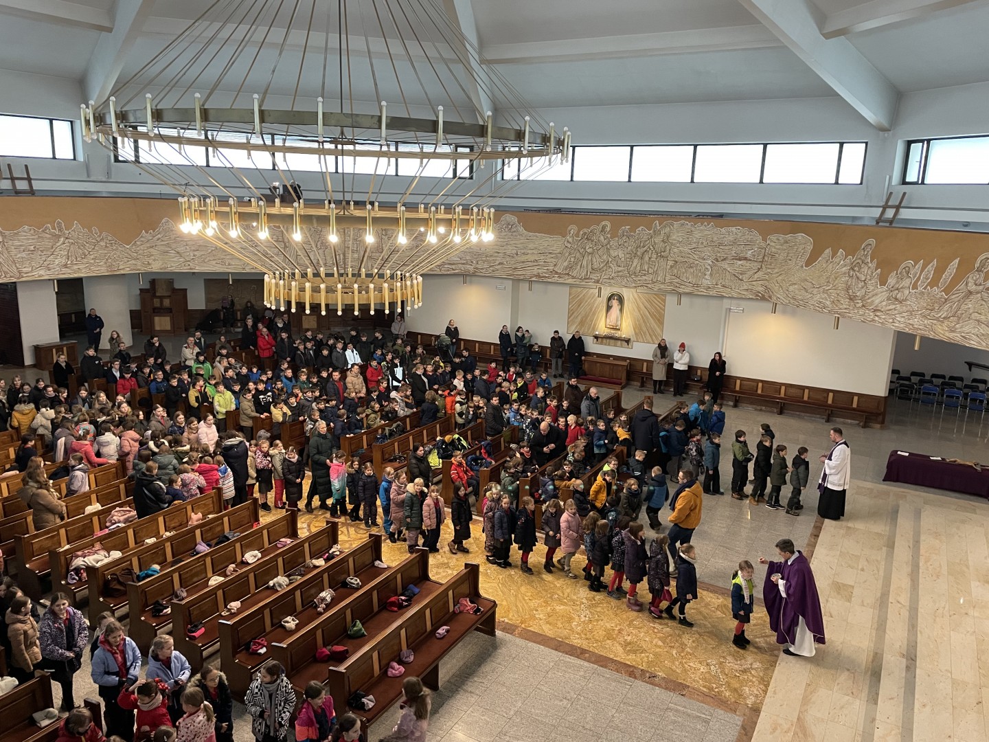 W środę o poranku zima postanowiła urządzić nam próbę generalną z wytrwałości. Śnieżna zawierucha, wiatr szczypiący w policzki i oblodzona droga niczym lodowisko. A jednak… cała szkoła wyruszyła dzielnie na Mszę Świętą rozpoczynającą Wielki Post.
