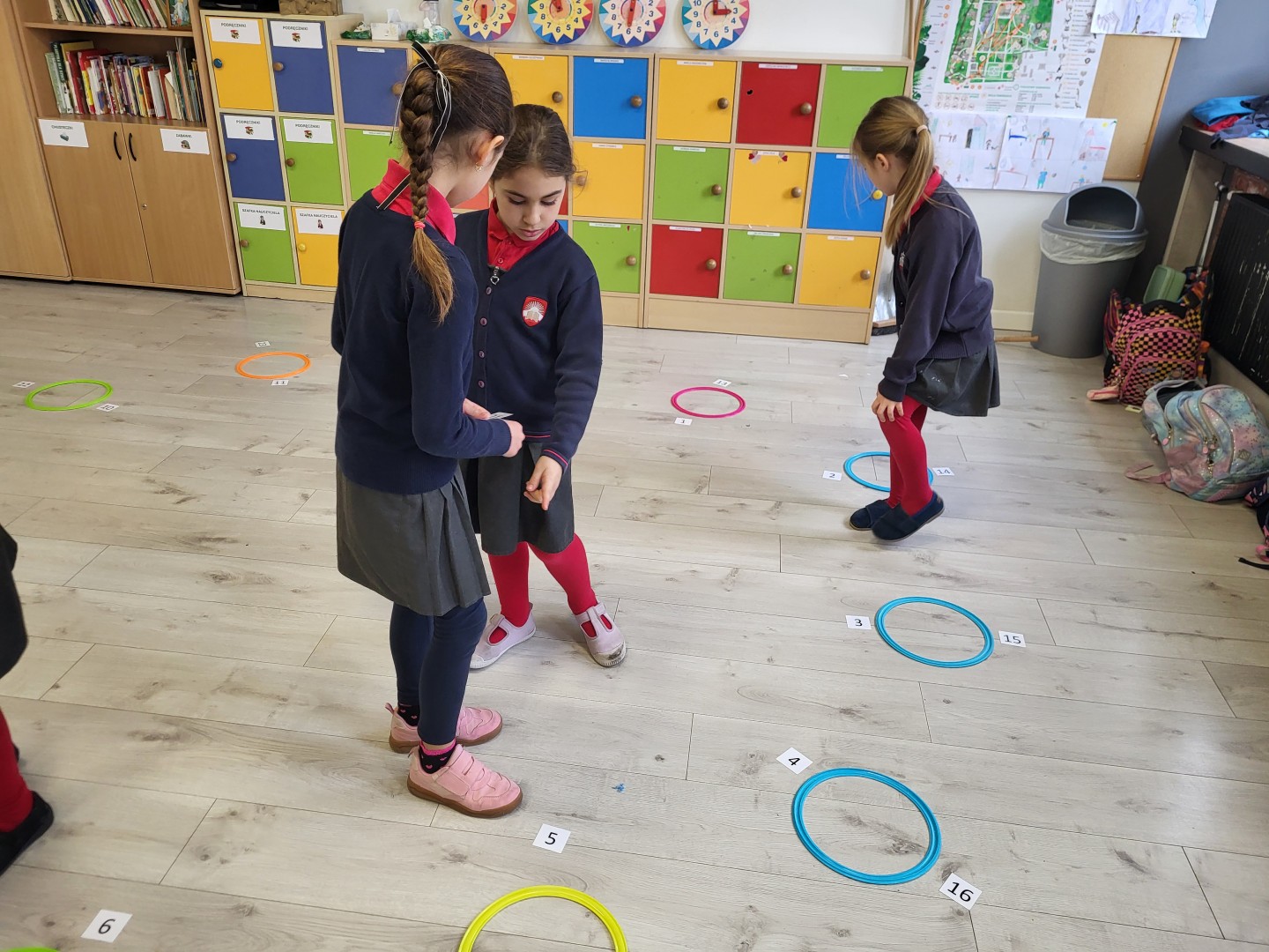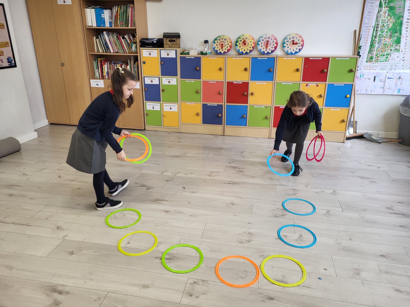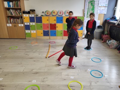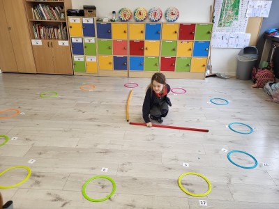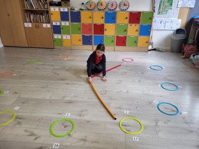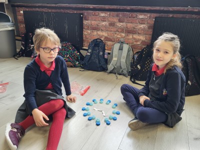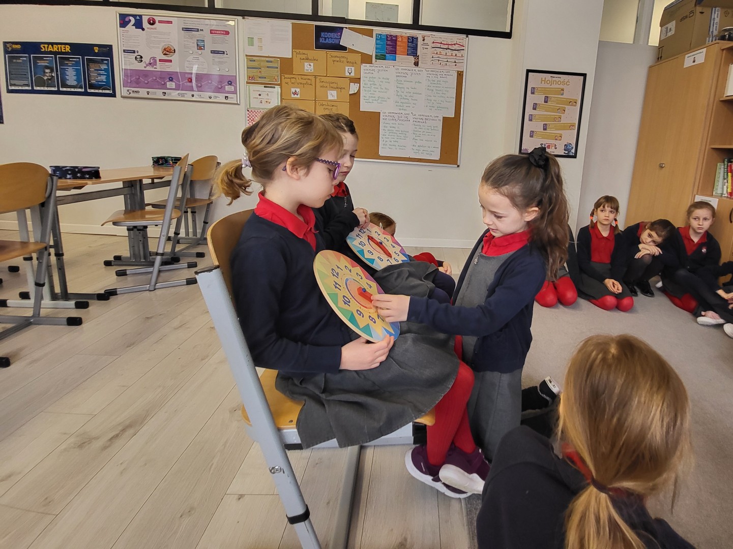 Zaczynając od najłatwiejszych zadań w formie odczytywania pełnych godzin, przechodzą na coraz trudniejsze poziomy. Oczywiście, żeby ćwiczyć, trzeba mieć na czym. Dziewczynki układały tarcze zegarów w różnych rozmiarach, zaprezentowały też zegarki przyniesione z domu. Tworzyły również plan dnia, wymyślając histoyryjkę obrazkową z wykorzystaniem wylosowanych godzin.