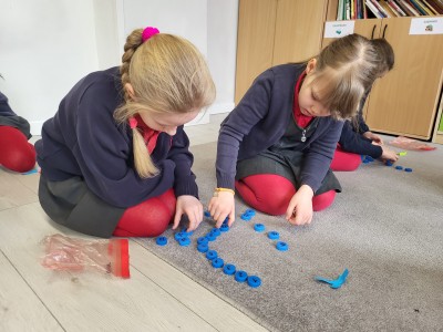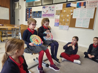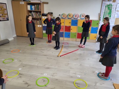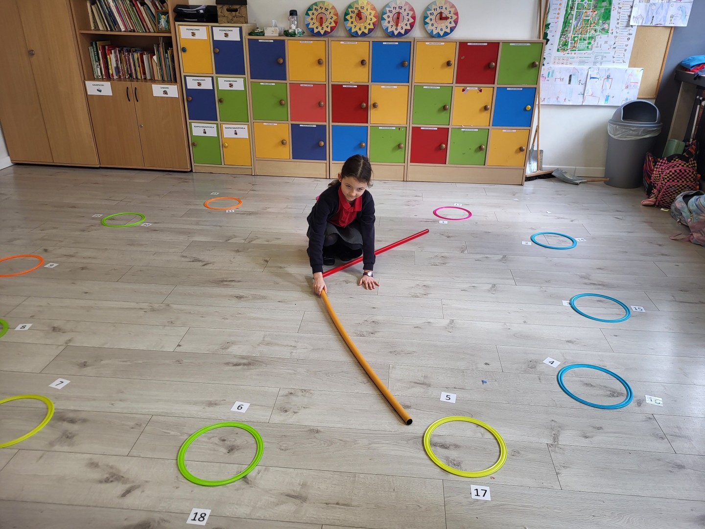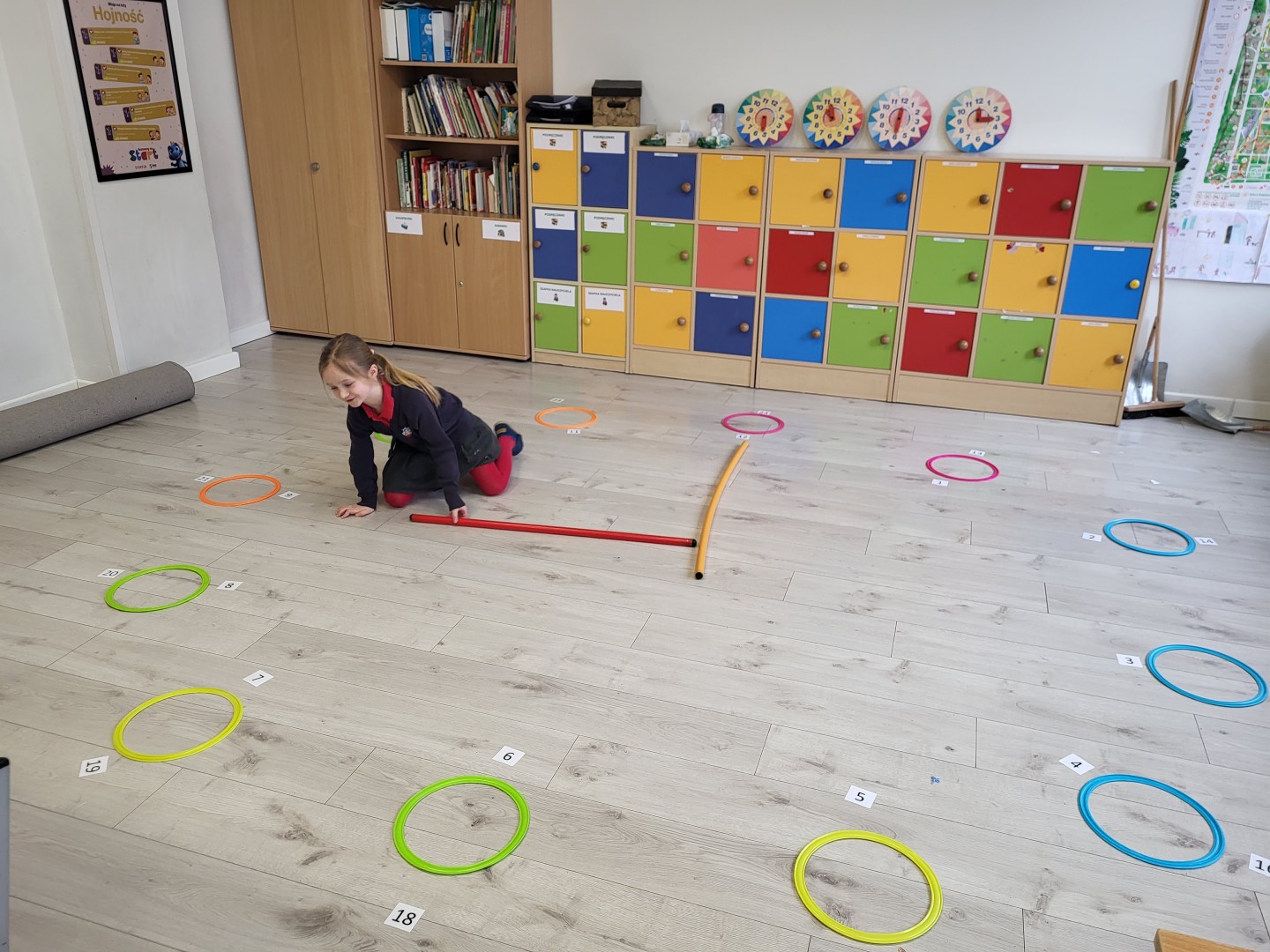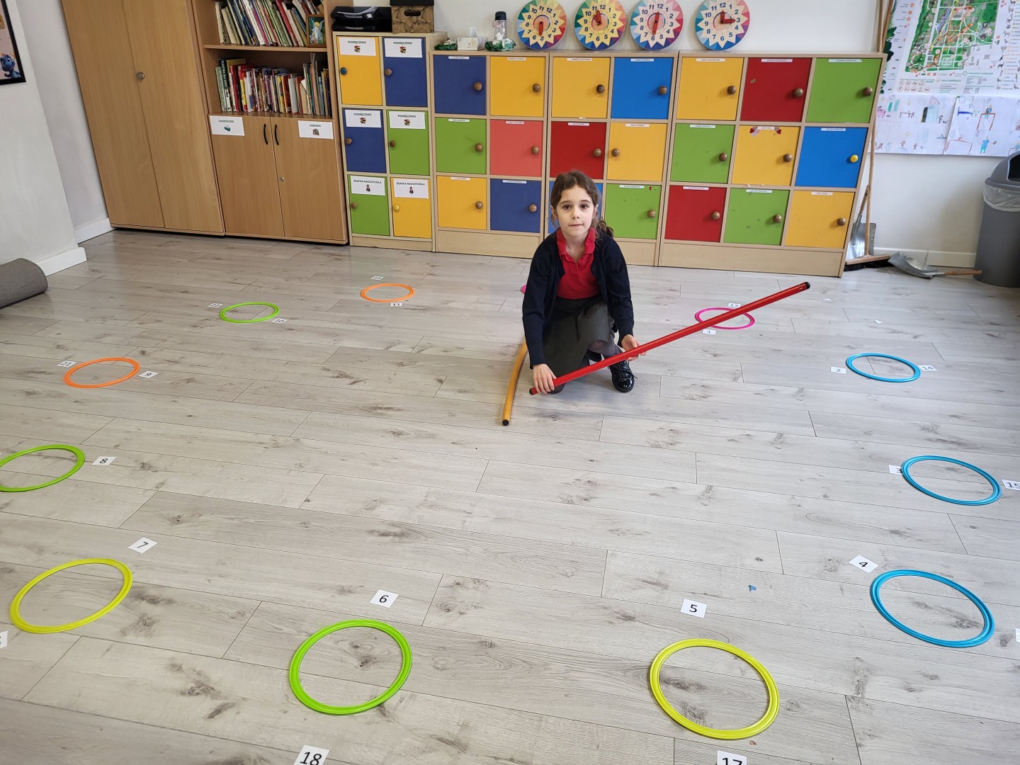 Zaczynając od najłatwiejszych zadań w formie odczytywania pełnych godzin, przechodzą na coraz trudniejsze poziomy. Oczywiście, żeby ćwiczyć, trzeba mieć na czym. Dziewczynki układały tarcze zegarów w różnych rozmiarach, zaprezentowały też zegarki przyniesione z domu. Tworzyły również plan dnia, wymyślając histoyryjkę obrazkową z wykorzystaniem wylosowanych godzin.
