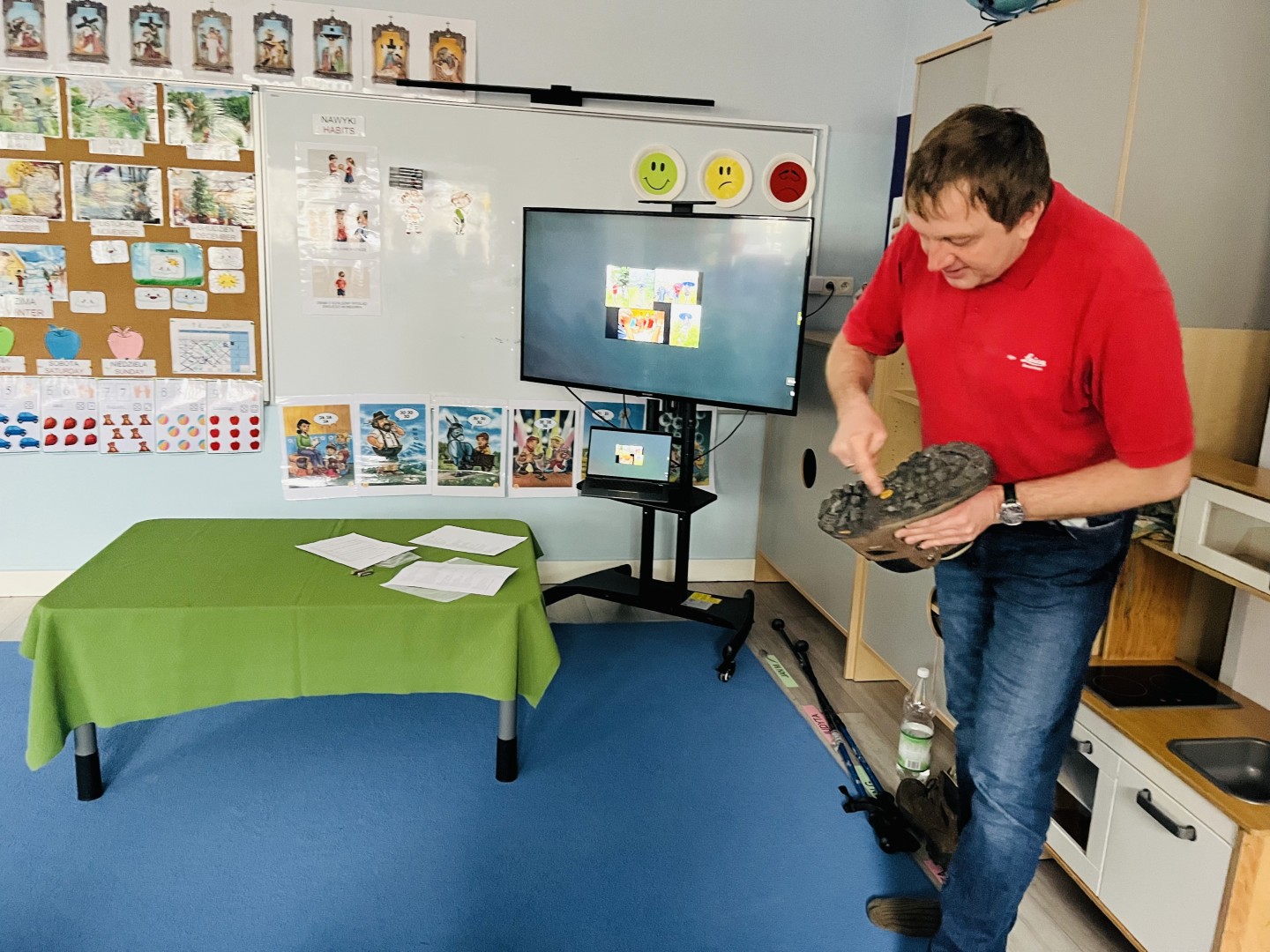 Pan Grzegorz podzielił się również anegdotami ze swoich wypraw – opowiadał o zmiennej pogodzie w górach, pięknych widokach oraz satysfakcji, jaka towarzyszy zdobyciu szczytu. Zaprezentował dzieciom kijki trekkingowe i wyjaśnił, do czego służą oraz jak pomagają podczas wędrówek.
